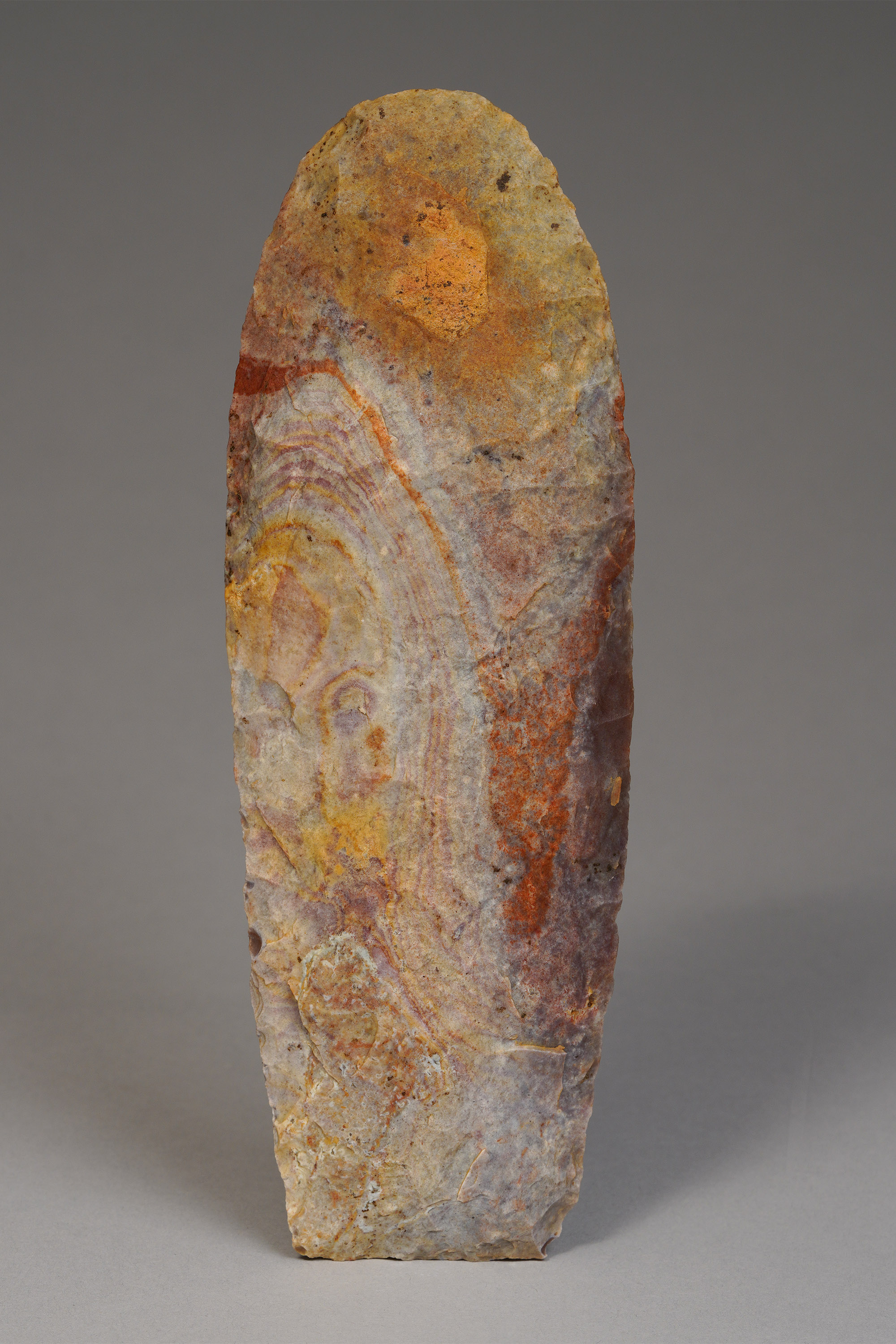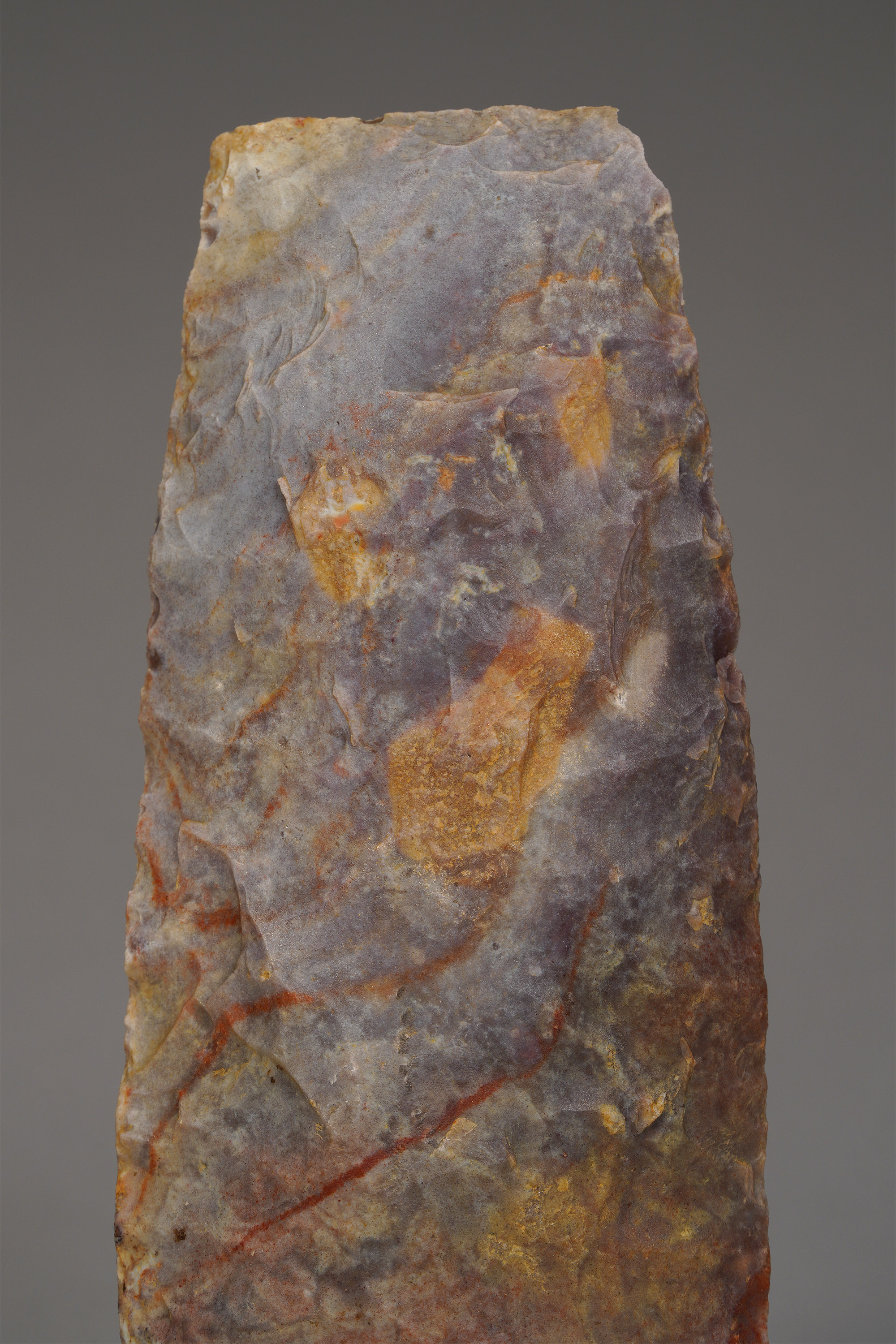 Axe blades such as this were made out of exceptionally high-quality flintstone / agate and belong to the Tenerean neolithic complex in West Africa. They are around 6000 years old. They were produced by specialized flint knappers who also made arrowheads and other tools. Most of them were found in Niger, but there were ateliers in (modern-day) neighboring countries as well. The axe blades had different shapes based on their function / purpose, and when in use they were polished and sharpened along the outer edge. Gradually the axe blades became shorter and were resharpened until they were too small to work with. Most of the axe blades found are in the first stage, simply knapped and ‘fresh’ (found in close proximity to the ateliers). When used and re-sharpened they were dispersed around a wide region, and are much more difficult to find today (Pers. communication, Michel Van Den Dries, 2025).
