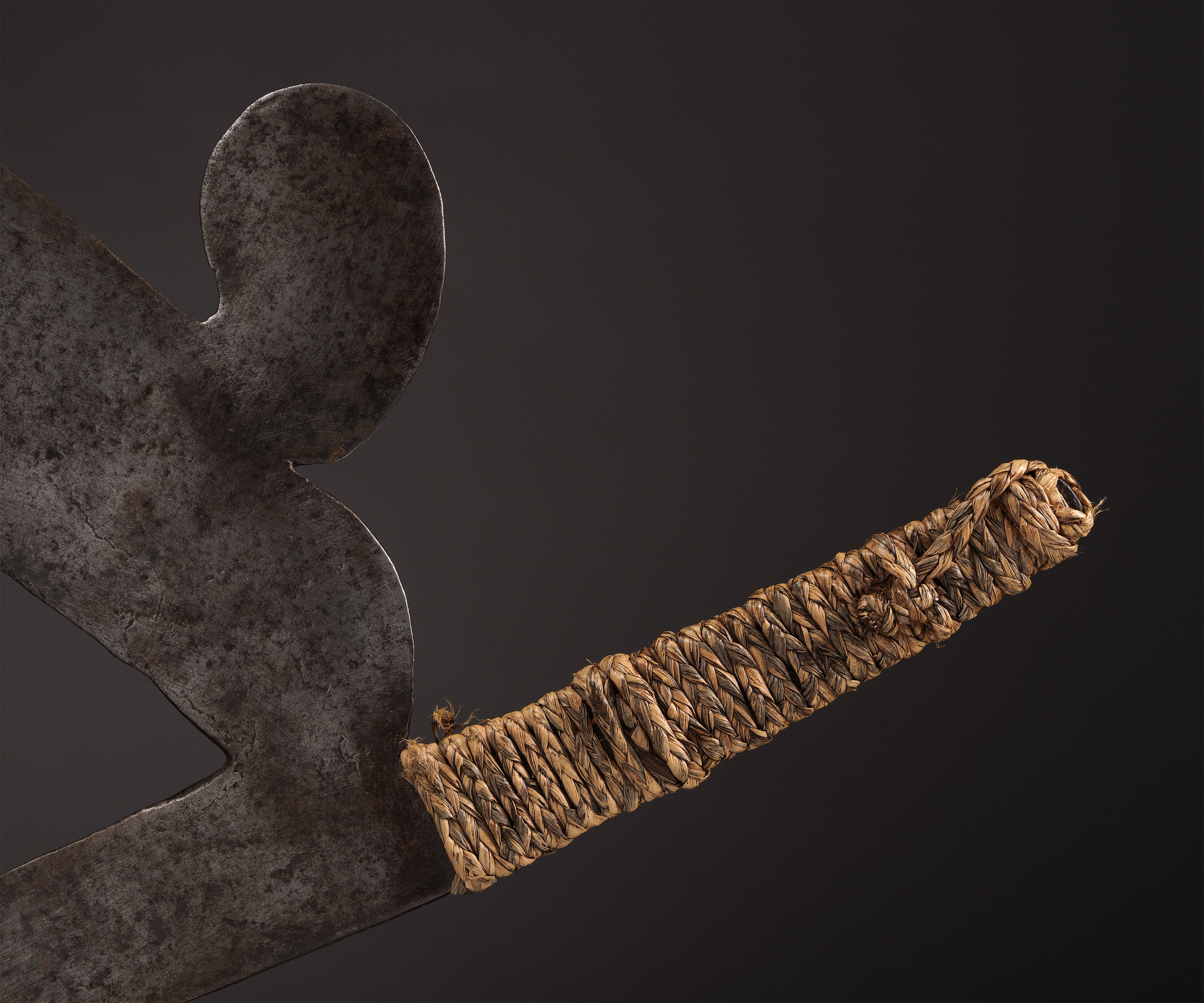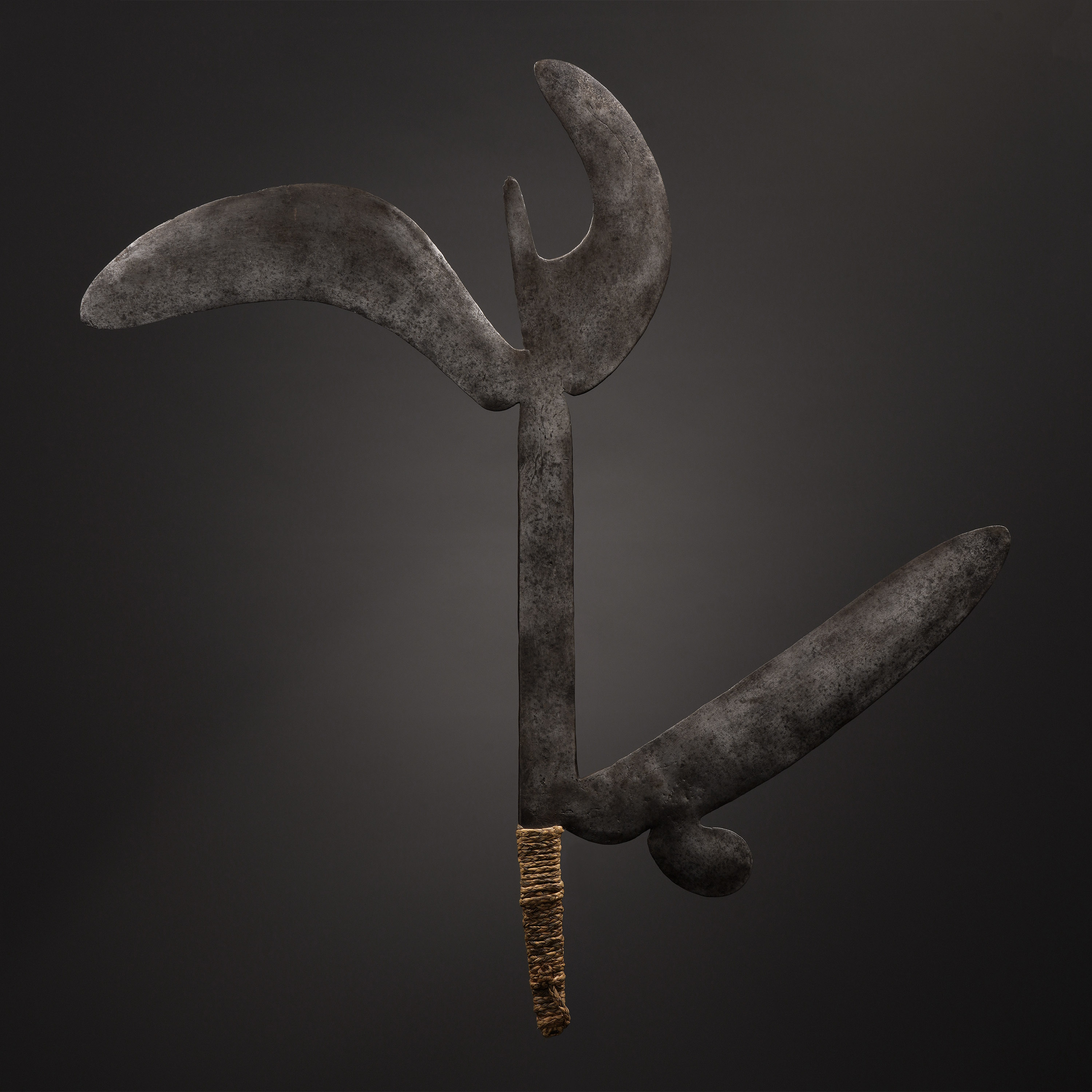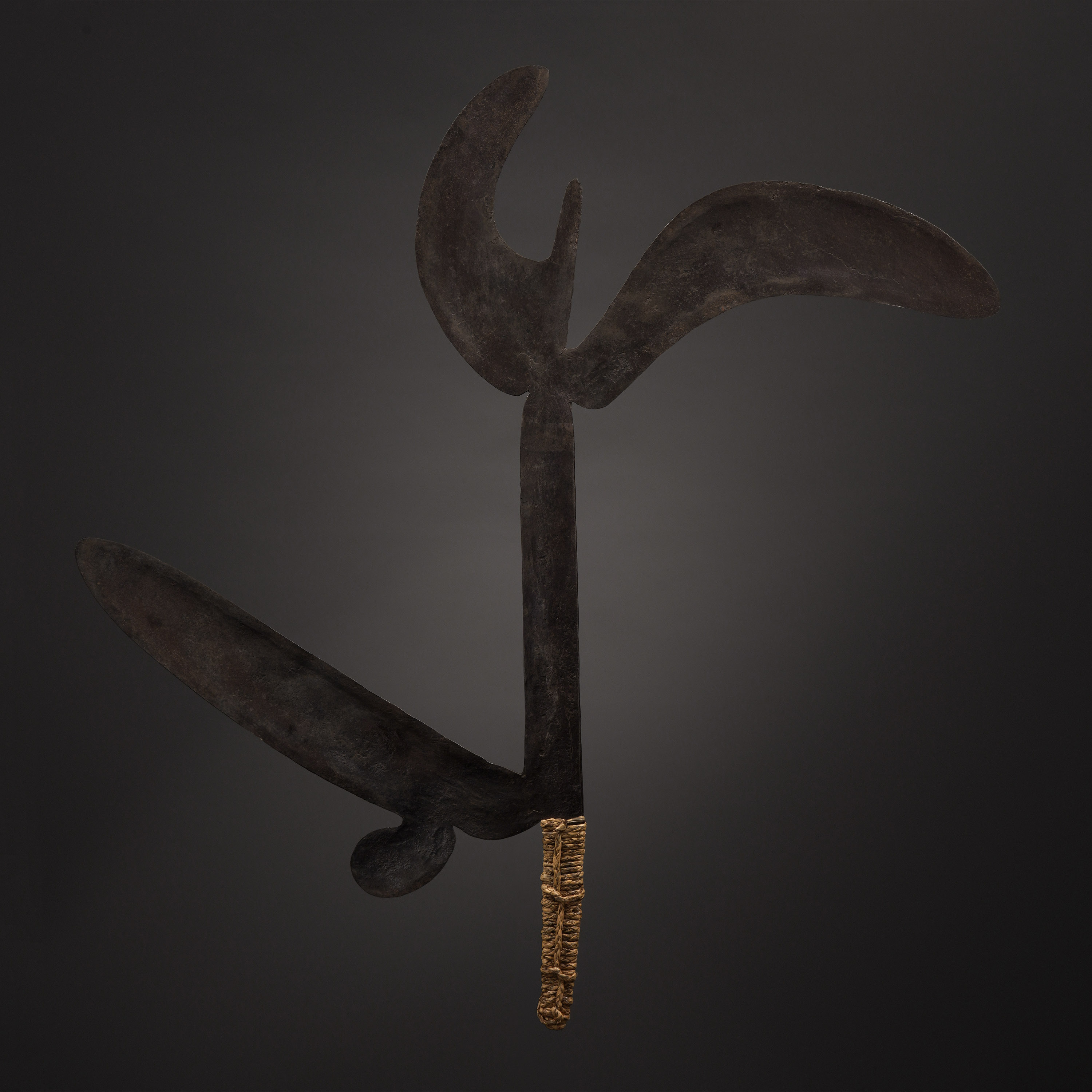 While historically used as a weapon amongst the sophisticated armies of the Zande and Nsakara, this type of throwing knife, known as kpinga, became obsolete in the 20th century, and became more an object of symbolism than function. In particular, they were used in ceremonies honoring the ancestors, wielded during funerals of powerful men, and even thrown onto or buried in gravesites. Potent symbols of power, they were considered to be the prerogative of nobility, and were often hoarded and protected in storehouses; only select men had the privilege of keeping a kpinga in his home (Westerdijk, The African Throwing Knife, 1988).