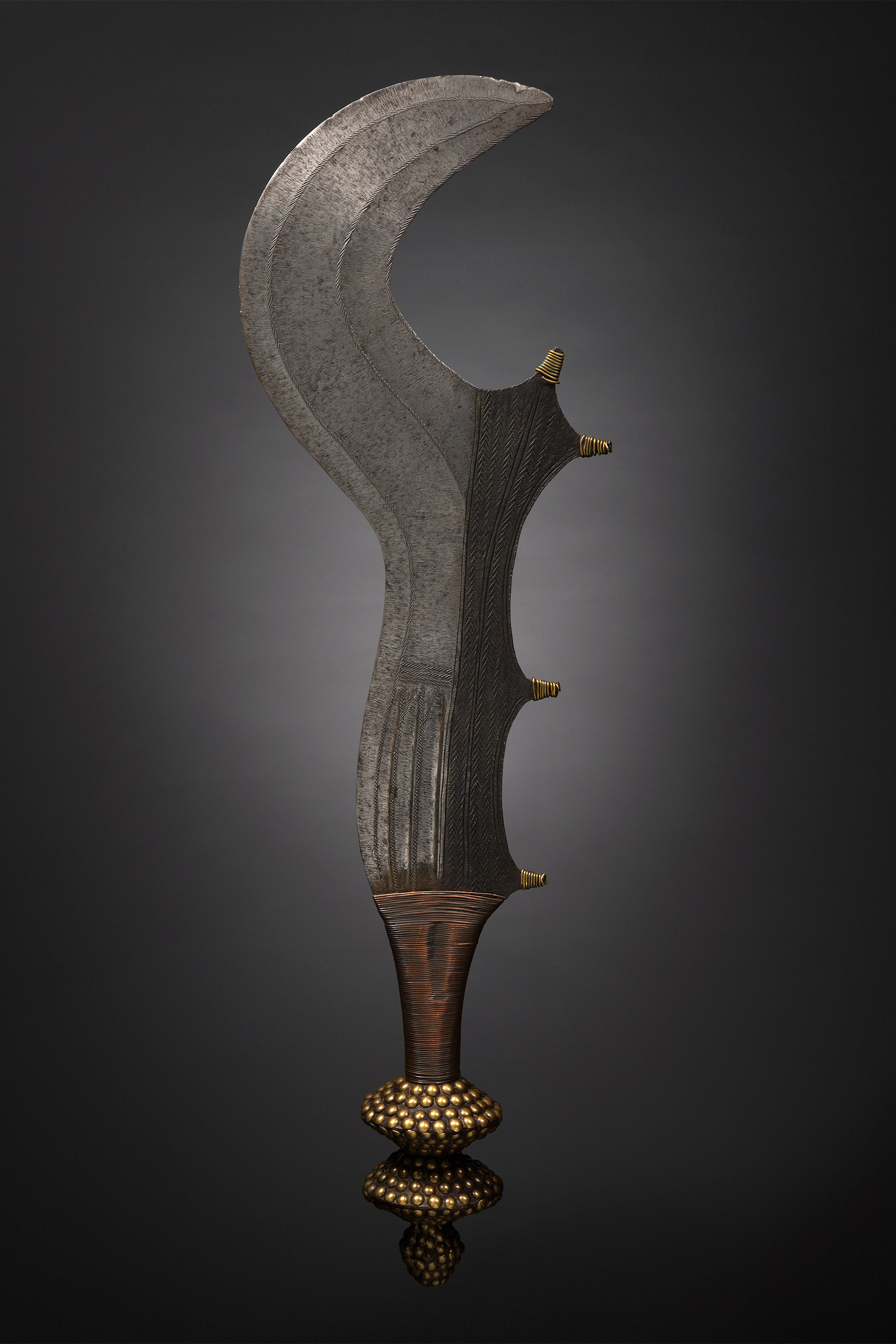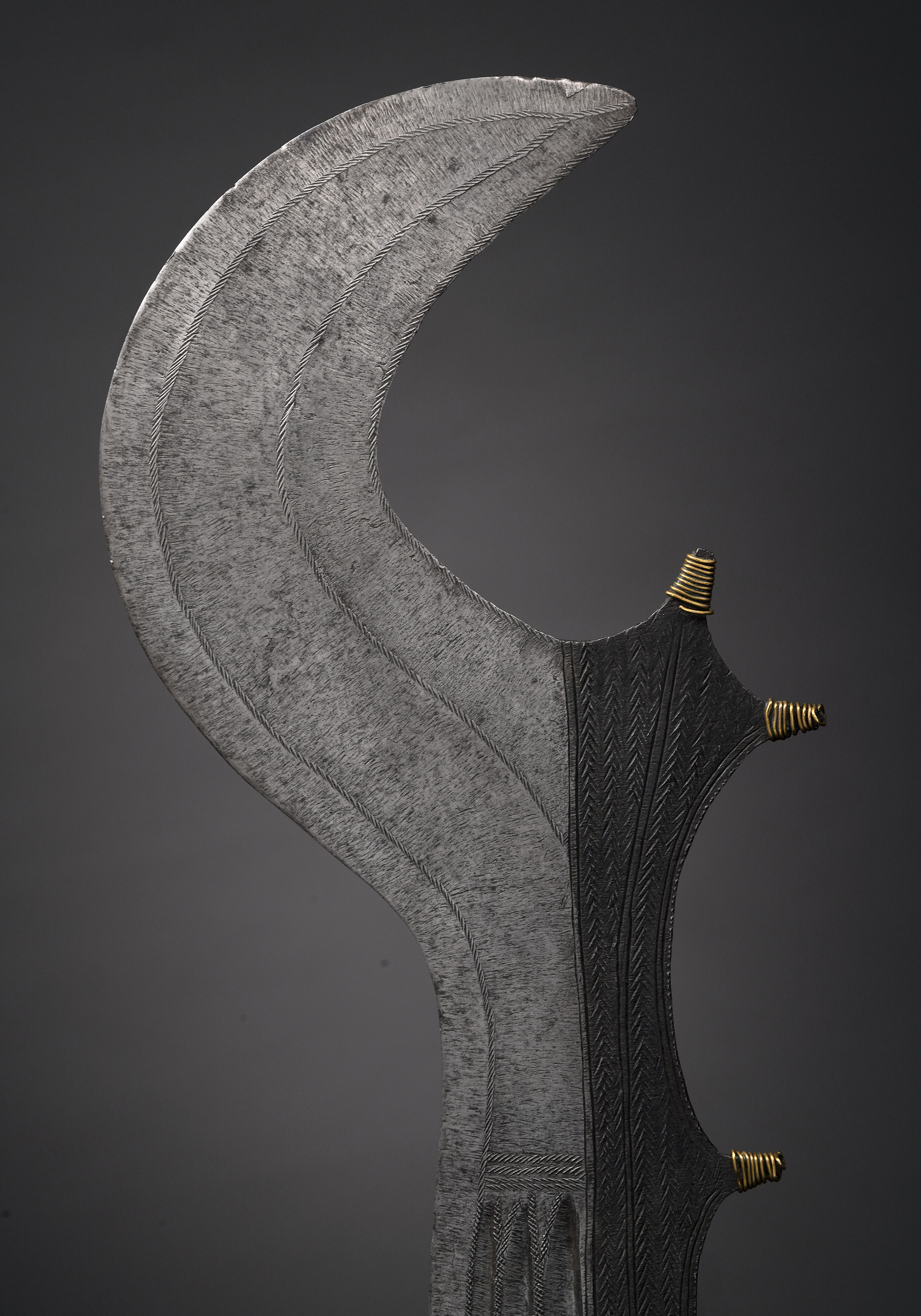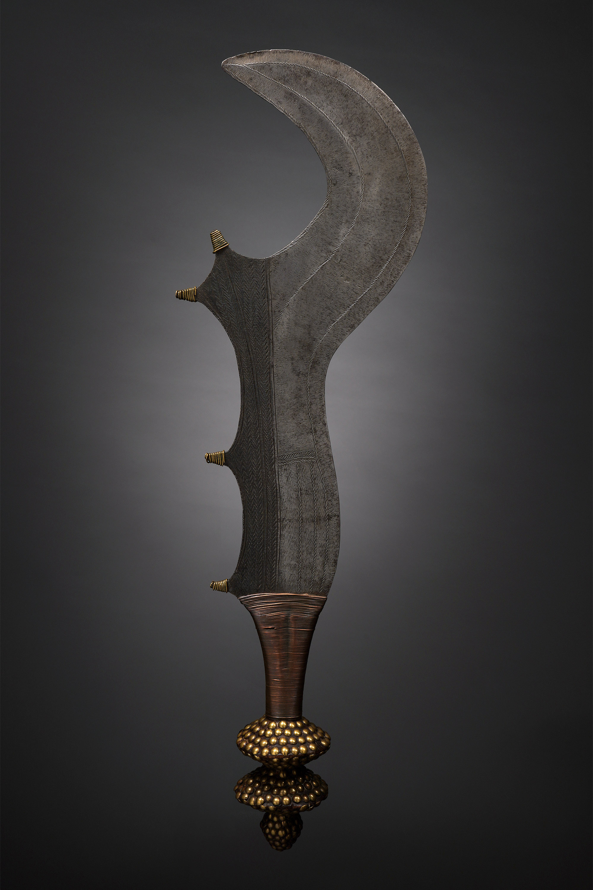 Manufactured by the Ngombe ("men of the forest"), the Ngulu is a heavily decorated asymmetrical iron blade with an embellished wooden handle that is exuberant and beautiful. Gosseau asserts these blades were insignia of prestige, ceremonial dance implements, and valuables used for exchange (currency).