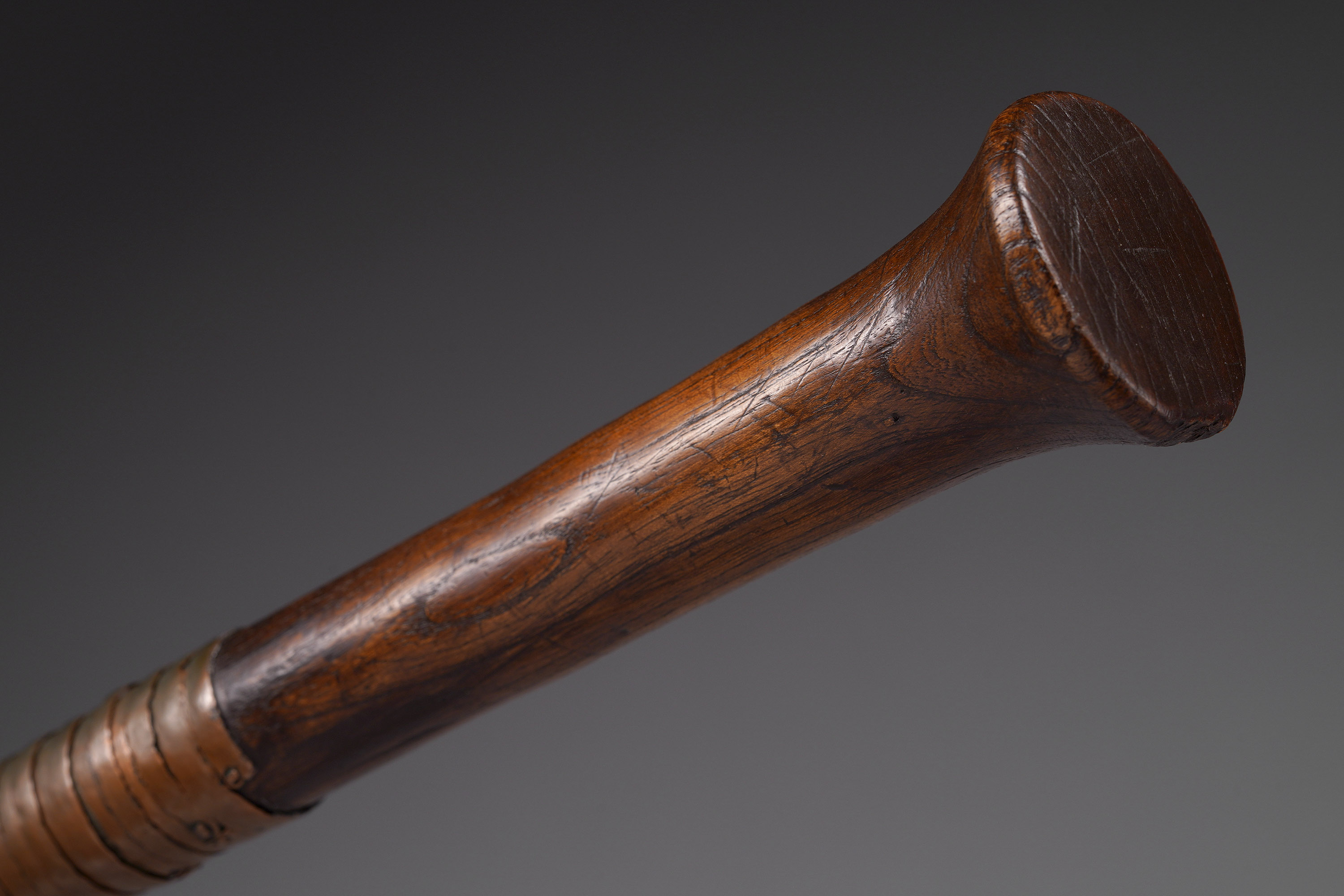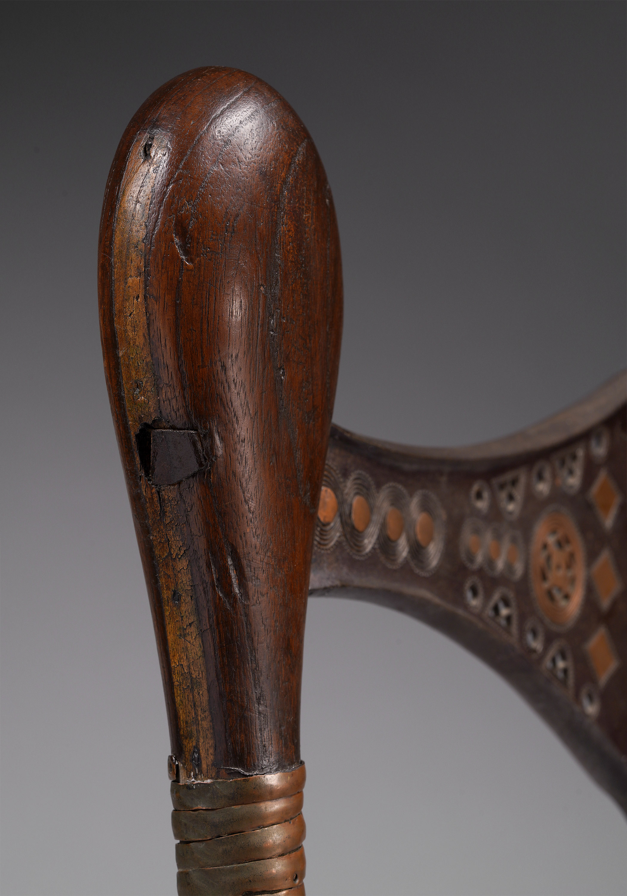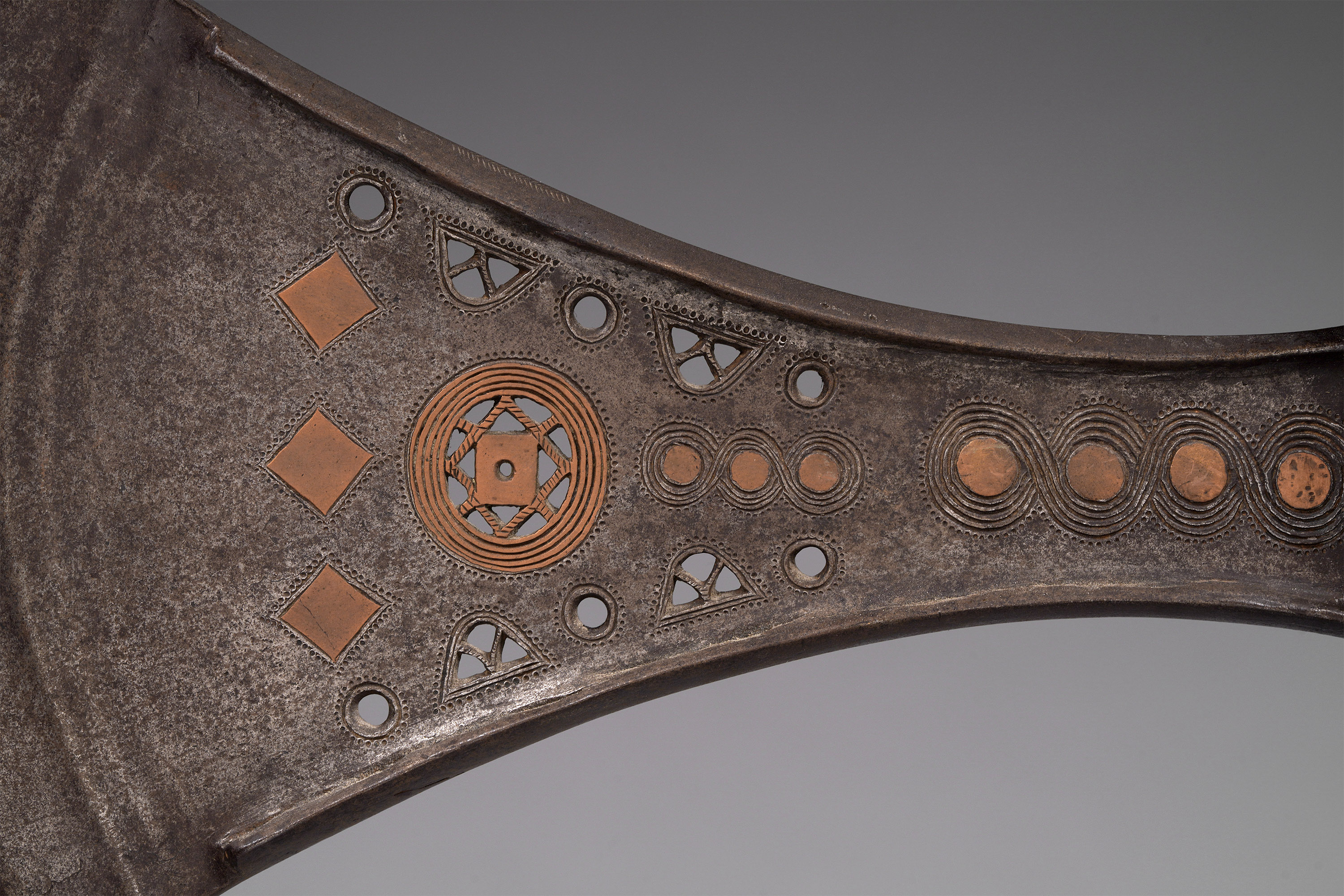 This type of axe, known as kilonda, was mainly produced by the Songye, but also by the Nsapo and Luba. Though their shape was largely inspired by functional weapons, they were strictly symbols of prestige and pageantry. Songye blacksmiths are widely respected as the greatest masters of the forge, and used both hot and cold forging techniques to embellish these blades (Elsen, De fer et de fierté, 2003; Lefebvre & De Waele, Kilonda, 2011; Neyt, Songye, 2004).