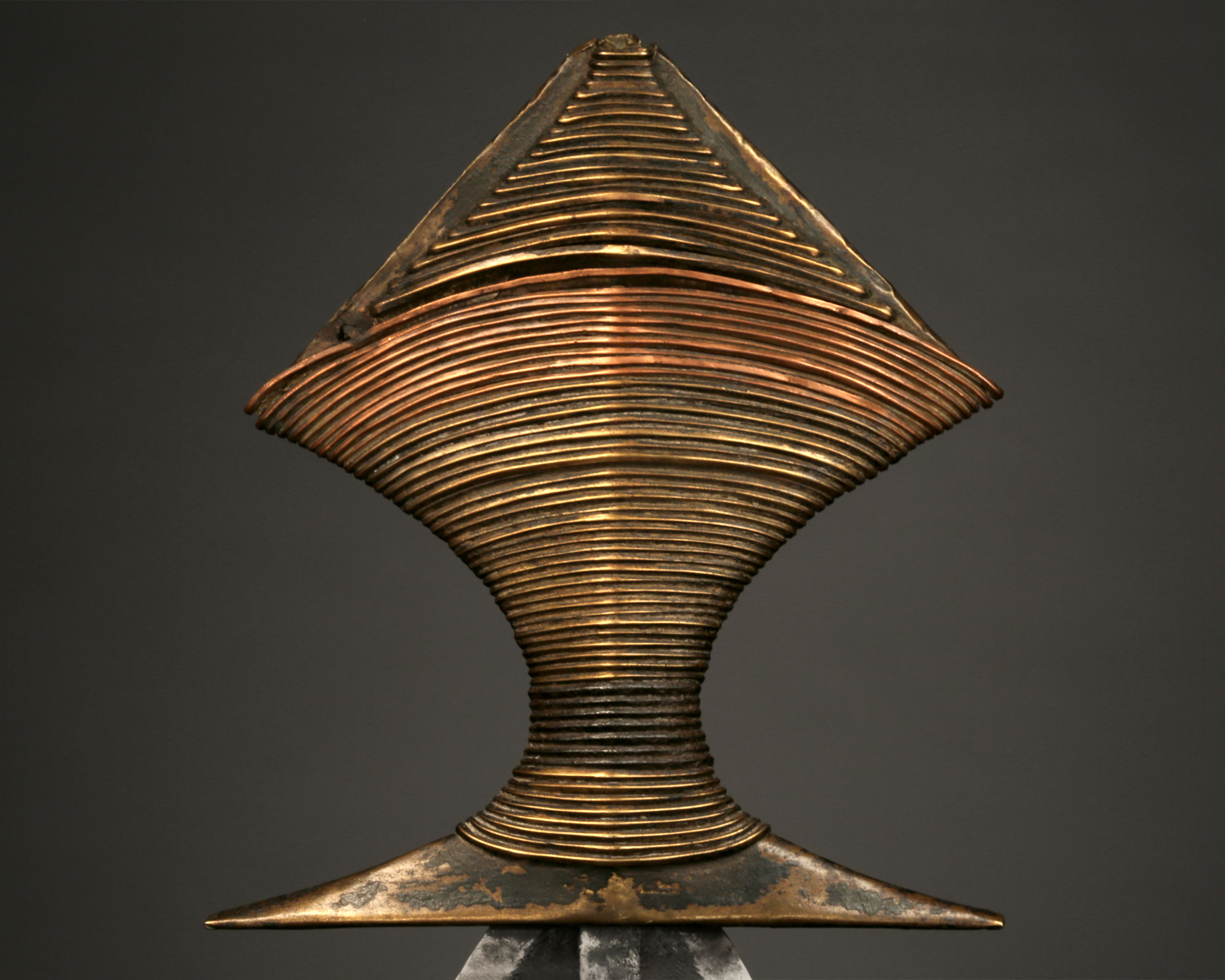 This symmetrical short sword was displayed as a symbol of prestige among a number of tribal groups who belong to the Gbaya family. Most often attributed to the Lobala, it was also the prerogative of a number of smaller tribes who were collectively known as Ngiri, and included the Mbondzo, Mondzombo, Ngbaka, and Mbanza.