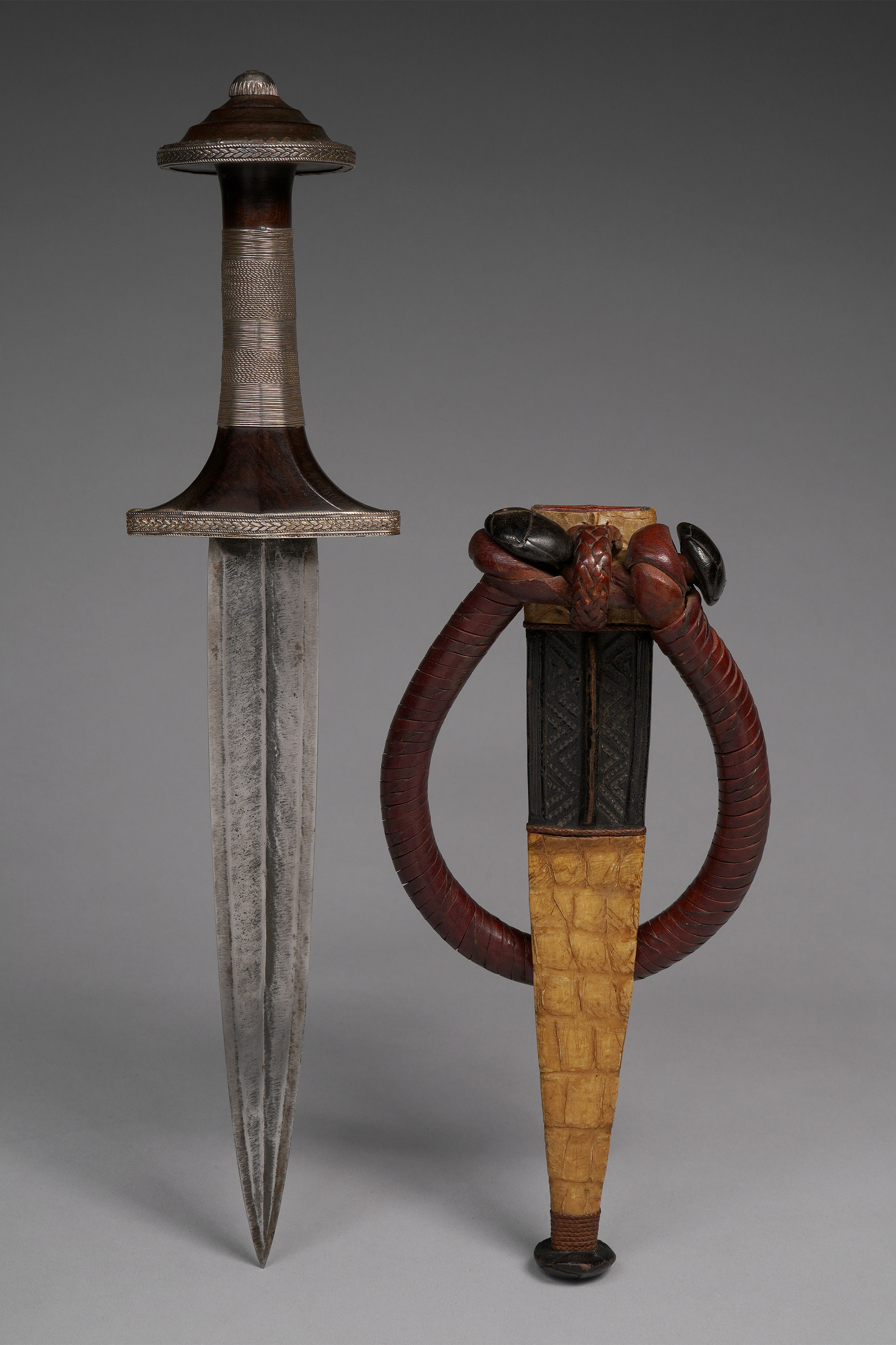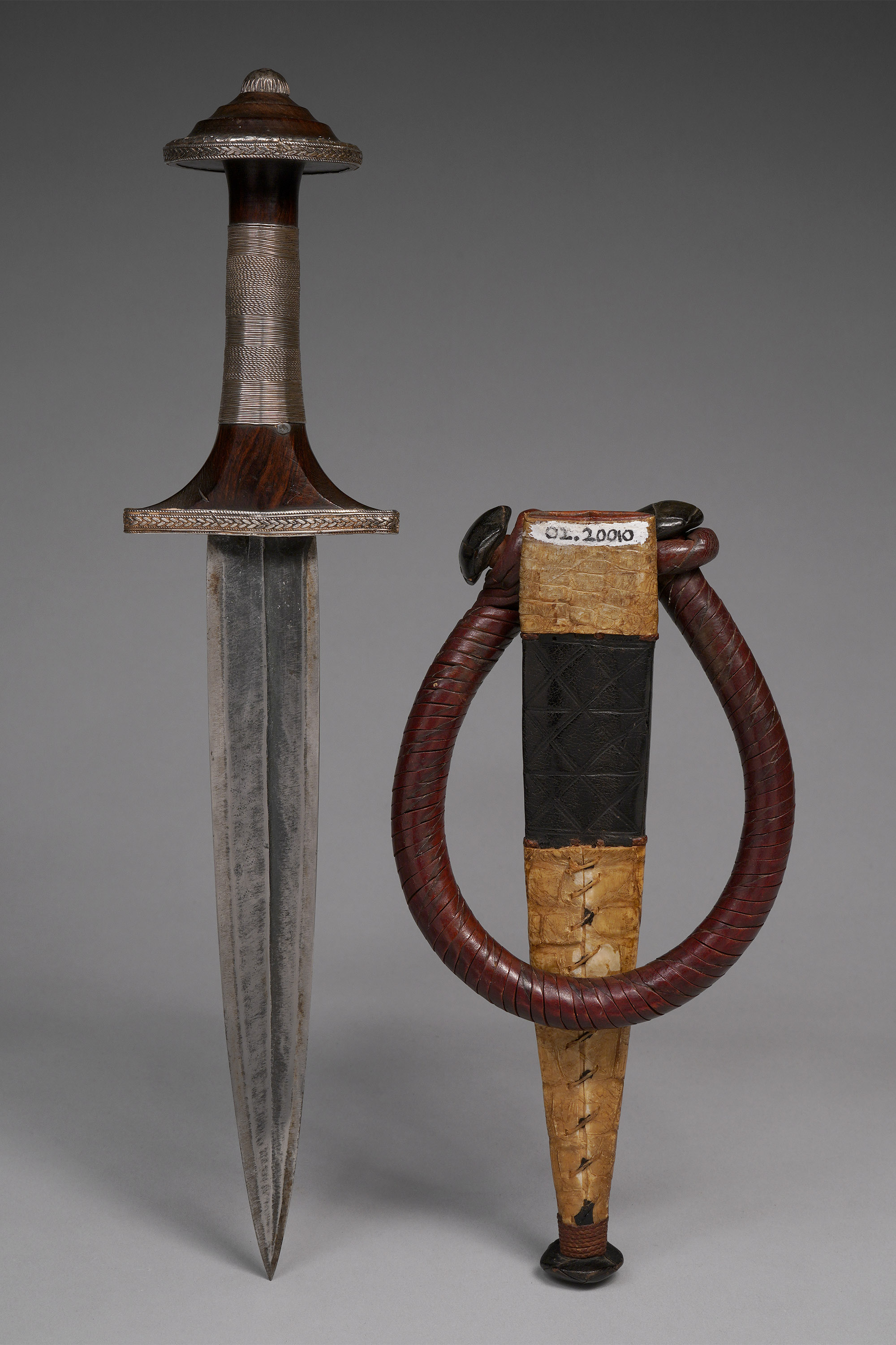 The knife was worn on the outside of the upper arm, handle pointing downwards, and grabbed with the opposite hand (Fischer & Zirngibl, Afrikanische Waffen, 1978; Sparks, “Arab Knife,” Southern Sudan Project, 2005; Westerdijk, African Metal Implements, 1984; Zirngibl & Kubetz, Panga Na Visu, 2009).