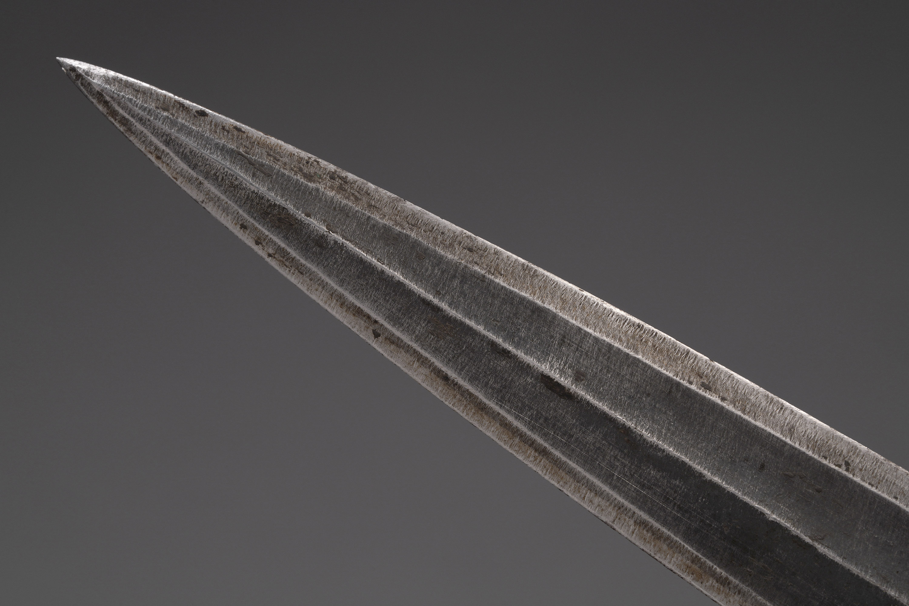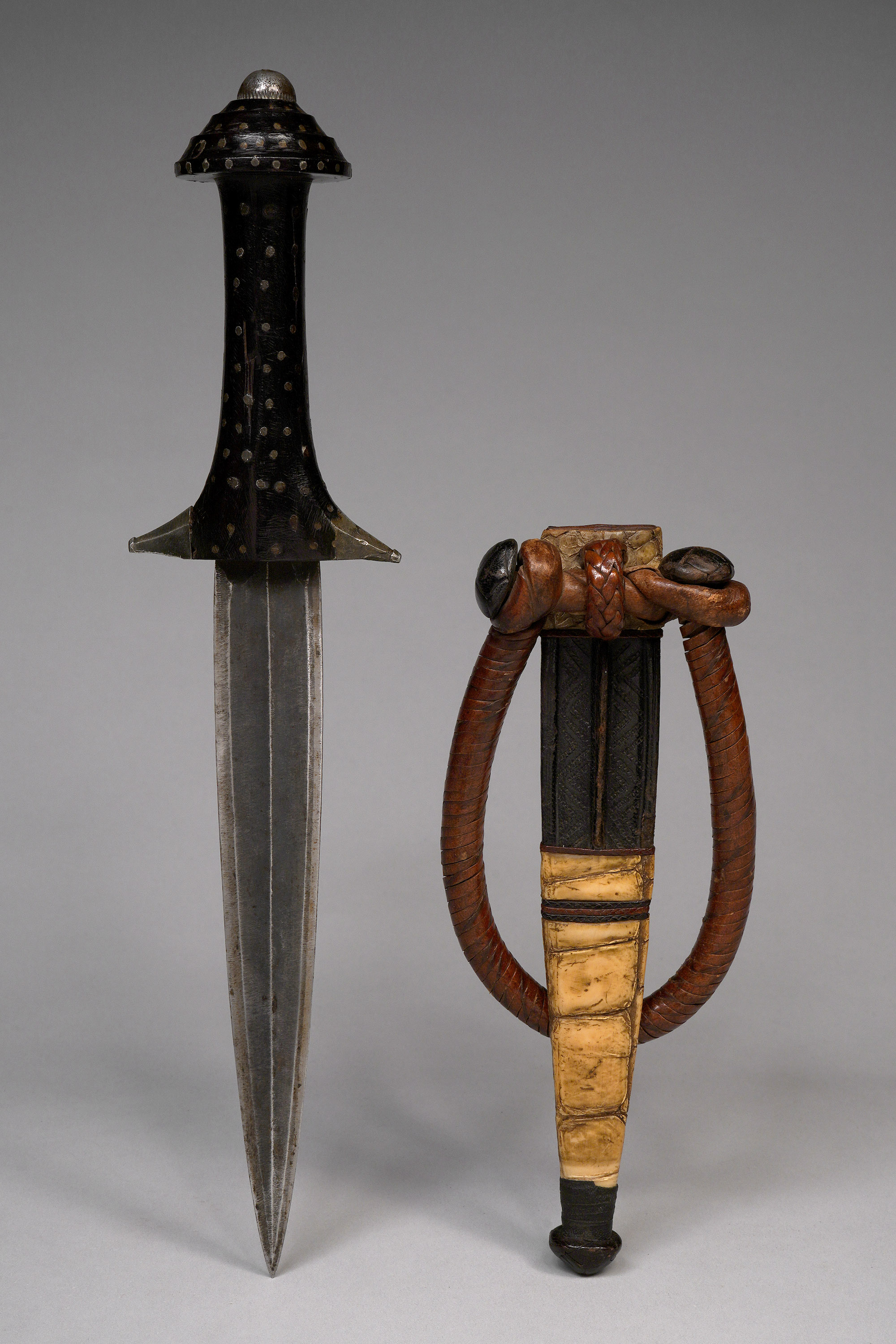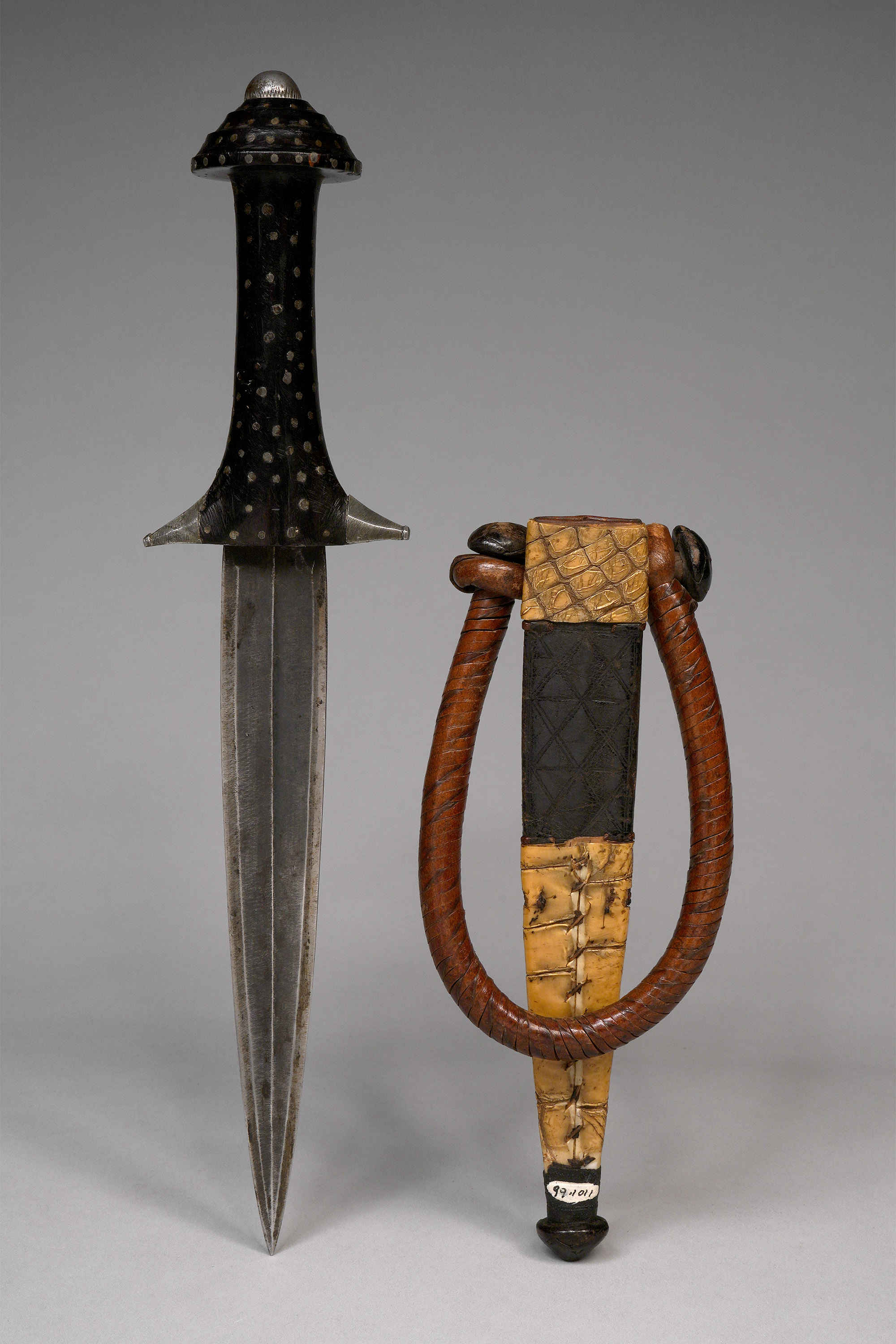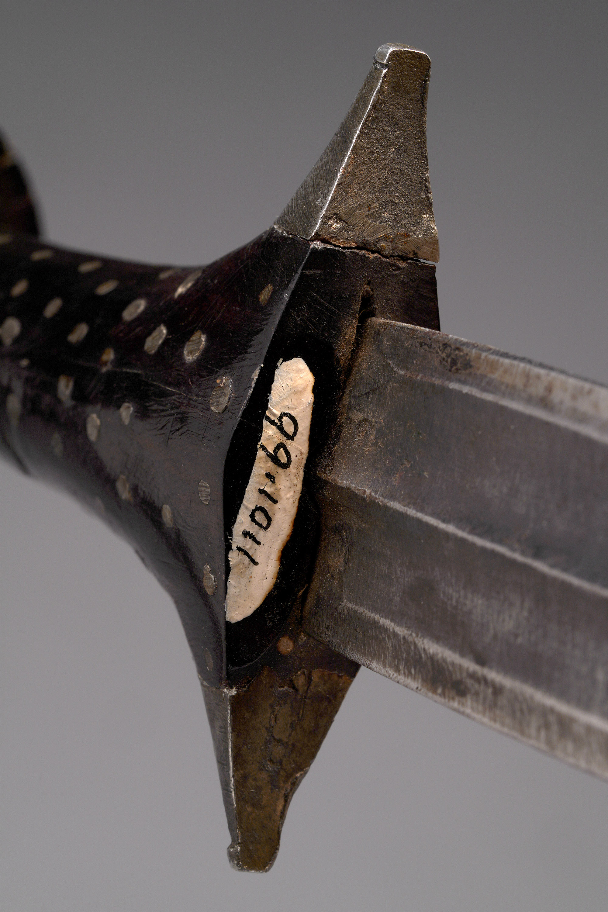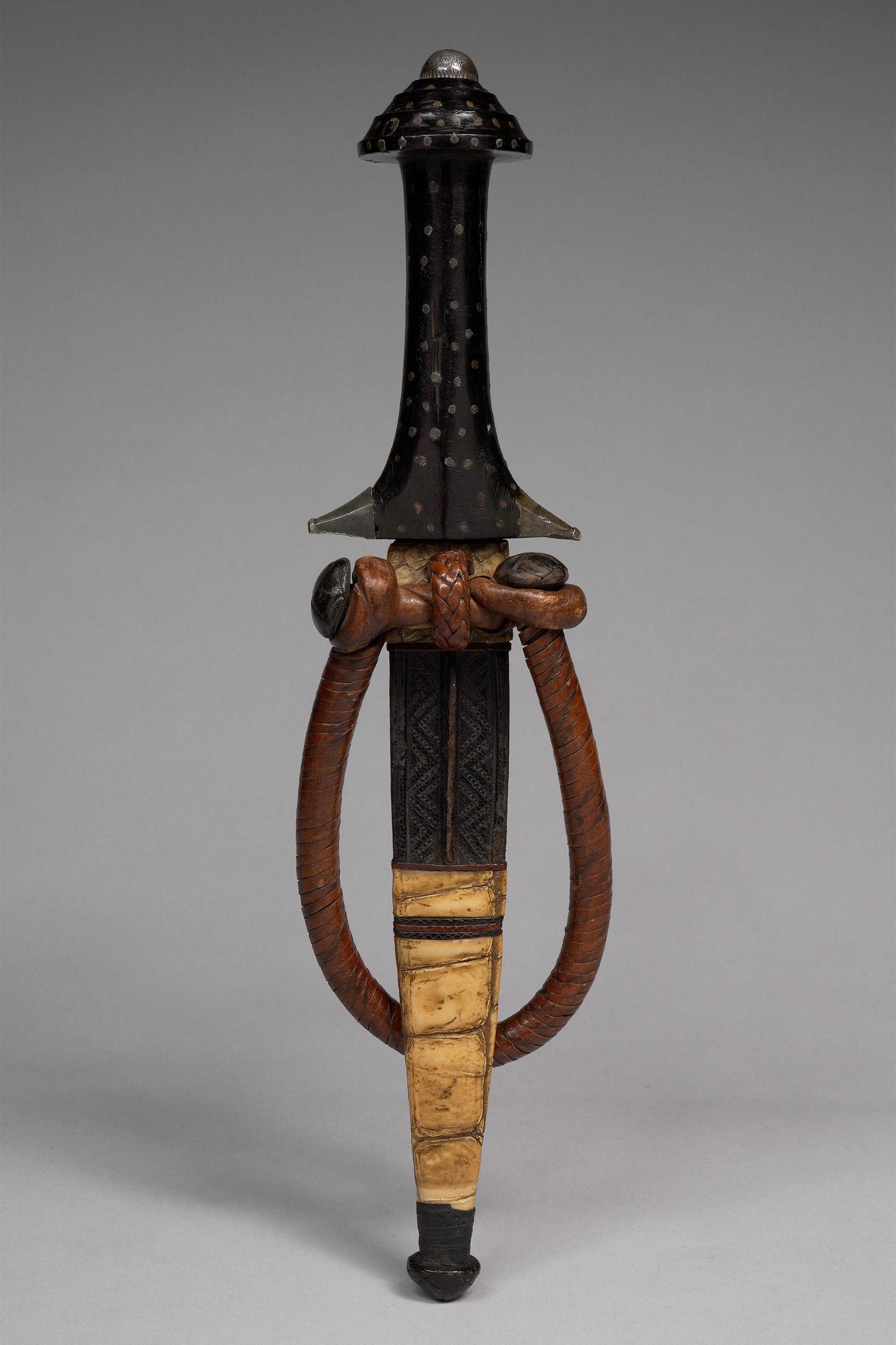The knife was worn on the outside of the upper arm, handle pointing downwards, and grabbed with the opposite hand (Fischer & Zirngibl, Afrikanische Waffen, 1978; Sparks, “Arab Knife,” Southern Sudan Project, 2005; Westerdijk, African Metal Implements, 1984; Zirngibl & Kubetz, Panga Na Visu, 2009).