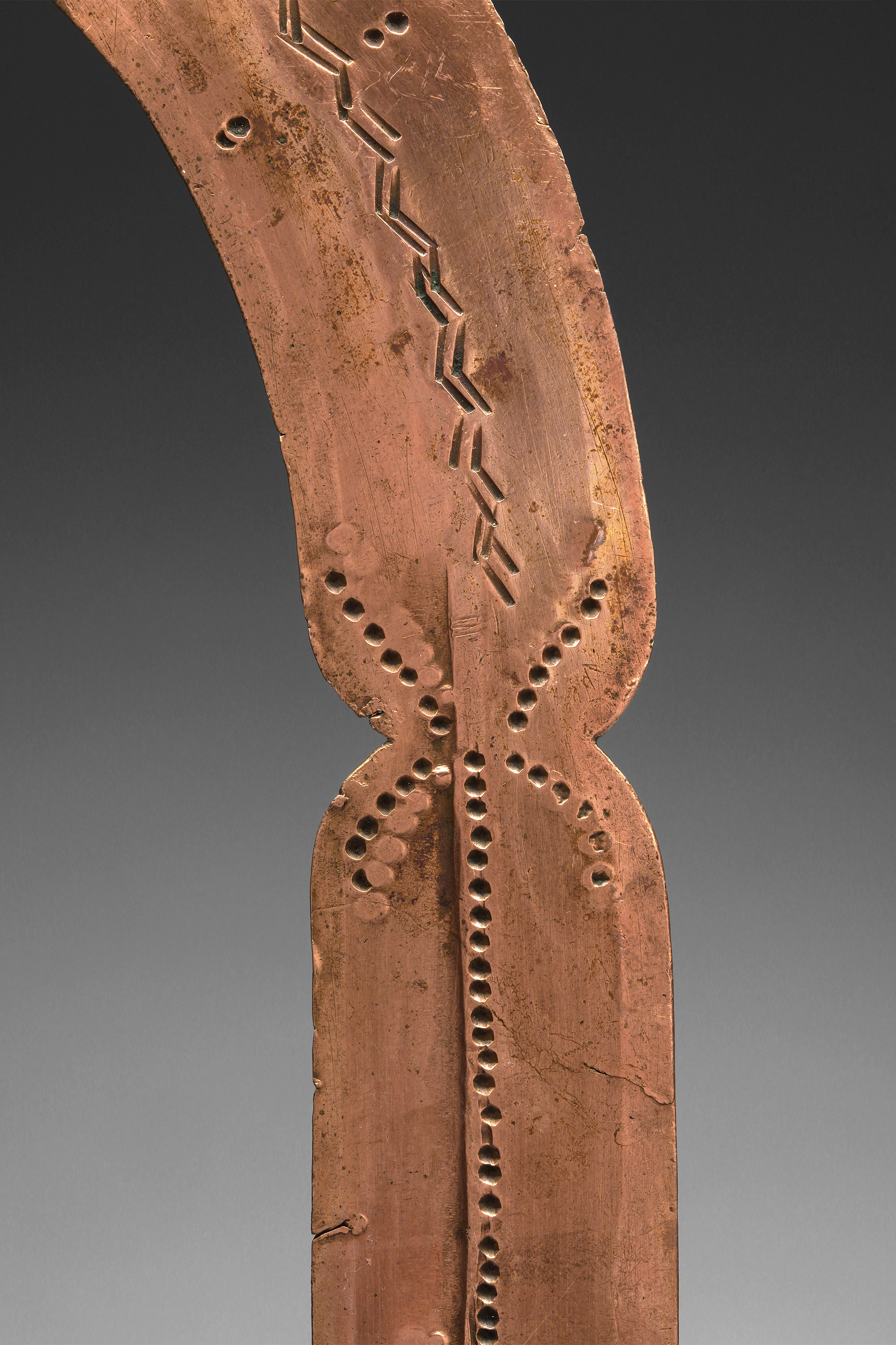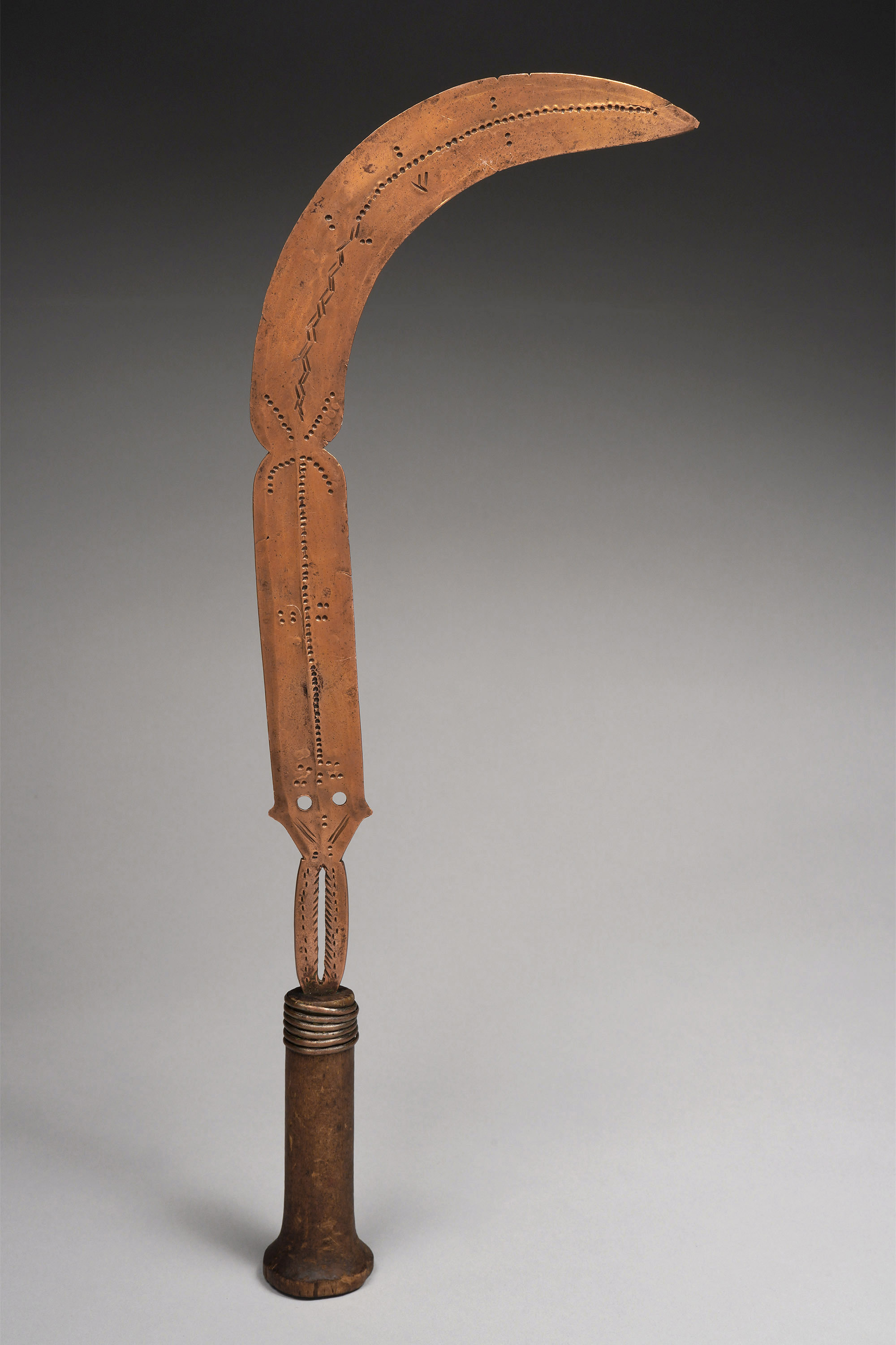 This curved sword is a light, second-generation deluxe version of a much heavier and functional blade produced by the Yakoma, Ngbandi, Sango, Gbanziri, and the Mbugbu. The functional examples were typically produced before 1920, and the light, deluxe, prestige blades were produced from 1920 - 1940.