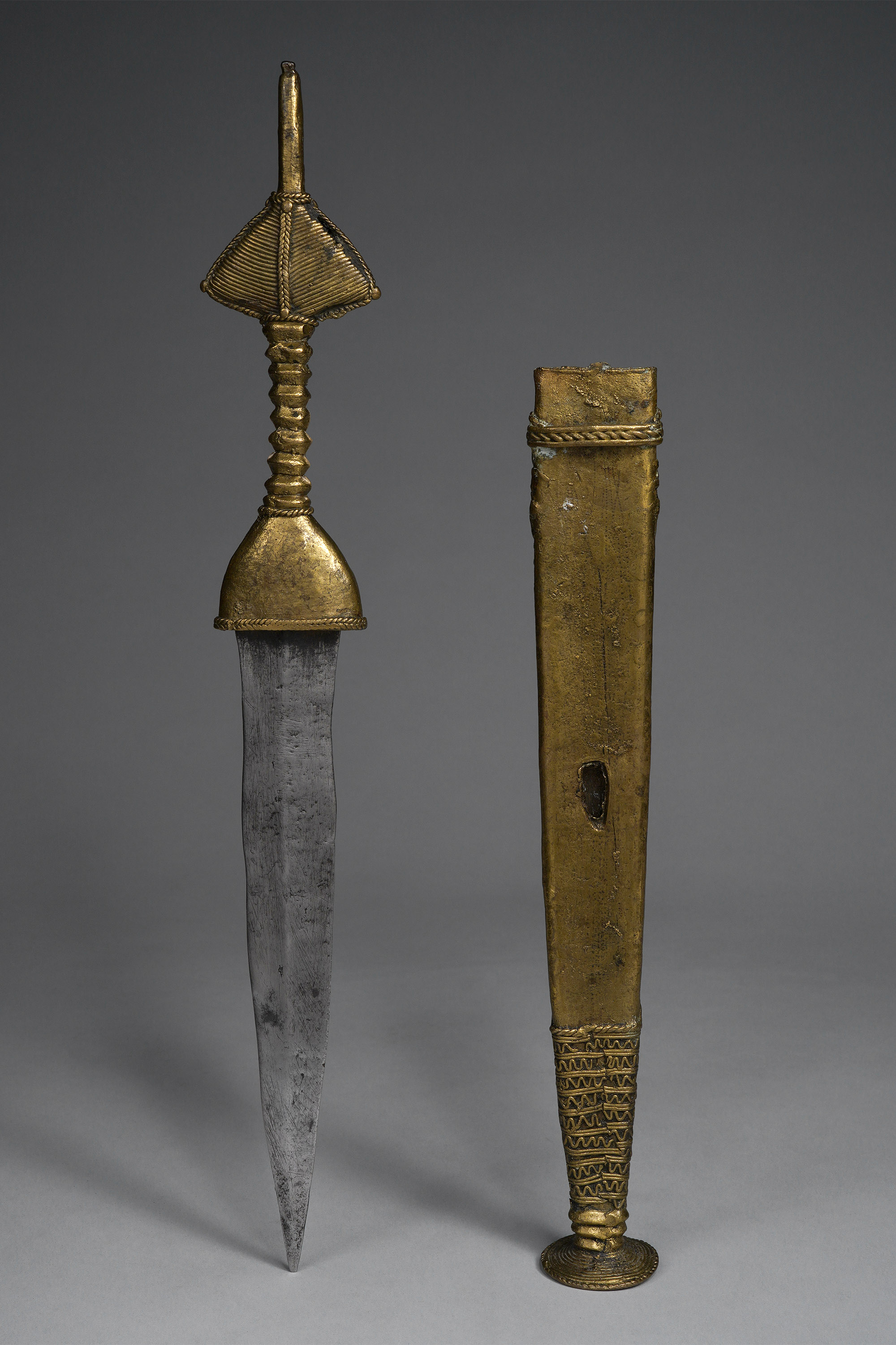 The Bata and Véré live in northeastern Nigeria and are well known as experts in the lost wax casting technique. Ceremonial knives with brass handles and scabbards were often extravagently detailed, as seen here (Elsen, De fer et de fierté, 2003, Zirngibl & Kubetz, Panga Na Visu, 2009).