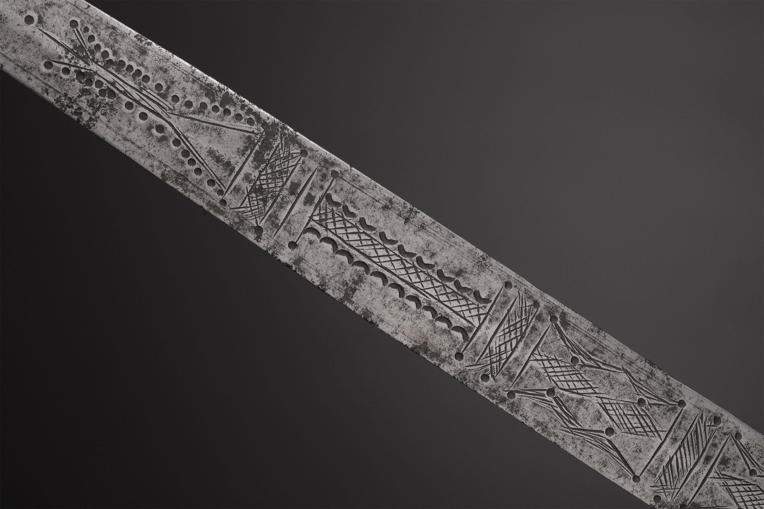 From the regions of the Blue and White Nile have come an assortment of prestige swords, daggers, and knives that are above all characterized by their unpractical aspect. The blades are incised with deeply cut geometrical patterns, and occasionally animal figures or Arabic script. The scabbards of these weapons are often made of entire reptiles, the gaping mouths of which form the opening to sheathe the blade. Most of these weapons date back to the Madhi period (1885-1898) and seem to have served only for ceremony (Westerdijk, African Metal Implements, 1984).