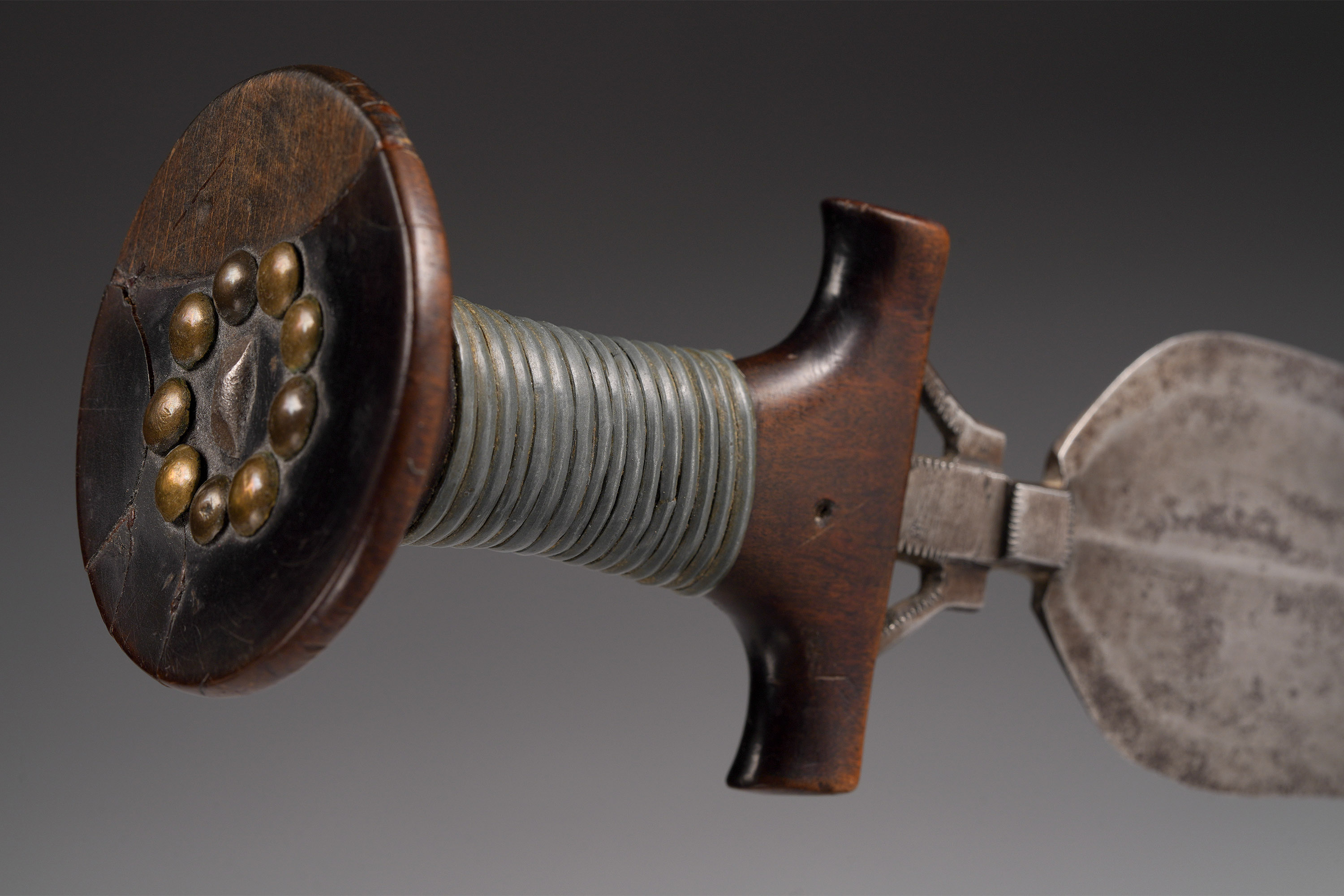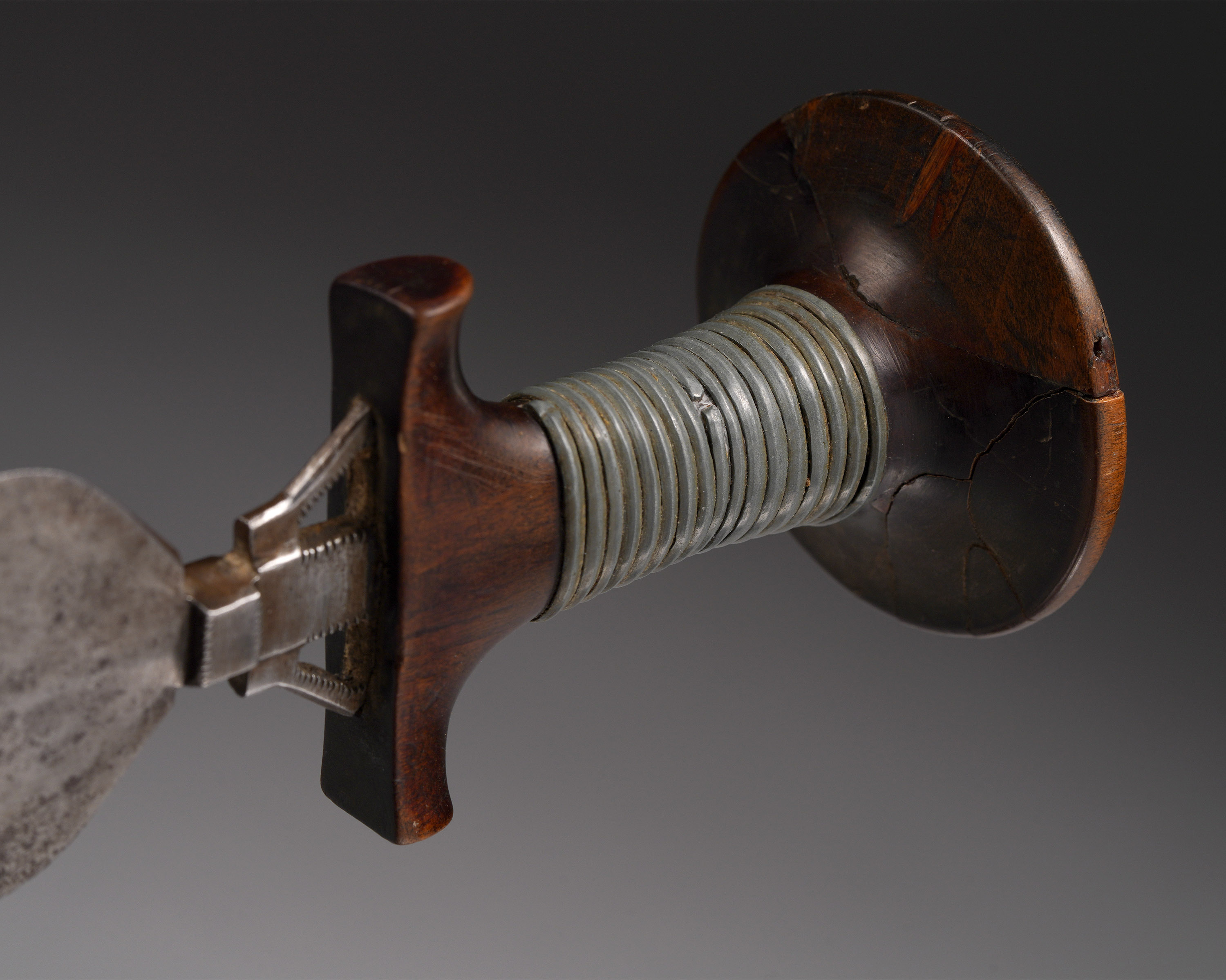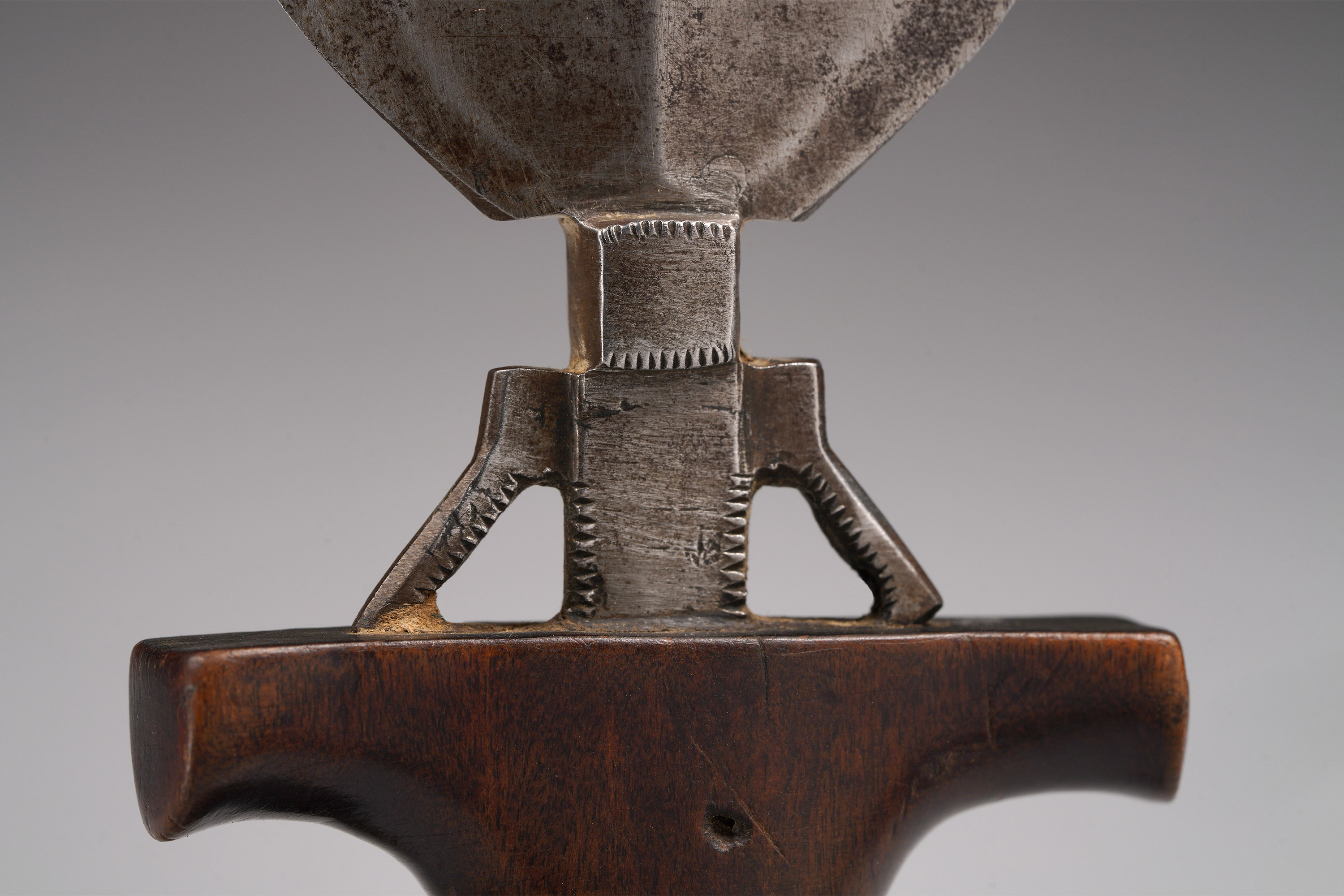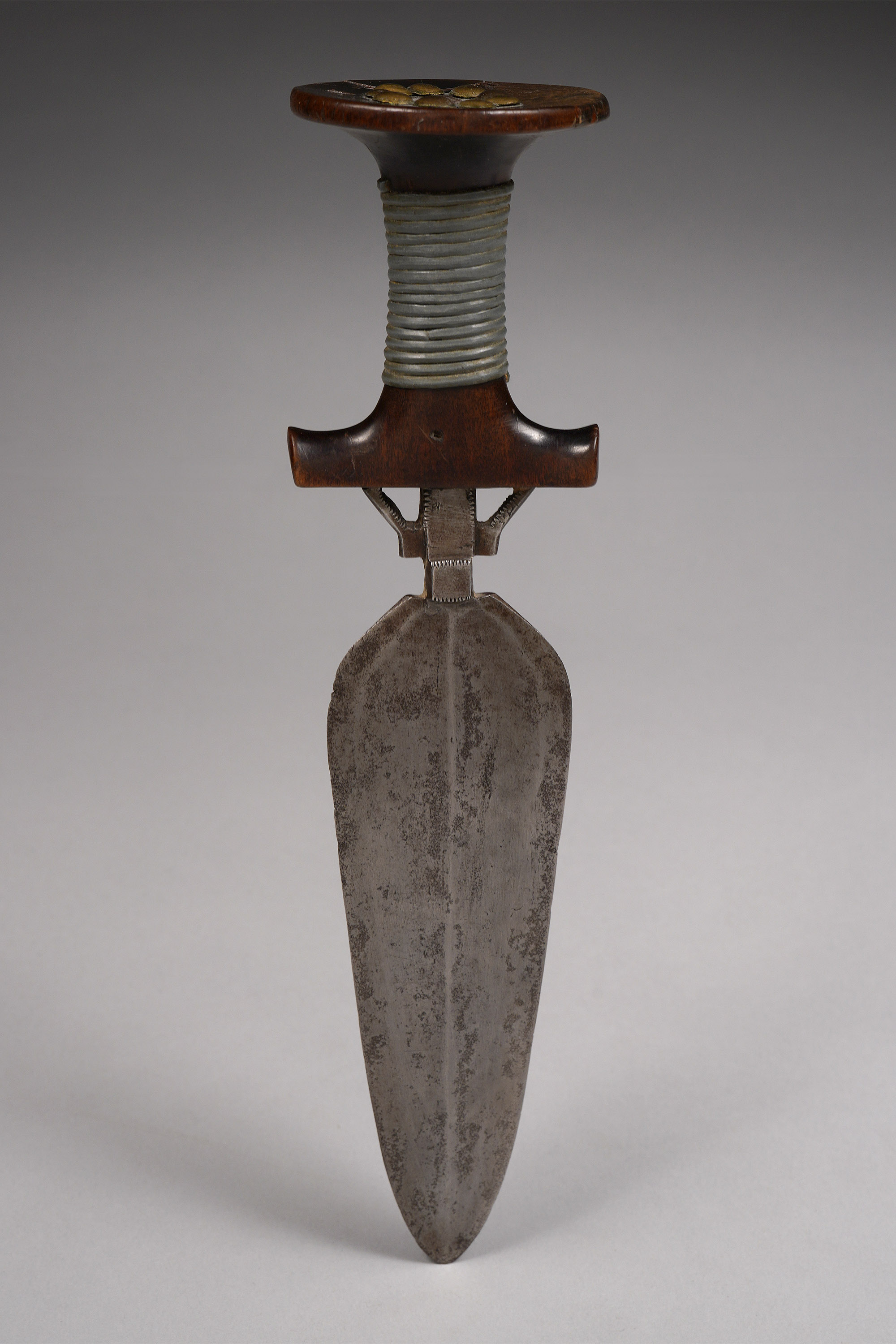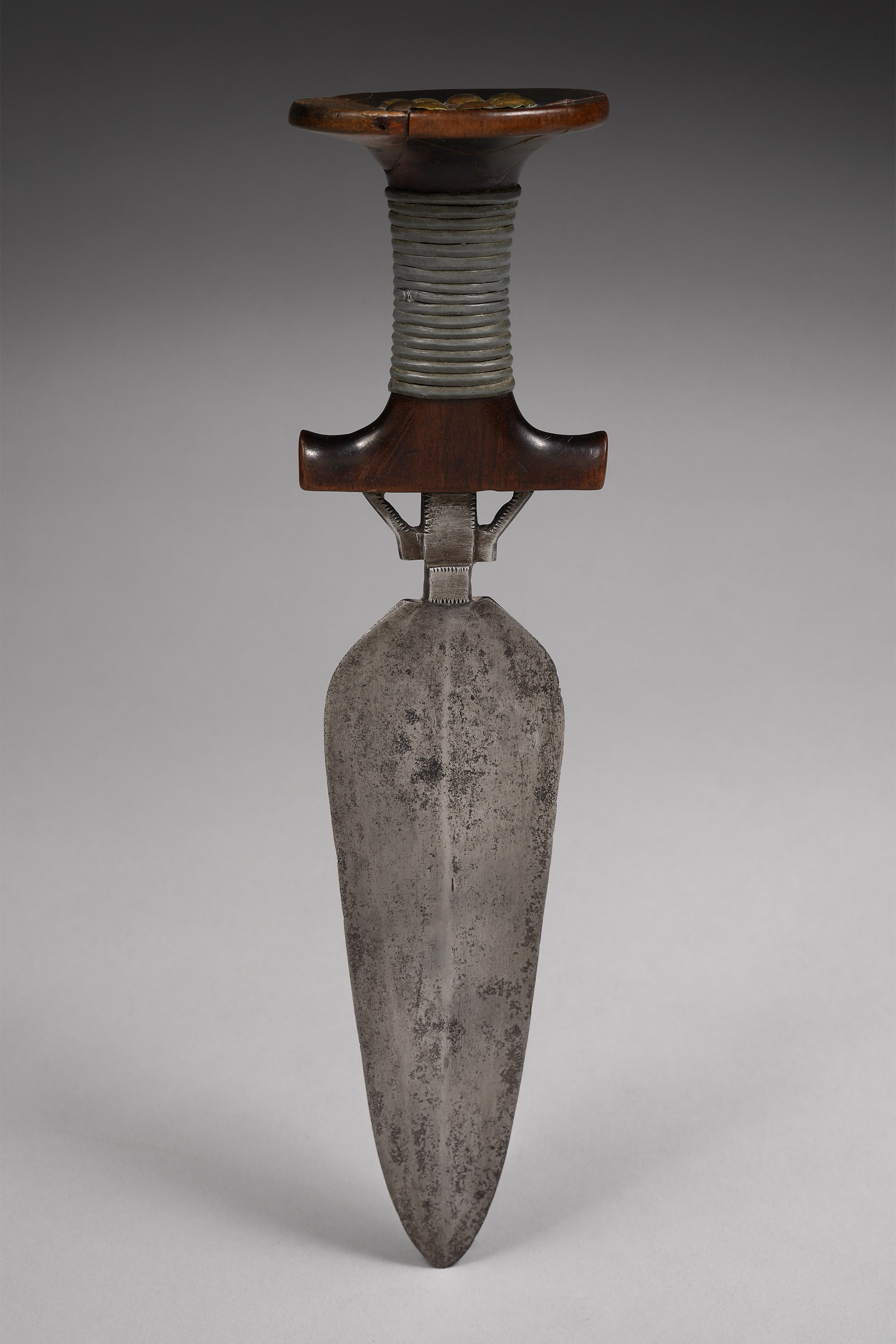 Mangbetu daggers (sape) were typically carried at the waist, usually in a sheath, and served as both ornament and implement. The earliest documented examples of anthropomorphic carving definitevely associated with the Mangbetu were found on this type of blade. The sape is also found among the Azande, where they rarely have figurative carving on the handle. Sape blades were used by men and women for many purposes (Schildkrout, African Reflections: Art from Northeastern Zaire, 1990).