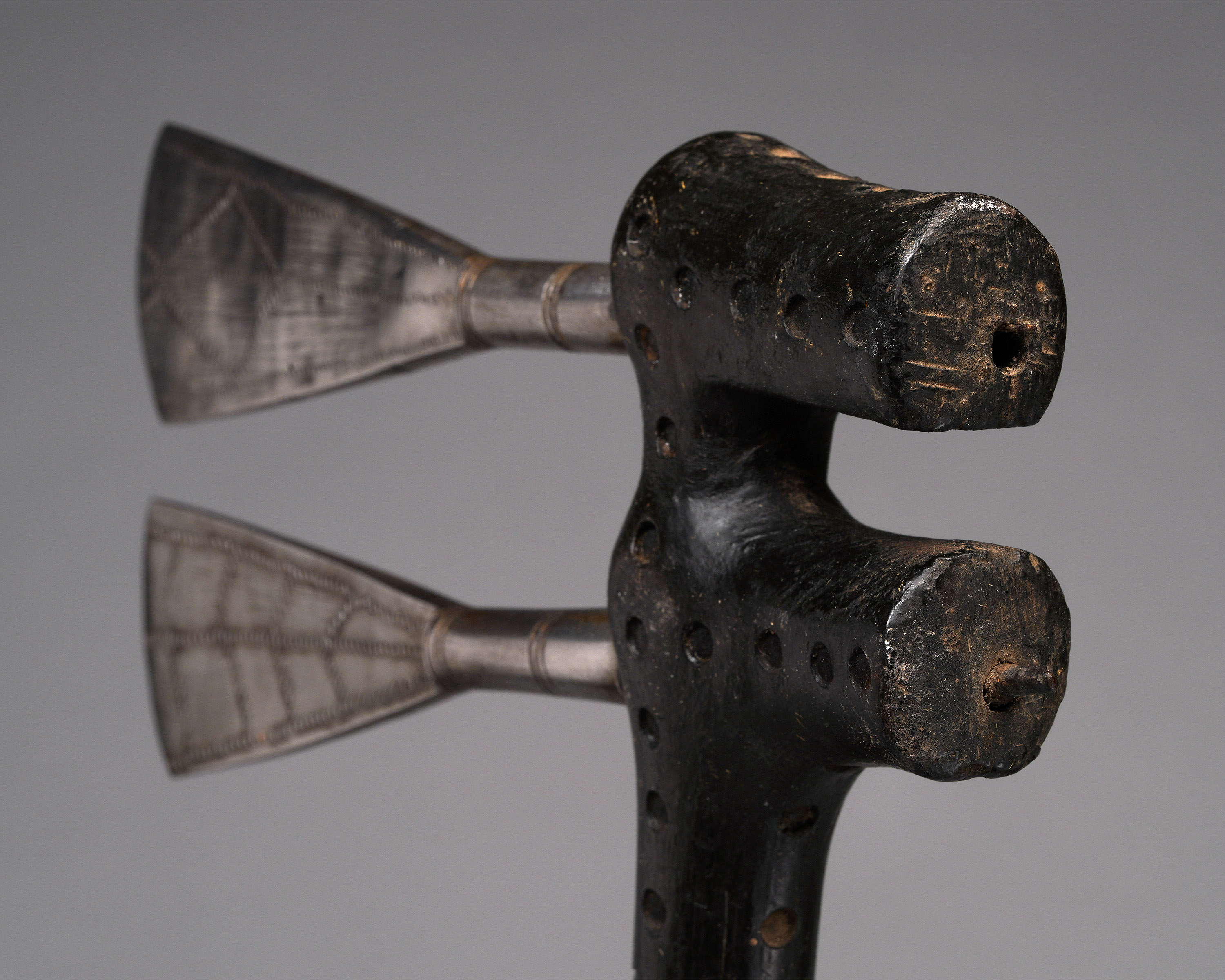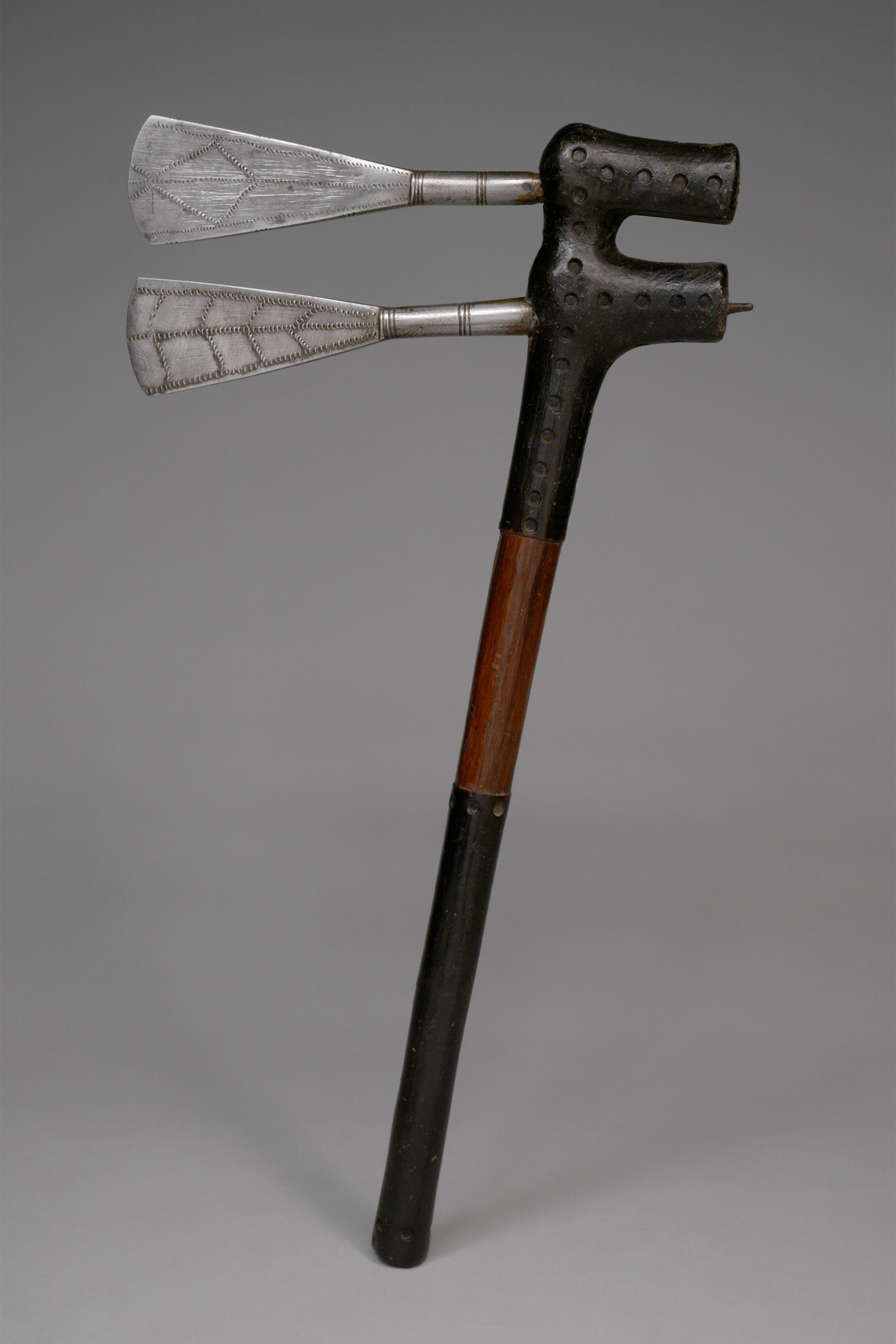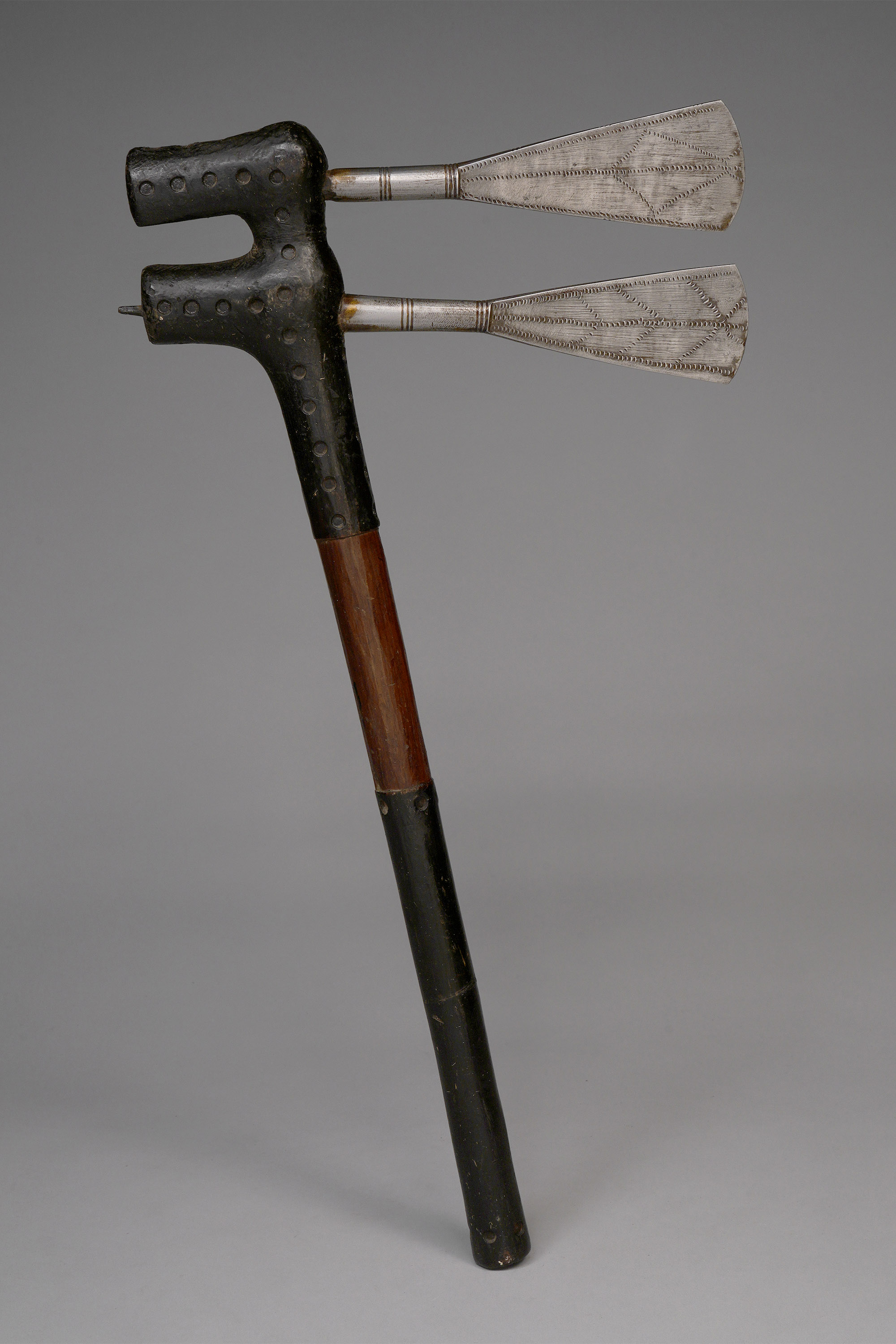 Around 1860, following a major famine, the Chokwe migrated and settled in Angola. They were governed by a king known as Mwana Ngana, who distributed hunting grounds and cultivated areas. The male Mugonge and female Ukule societies regulated social life (Bacquart, The Tribal Arts of Africa, 1998; Zirngibl & Kubetz, Panga Na Visu, 200).