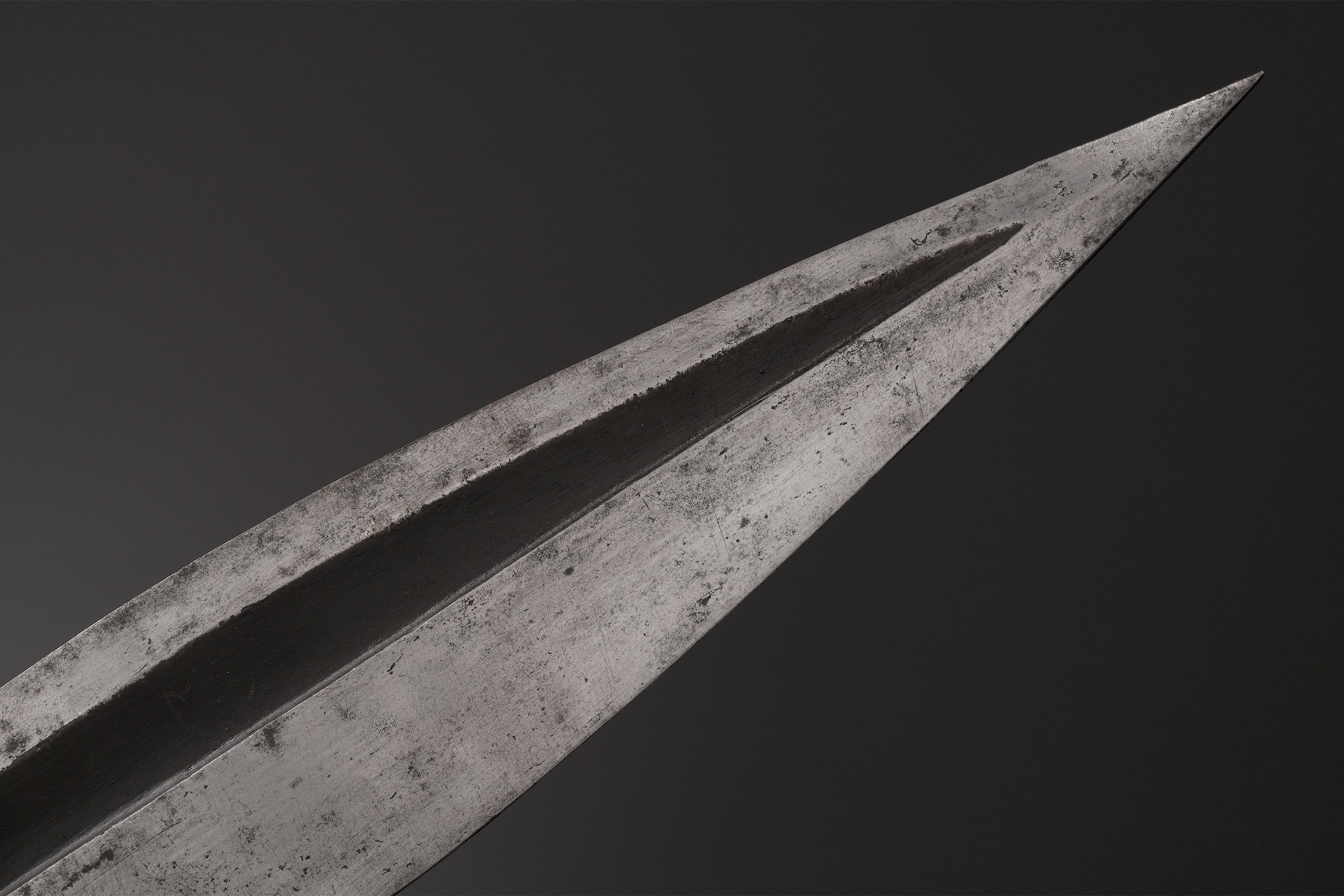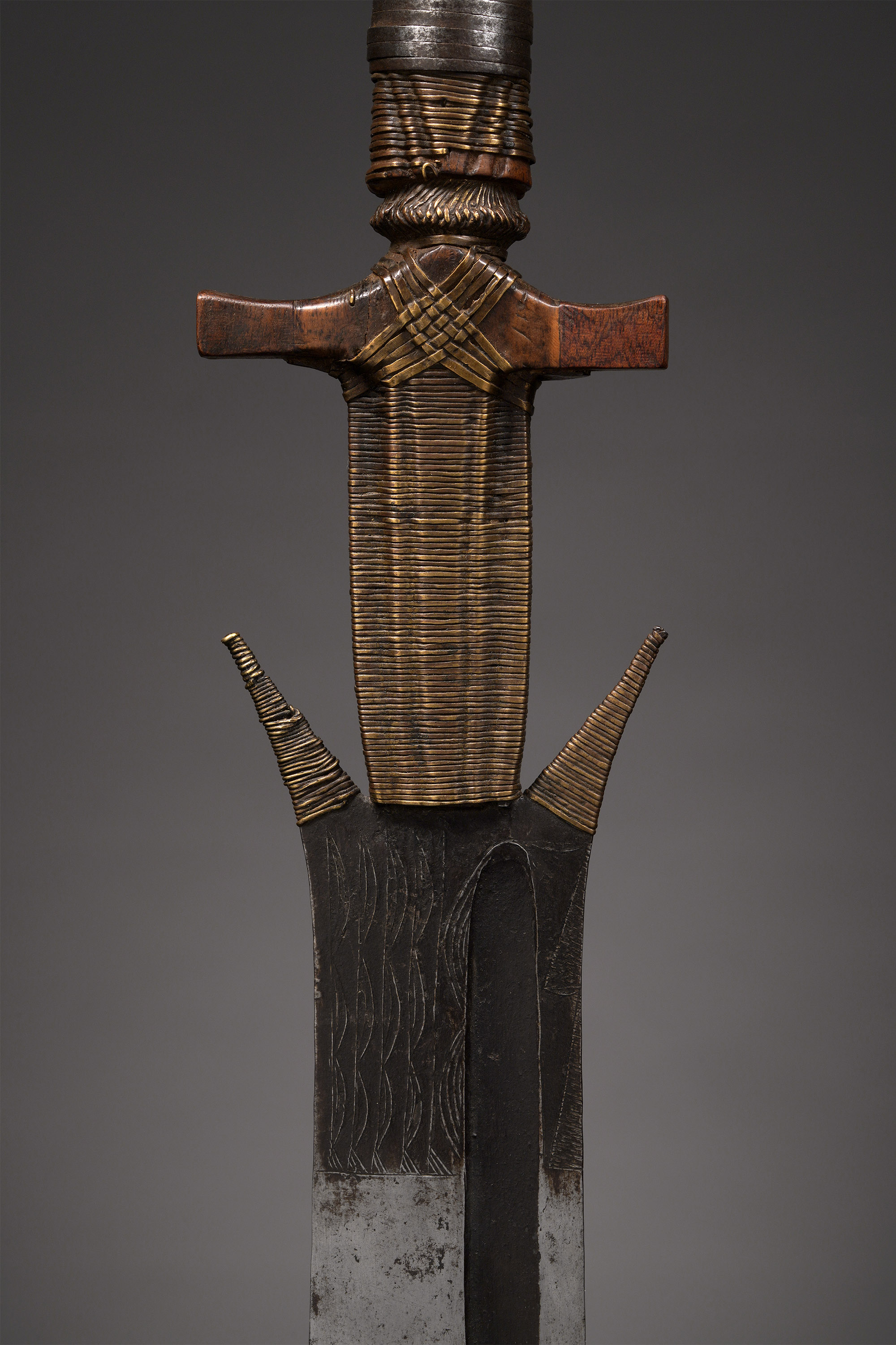 This fine short sword comes from the Fang, who inhabit the rainforest in an area that stretches over three countries. It would have originally been carried in a sheath, called abam, composed of two wooden boards typically covered with stitched lizard skin from the Ornate monitor (Varanus ornatus). While primarily a symbol of status, these blades were also used in a ceremonial context, and are very functional as well, with two sharp cutting edges (Elsen, De fer et de fierté, 2003).