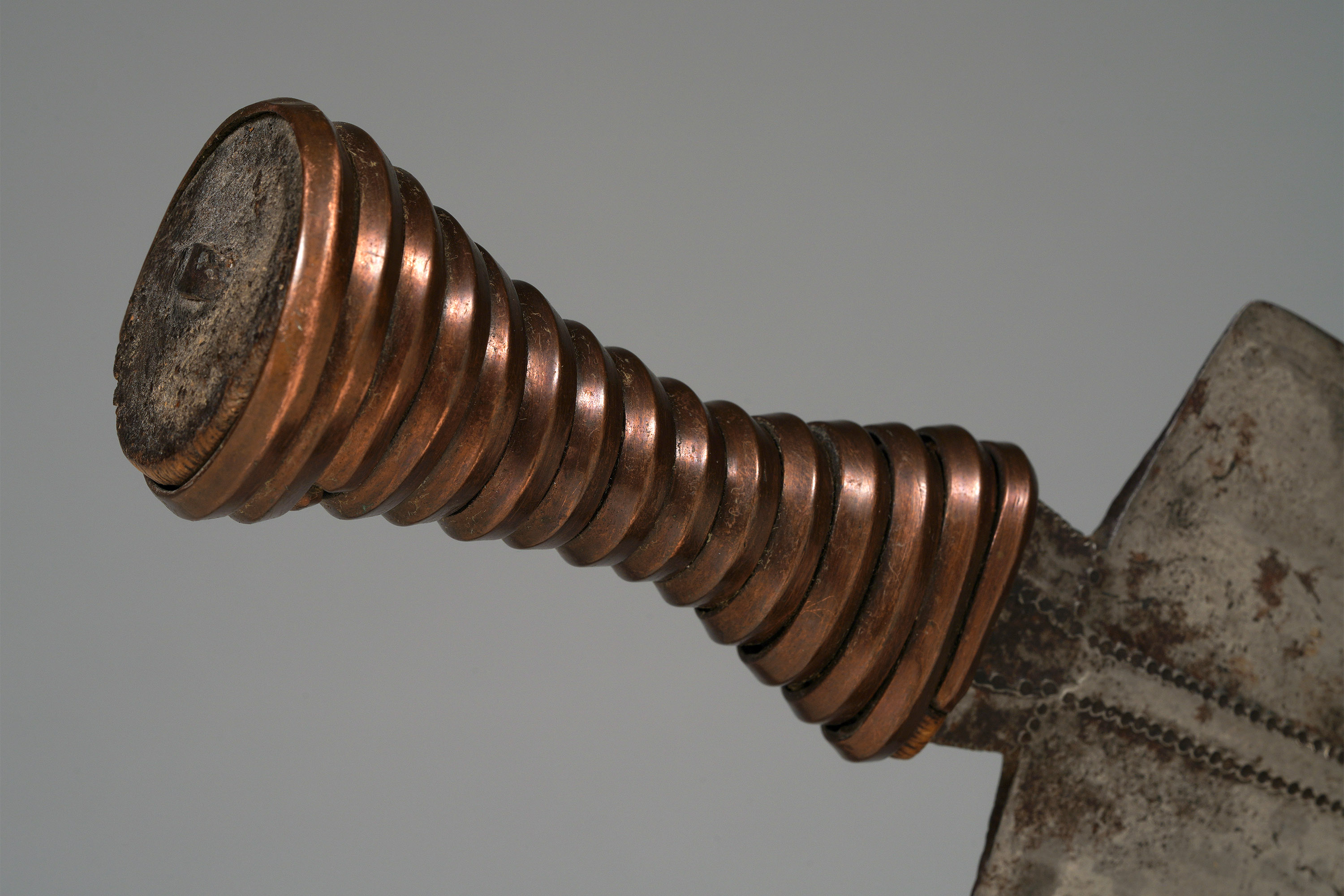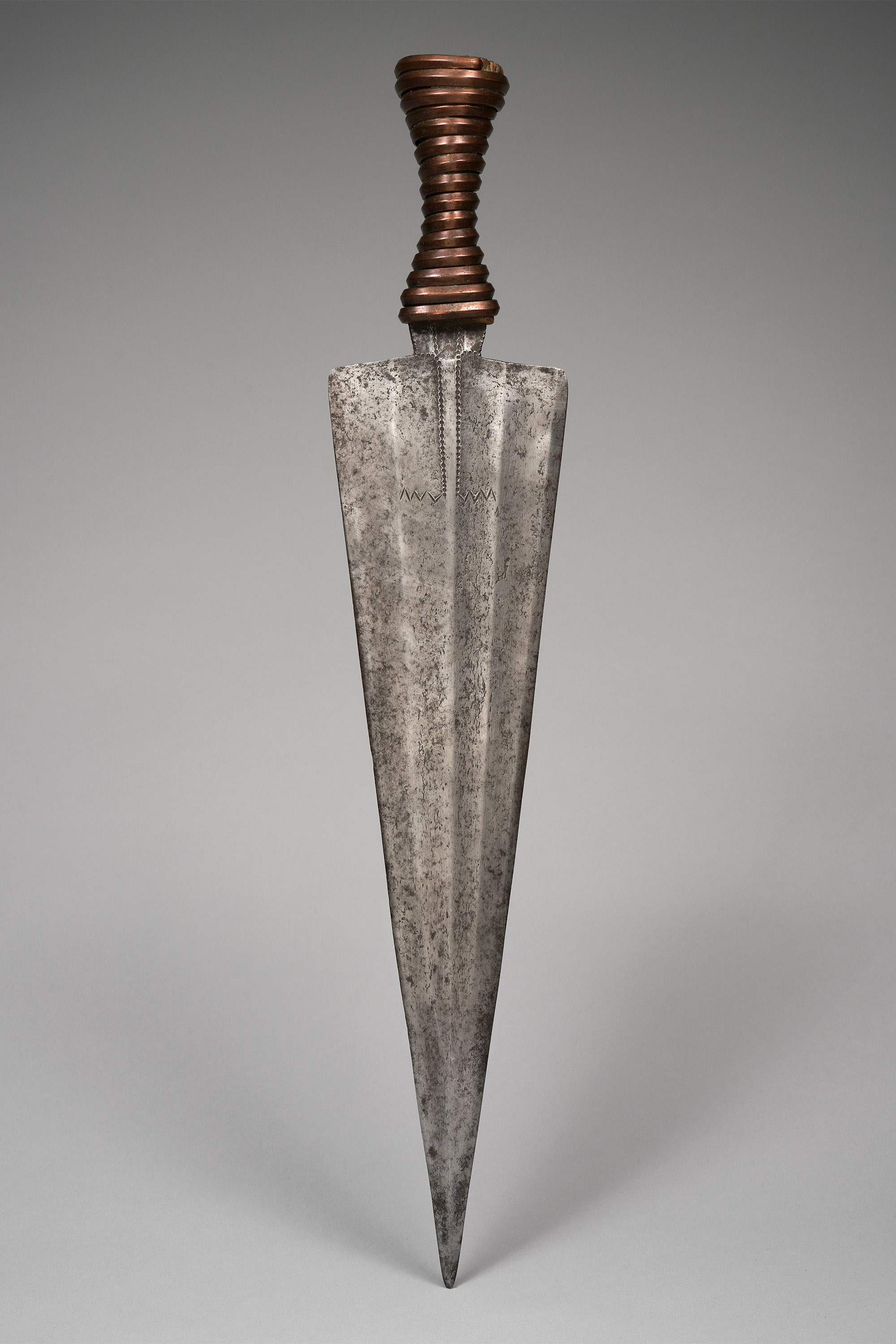 This symmetrical short sword was likely displayed as a symbol of prestige among a number of cultural groups inhabiting the Lower Ubangi Region in Northwestern D.R. Congo. The blacksmiths of the Ngbaka Mabo and Nzombo were by far the most important producers of their distinctive throwing knives. The Nzombo are one of a number of cultures associated with the Ngbaka such as the Ngbaka Mabo and Gbanziri-Buraka (Westerdijk, The African Throwing Knife, 1988).