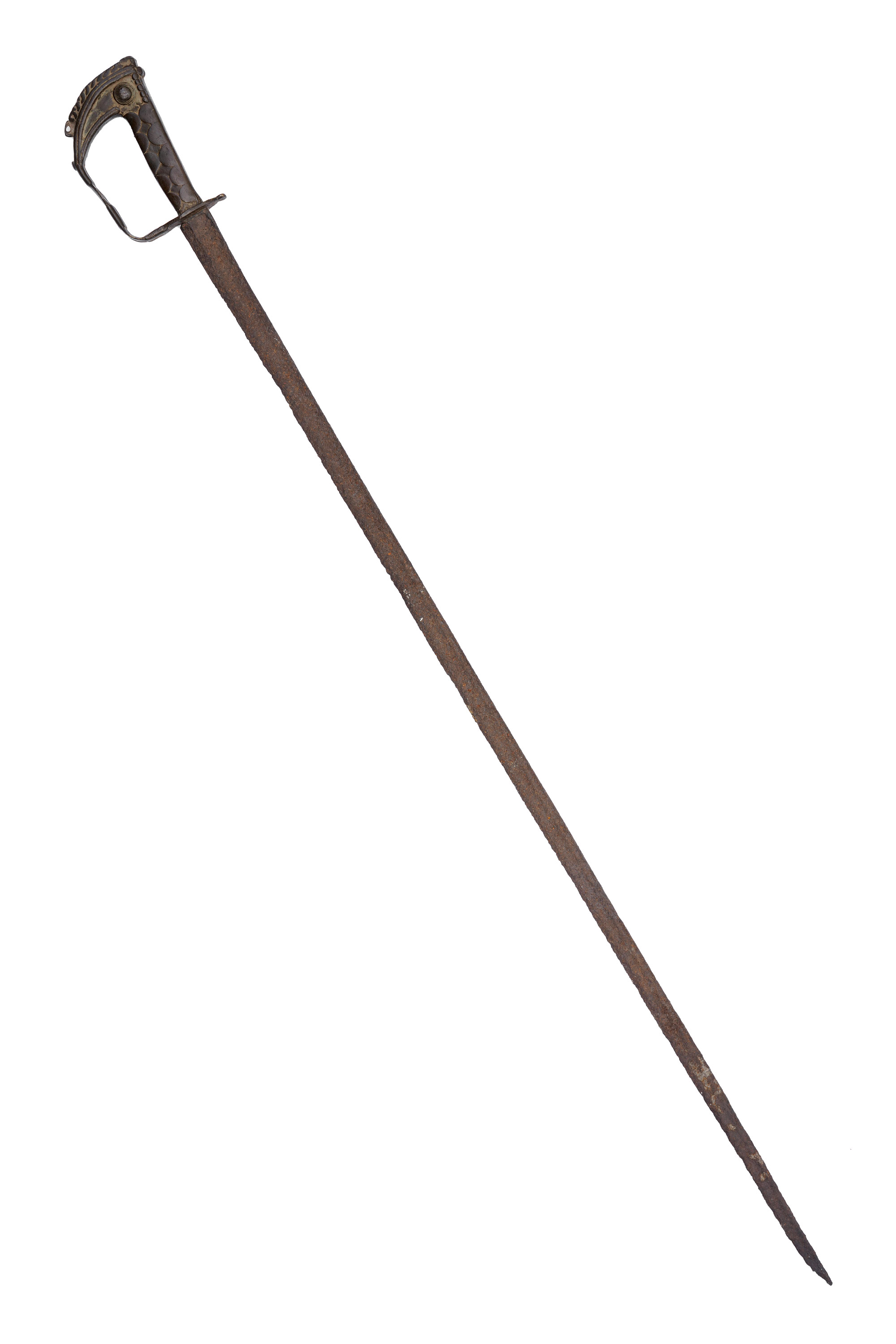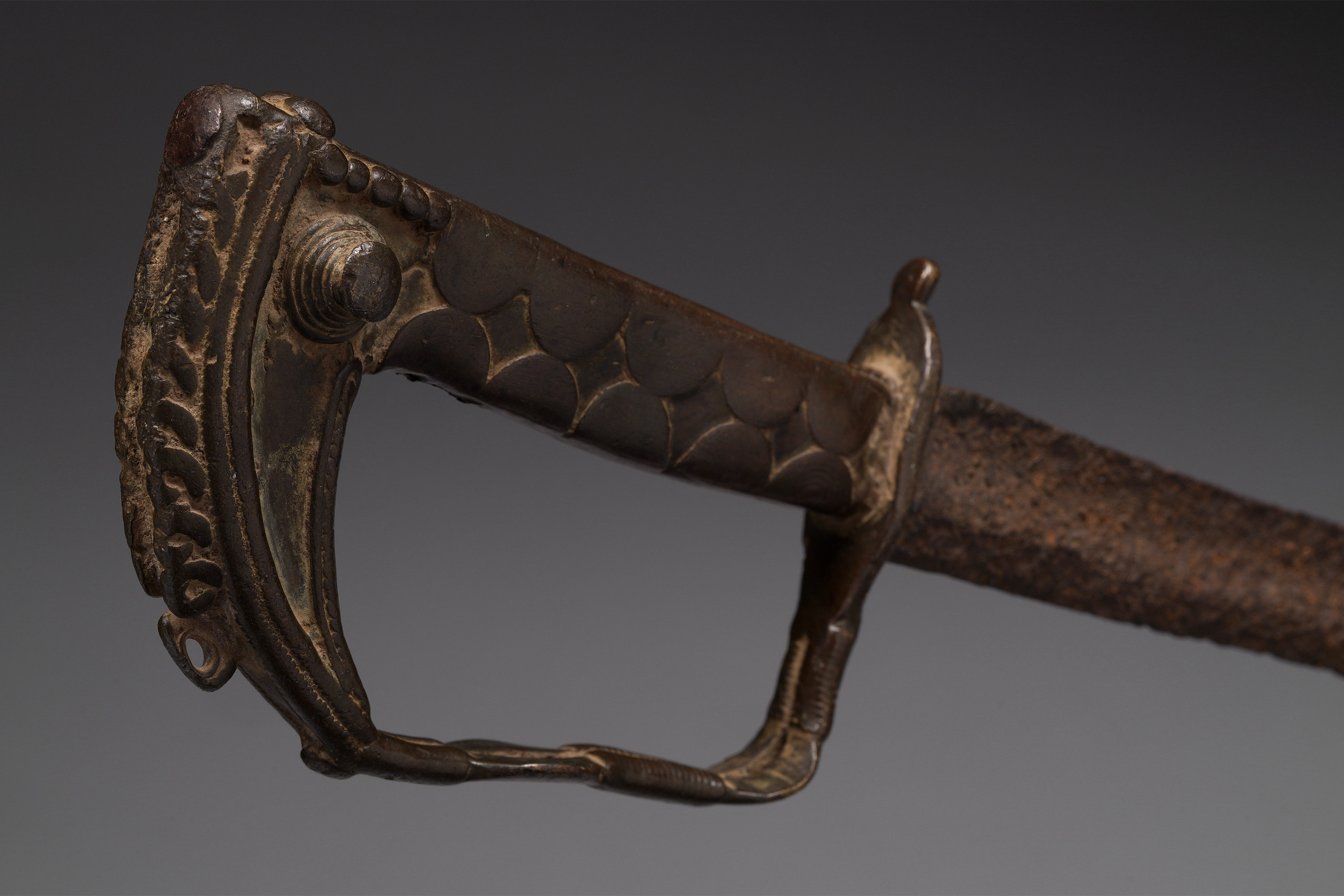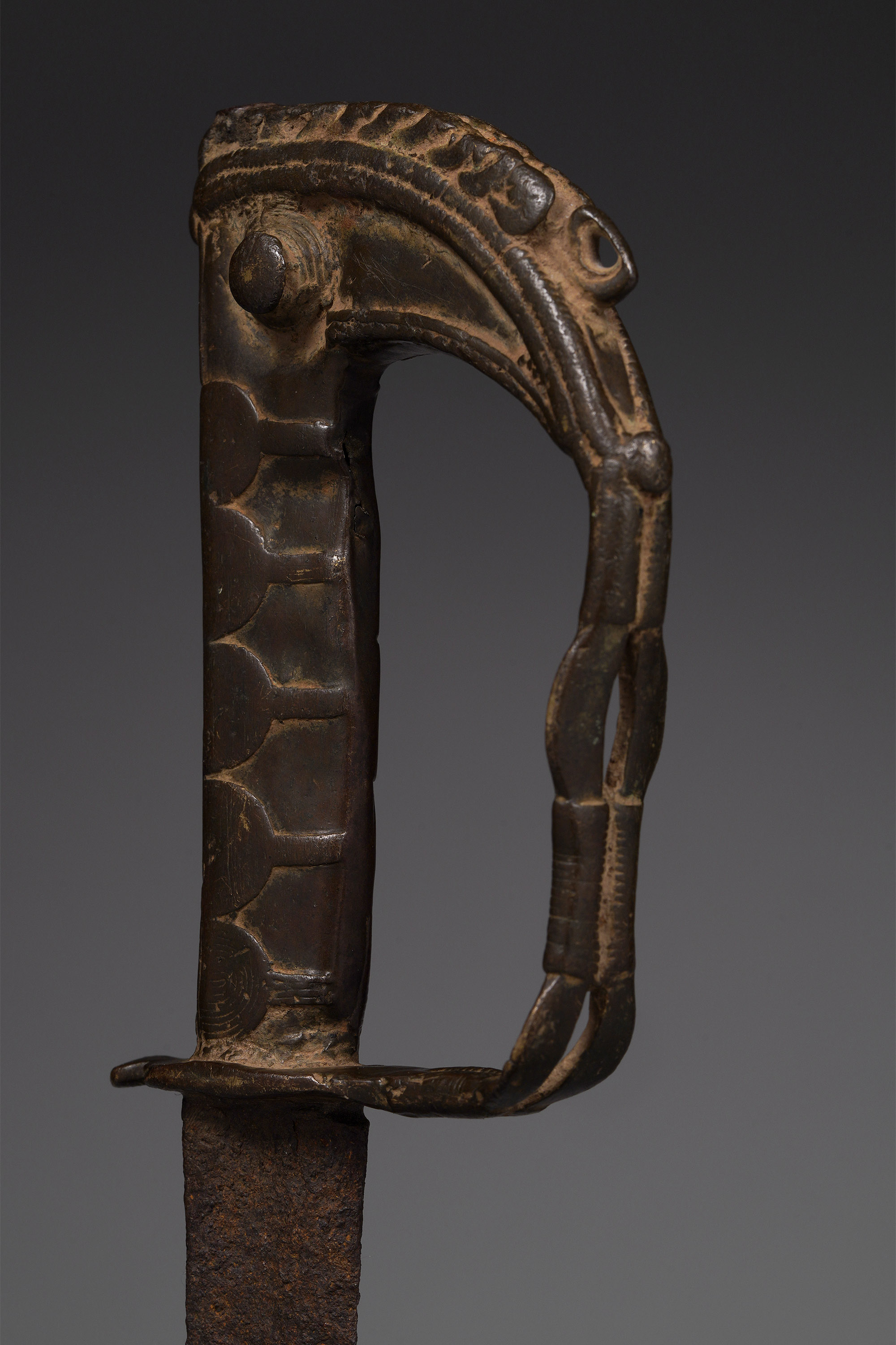 This sword is likely an excavated piece from the Toussian people who inhabit southwestern Burkina Faso. Several related objects were also attributed to the neighboring Goin. The totemic animal depicted on the hilt – a chameleon or bird – is common among several cultures in the region (Elsen, De fer et de fierté, 2003).