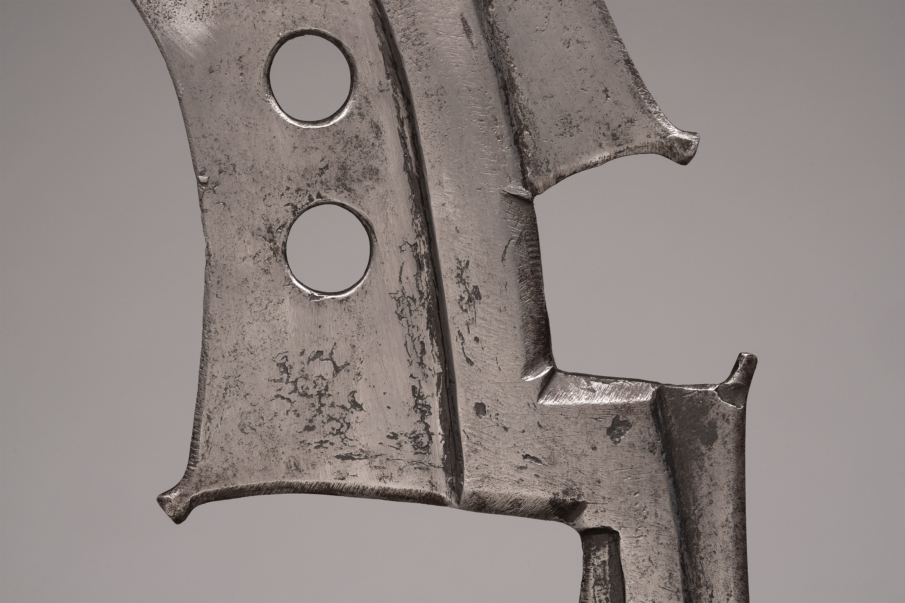 The transposition of the central axis, as seen on this example, is both a rare design element and the most desirable characteristic of Mangbetu blades.