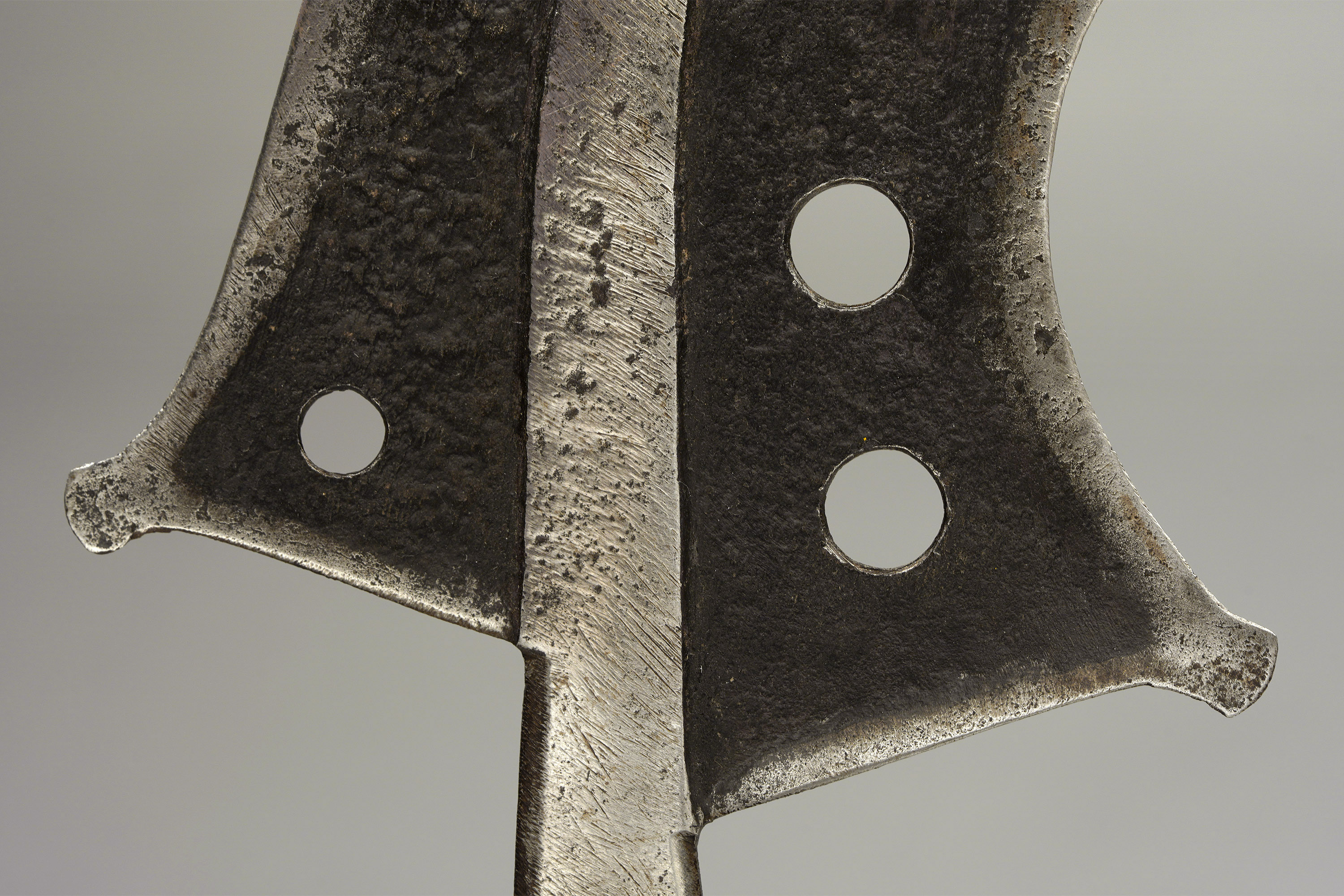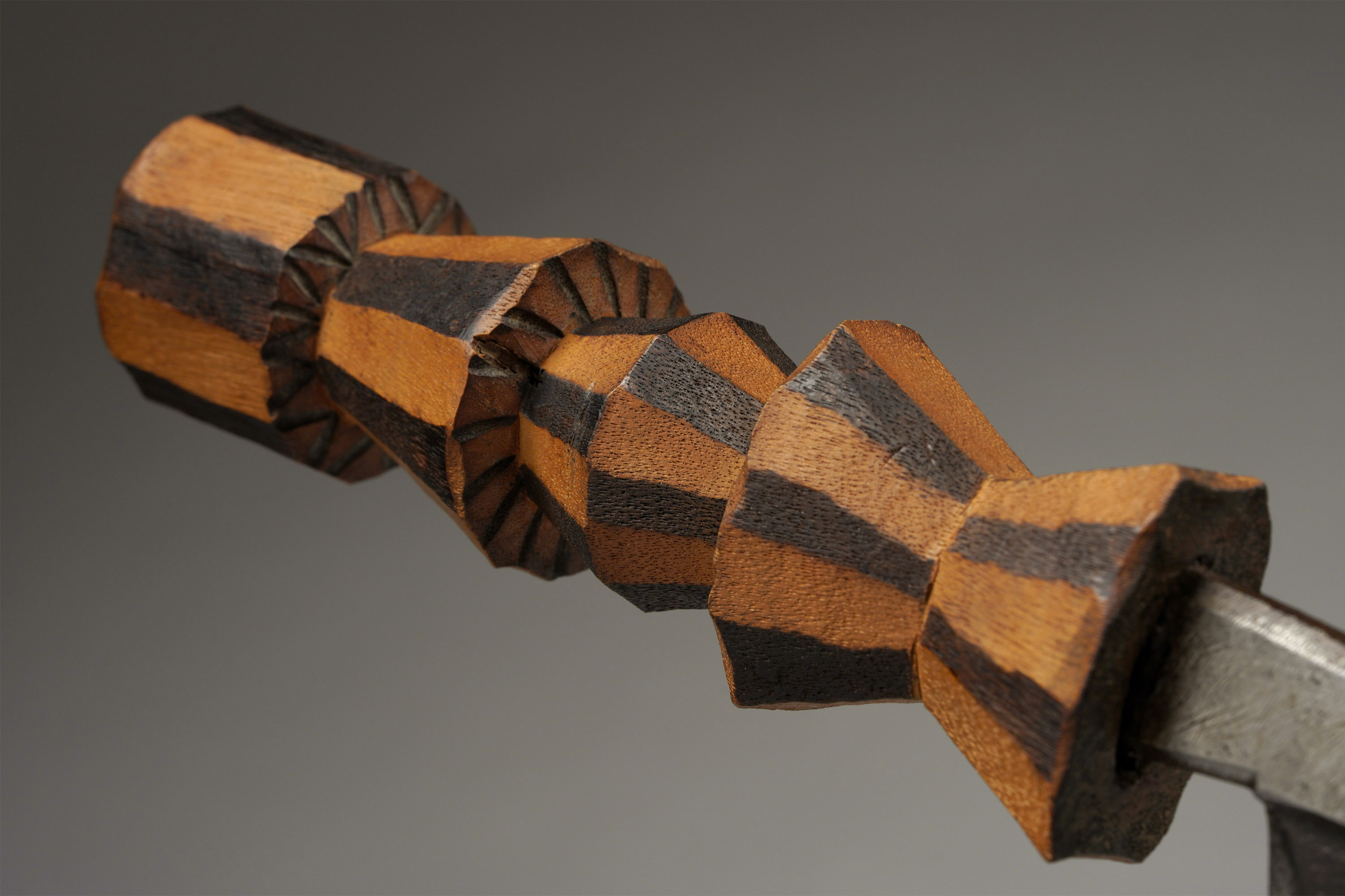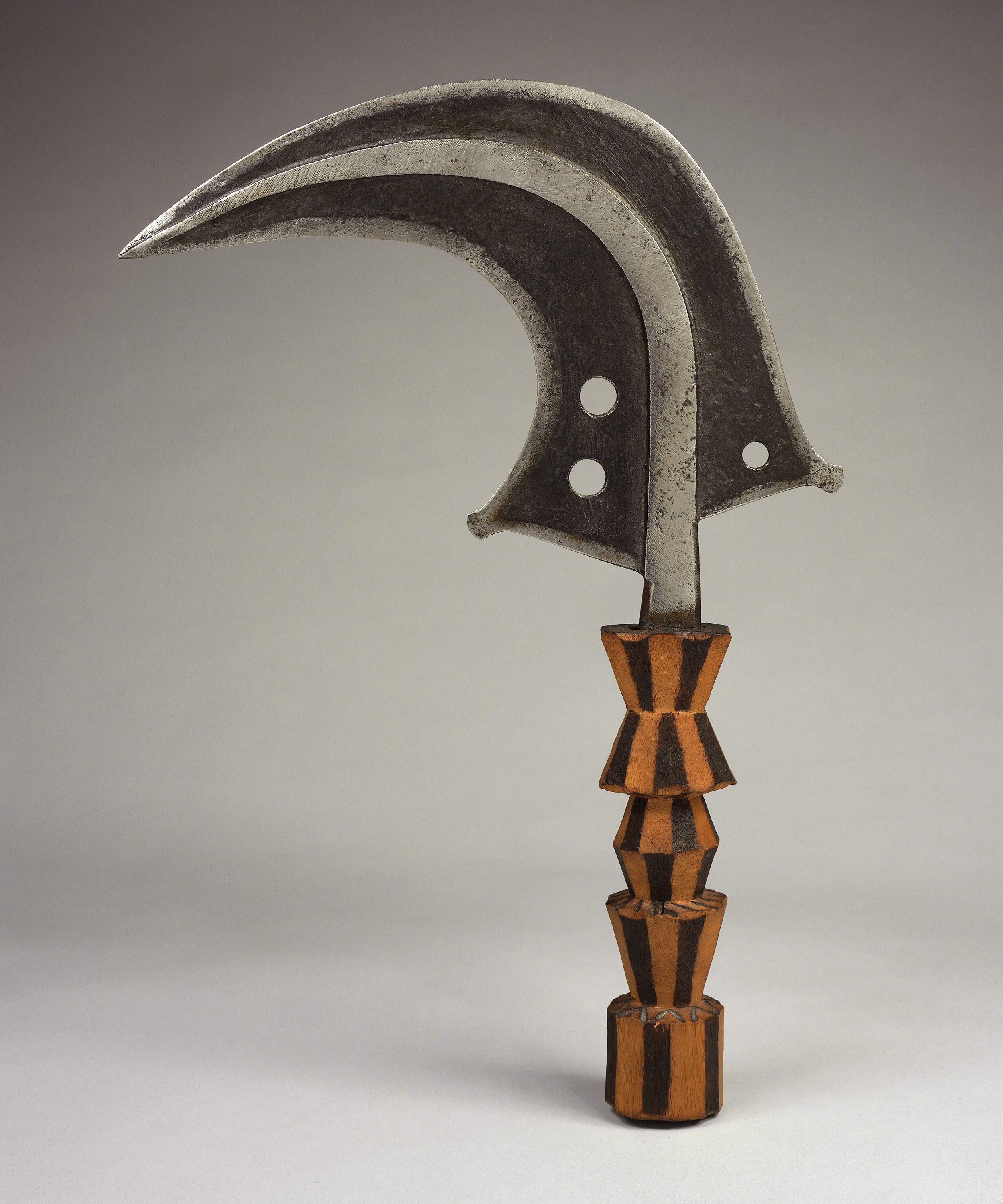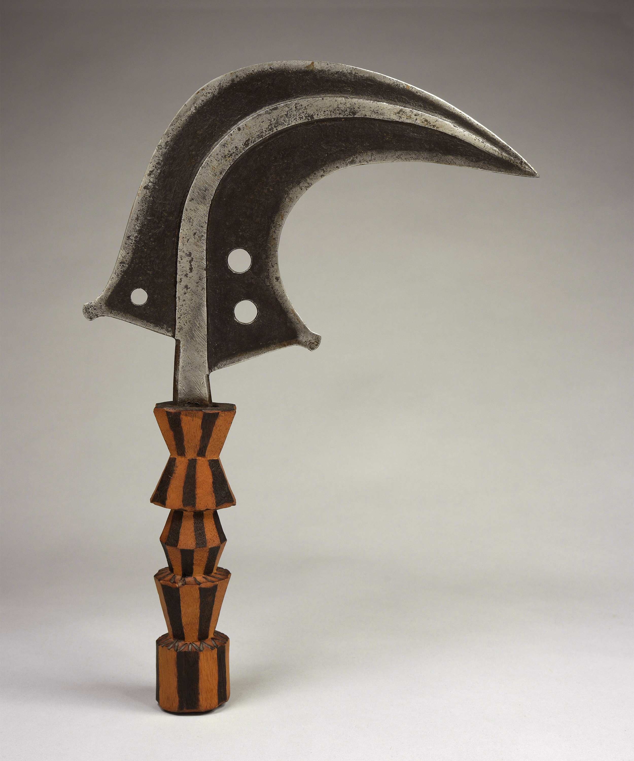 Historically, Nagata blades were used in physical clashes between the Mangbetu and the Zande, but in the 20th century, they were used for peaceful purposes and were brandished during ceremonial dances. They were also used as insignias of dignity and given as diplomatic gifts. The fancy details and finish gave its bearer a certain distinction and enhanced his reputation and wealth (Schildkrout & Keim, African Reflections: Art From Northeastern Zaire, 1990; Vanderstraete, Monnaies Objets d’Échange, 2016).