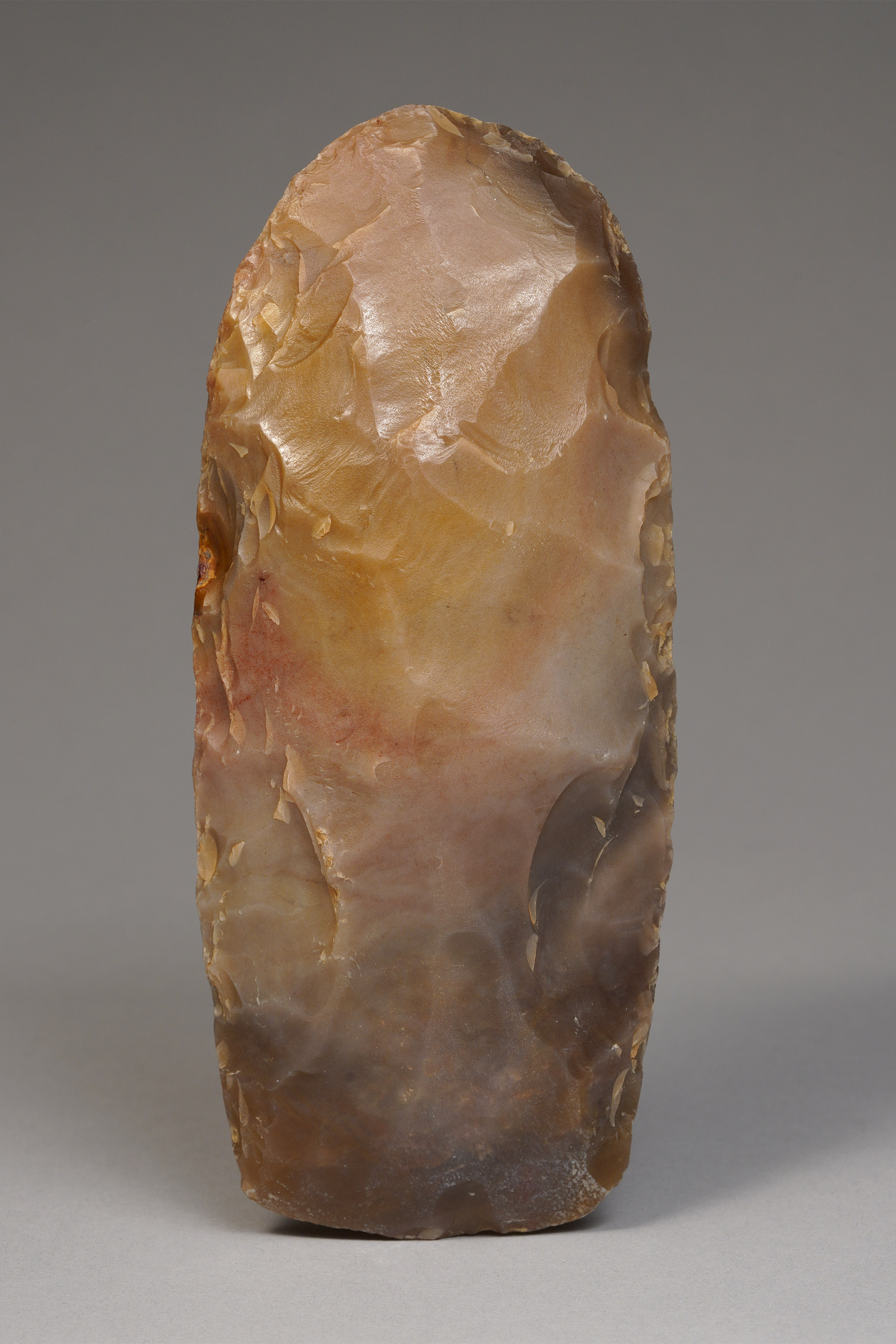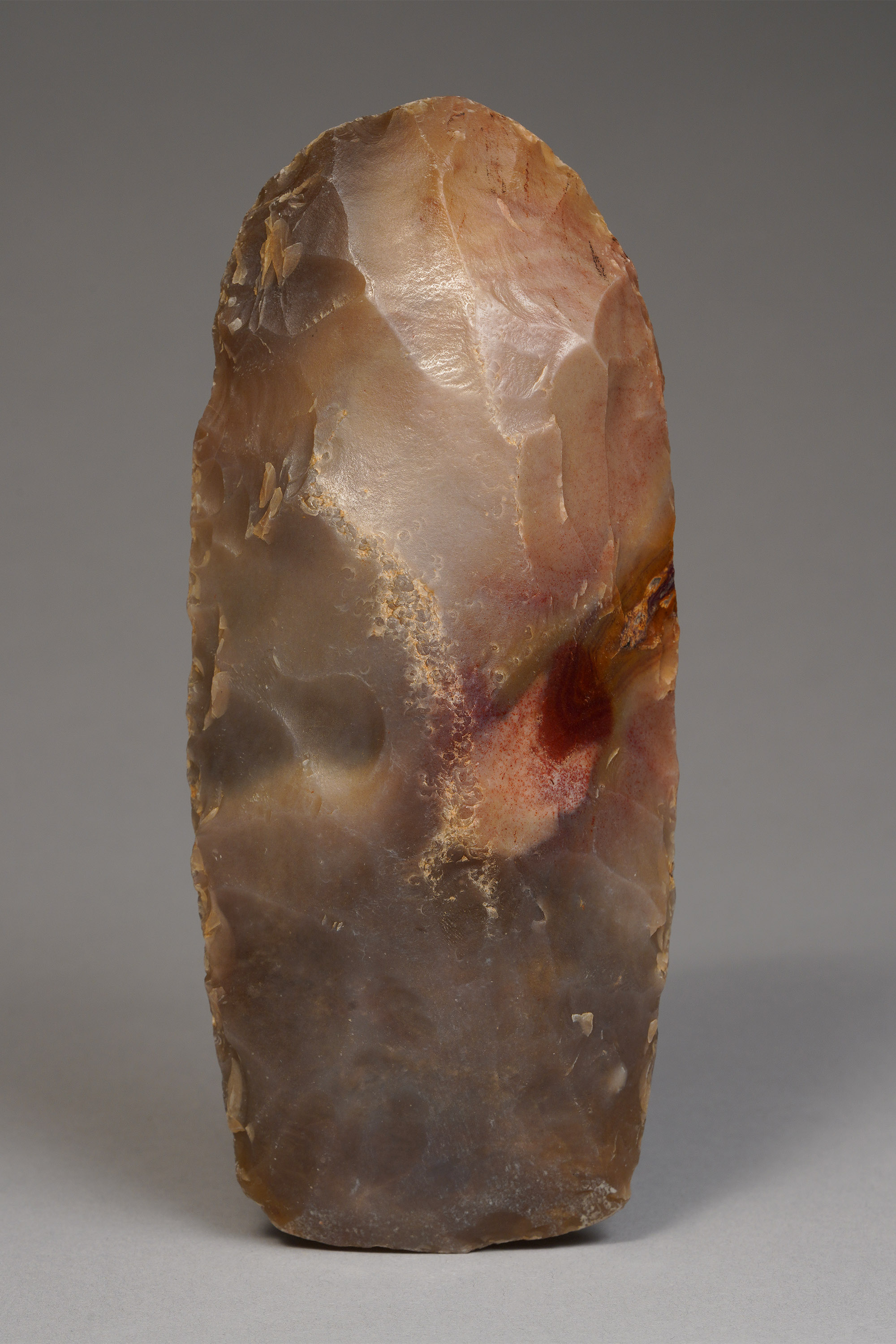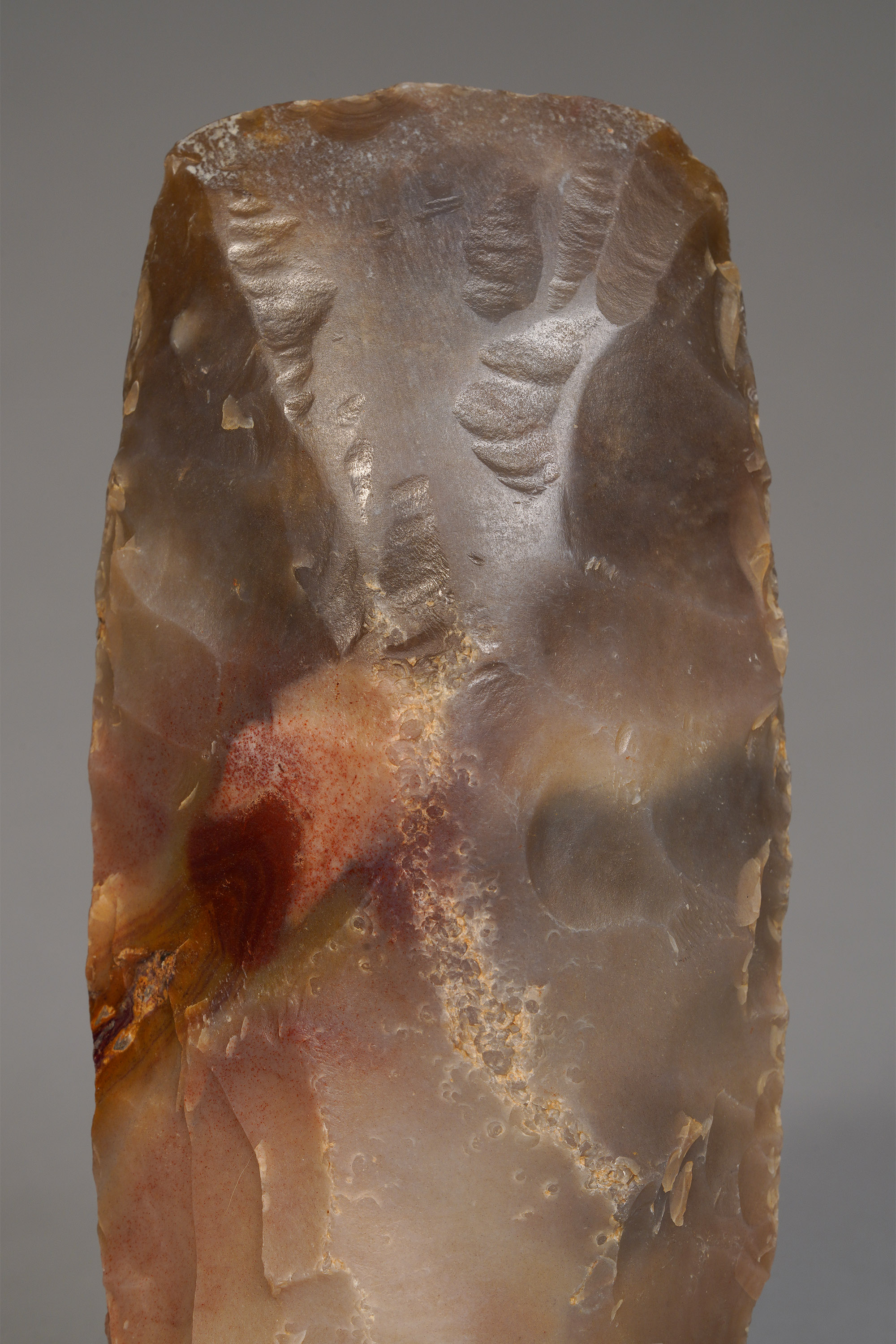 Axe blades such as this were made out of exceptionally high-quality flintstone / agate and belong to the Tenerean neolithic complex in West Africa. They are around 6000 years old. They were produced by specialized flint knappers who also made arrowheads and other tools. Most of them were found in Niger, but there were ateliers in (modern-day) neighboring countries as well. The axe blades had different shapes based on their function / purpose, and when in use they were sharpened along the outer edge. Gradually the axe blades became shorter and were resharpened until they were too small to work with. Most of the axe blades found are in the first stage, simply knapped and ‘fresh’ (found in close proximity to the ateliers). When used and re-sharpened they were dispersed around a wide region, and are much more difficult to find today (Pers. communication, Michel Van Den Dries, 2025).