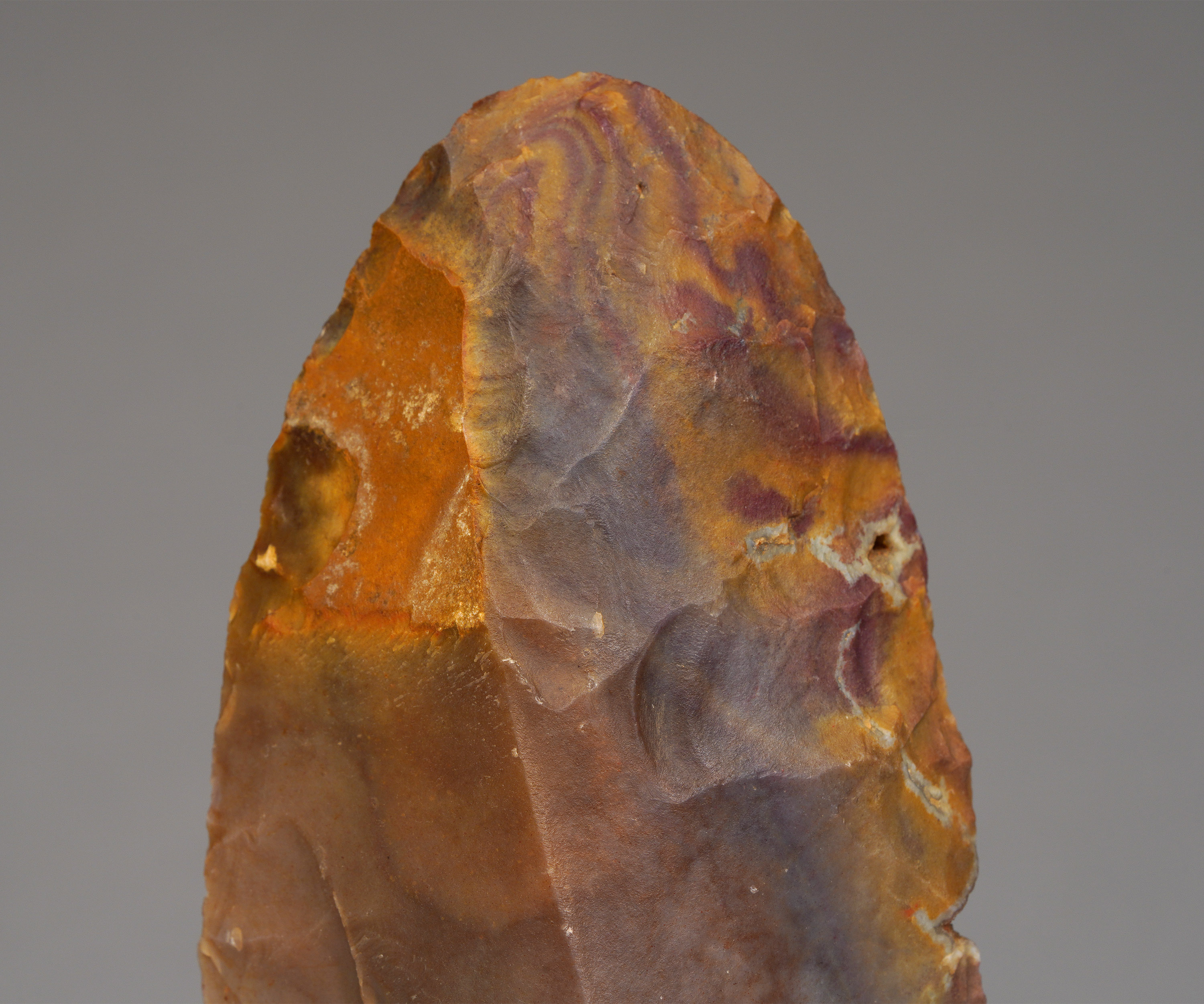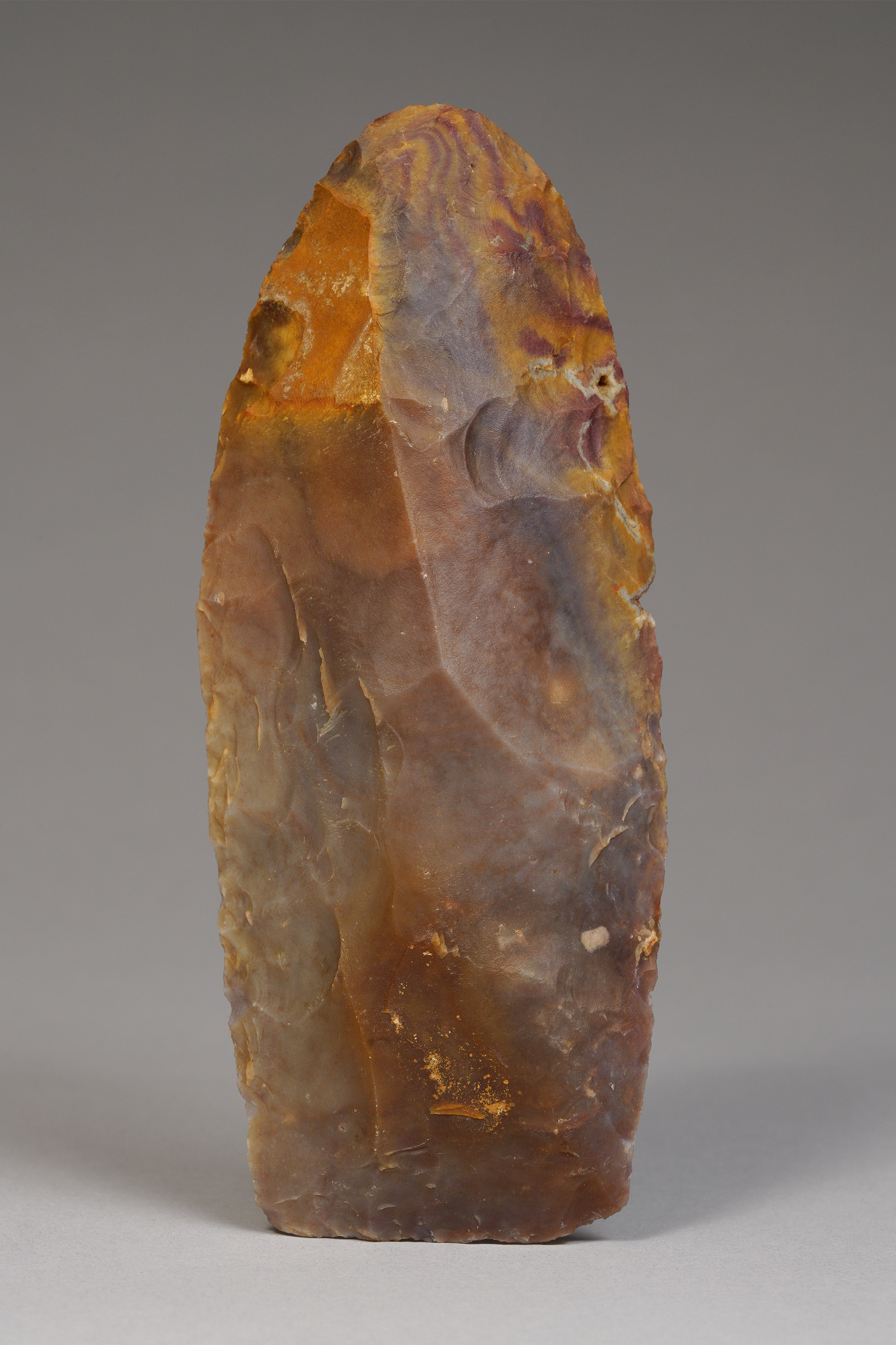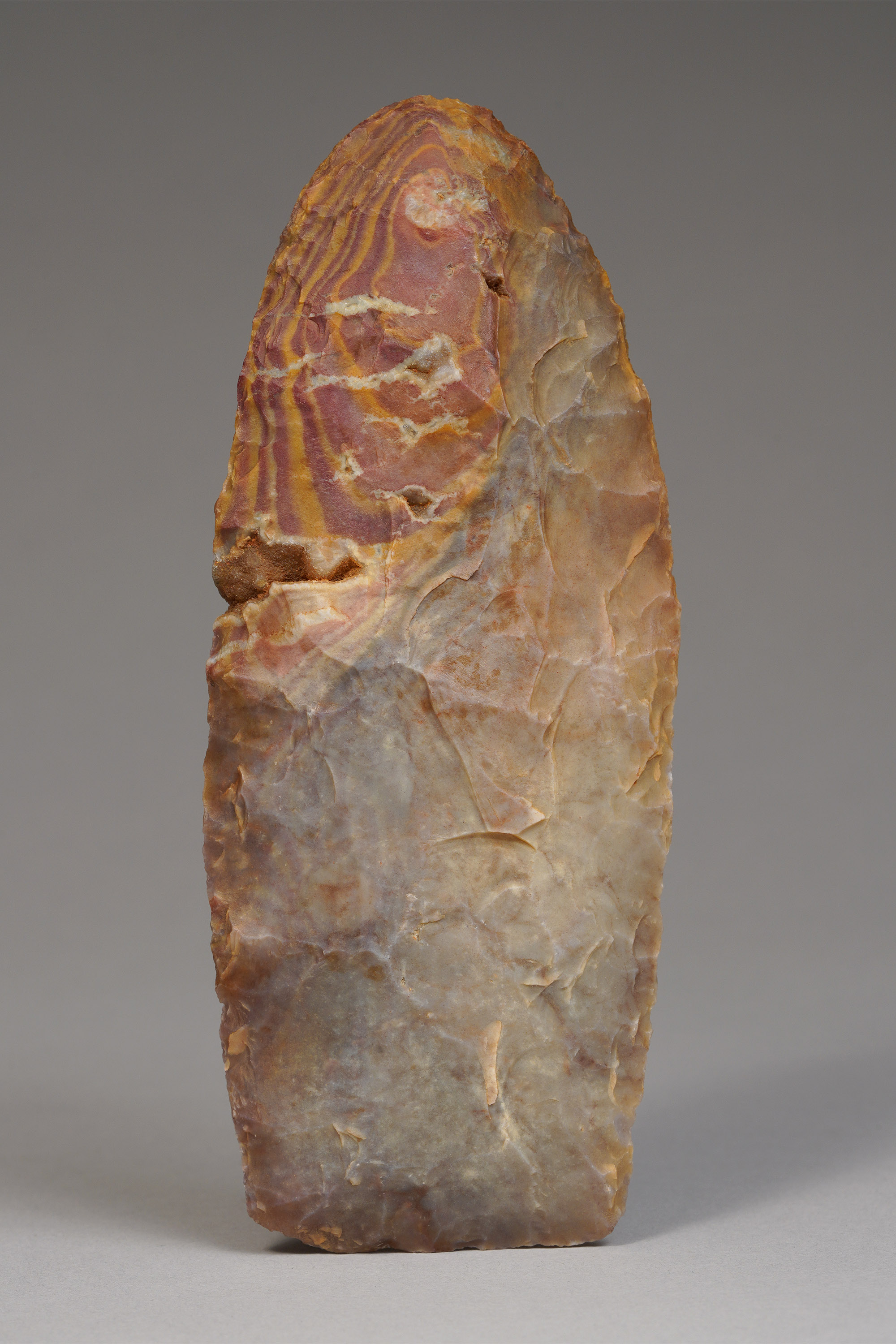 Axe blades such as this were made out of exceptionally high-quality flintstone / agate and belong to the Tenerean neolithic complex in West Africa. They are around 6000 years old. They were produced by specialized flint knappers who also made arrowheads and other tools. Most of them were found in Niger, but there were ateliers in (modern-day) neighboring countries as well. The axe blades had different shapes based on their function / purpose, and when in use they were polished and sharpened along the outer edge. Gradually the axe blades became shorter and were resharpened until they were too small to work with. Most of the axe blades found are in the first stage, simply knapped and ‘fresh’ (found in close proximity to the ateliers). When used and re-sharpened they were dispersed around a wide region, and are much more difficult to find today (Pers. communication, Michel Van Den Dries, 2025).