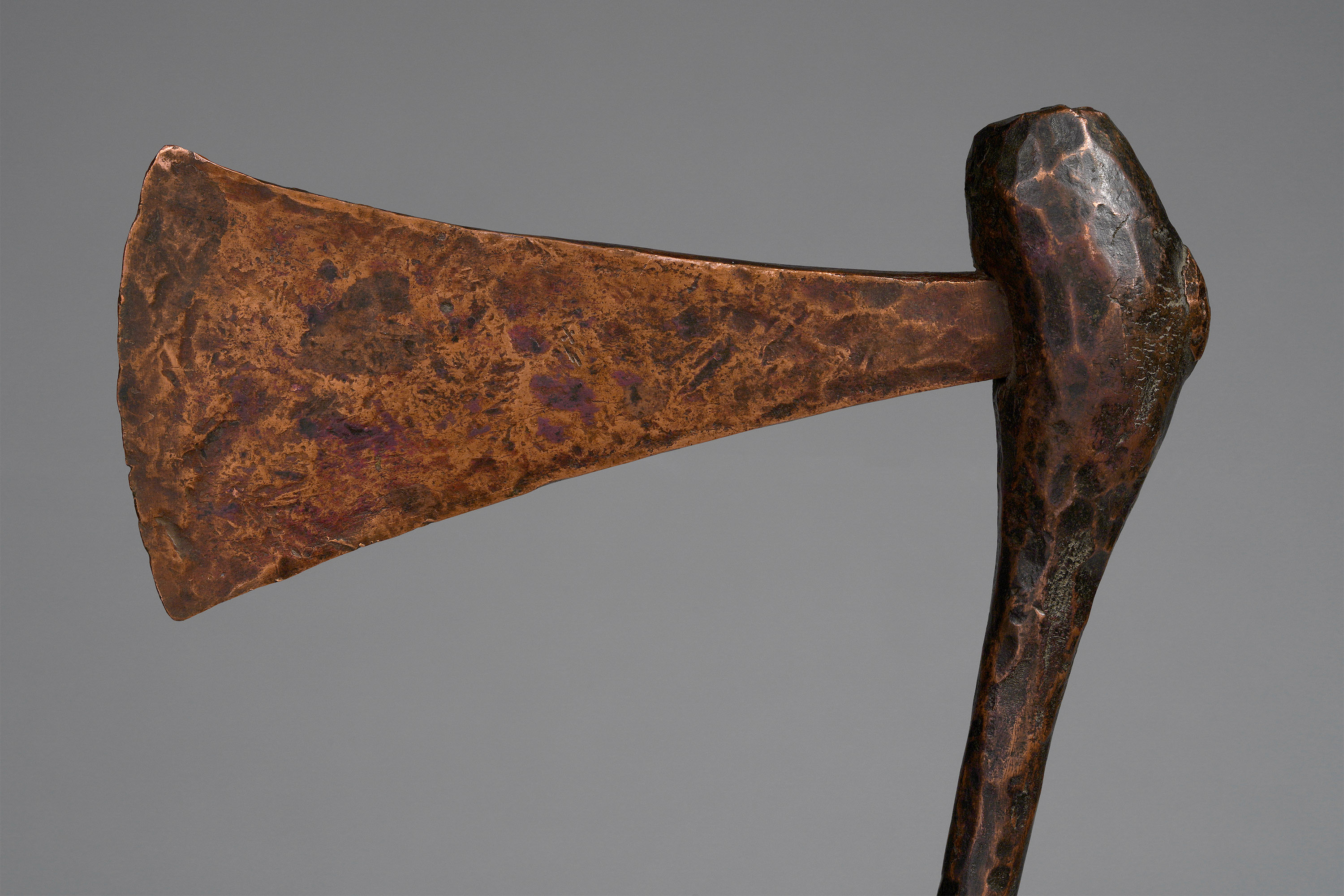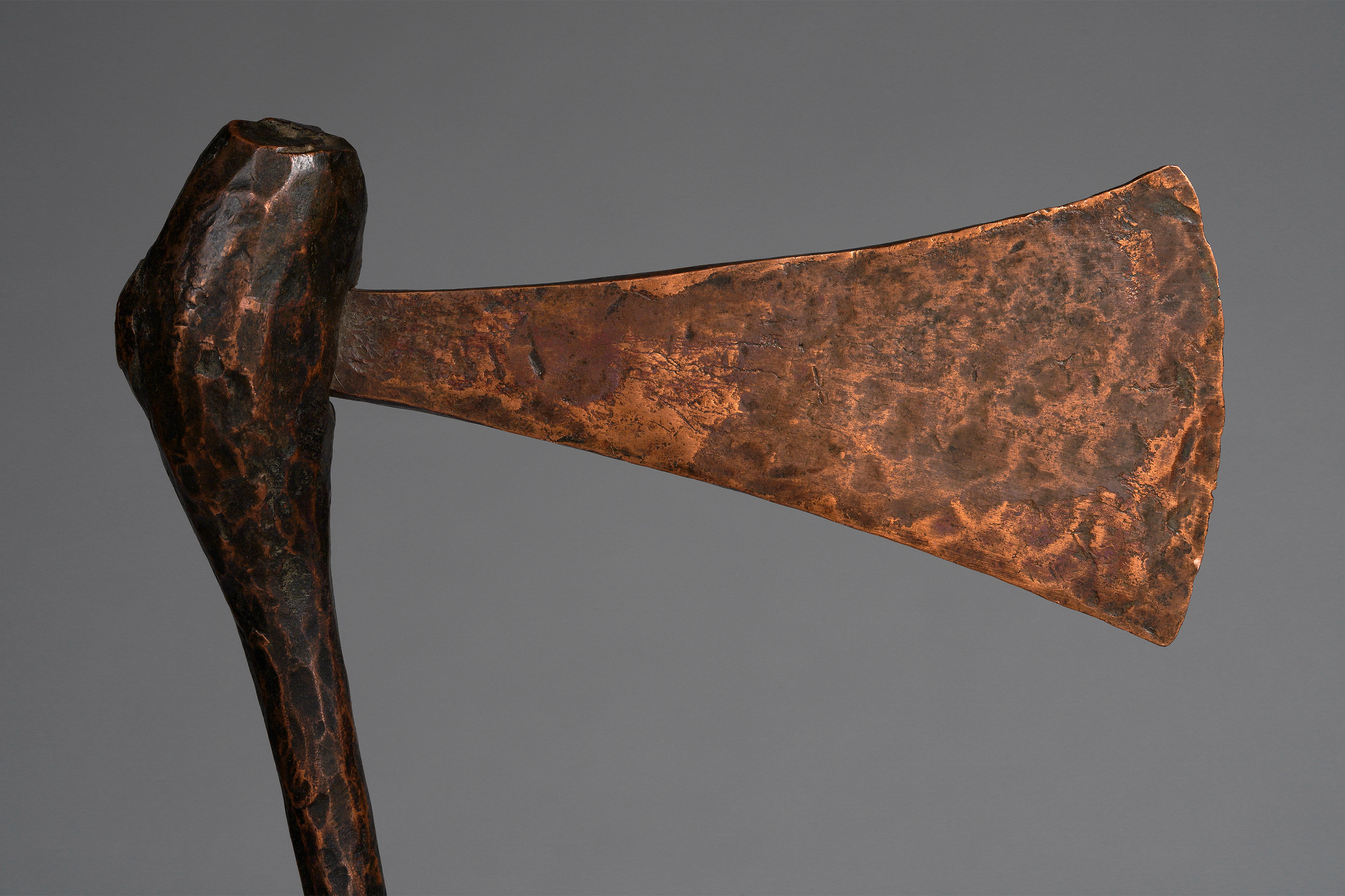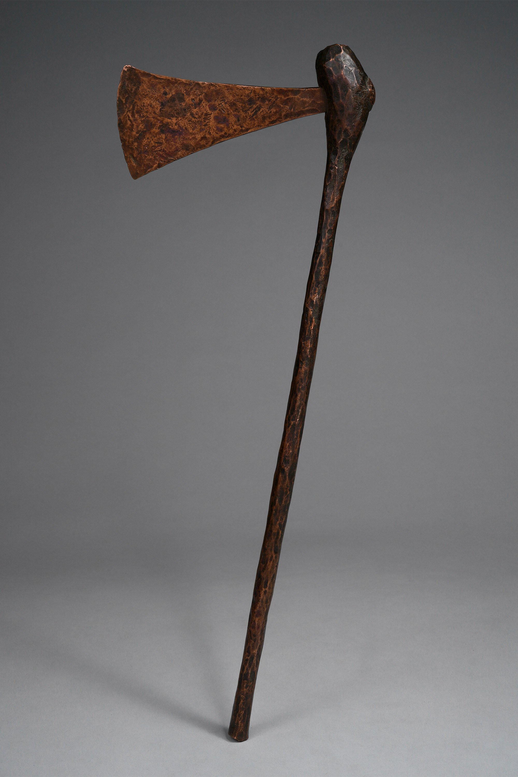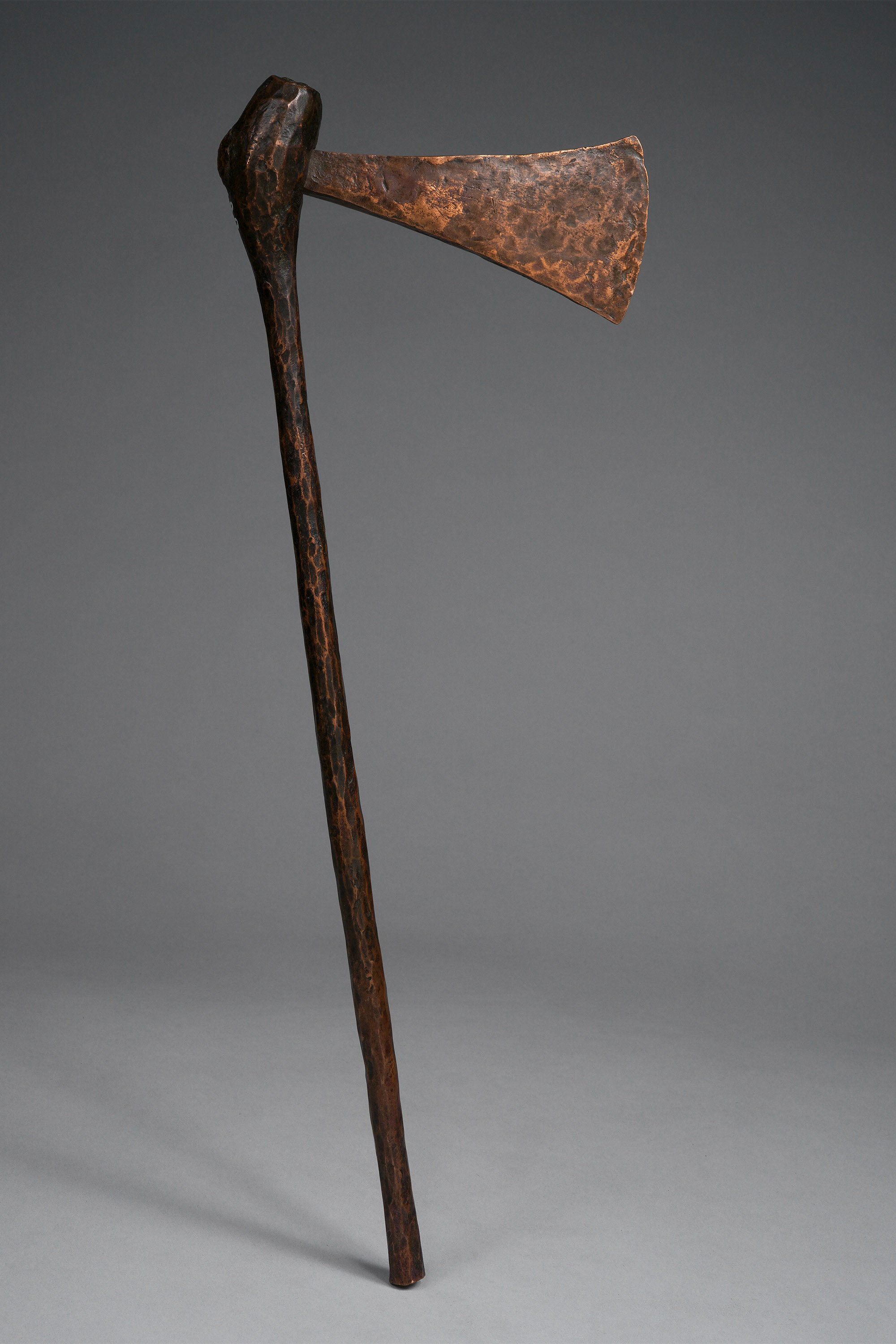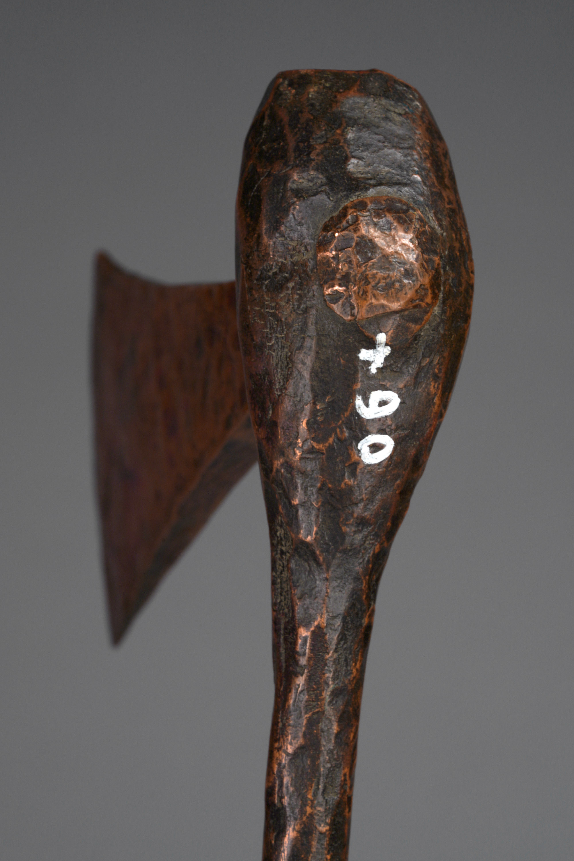 There are very few axes of this type that have been collected. Four of them are in the collection of the Pitt Rivers Museum (acquired 1907), one is in the British Museum (acquired 1954), and a select few can be found in private collections. Both museums’ attributions are uncertain and inexact, but it seems the proper cultural attribution is the Ila of Zambia. The Pitt Rivers catalogue note indicates: “Southern Congo Free State (North of Broken Hill), Kakanda Village. Conventional axe of pure copper, obtained by the natives by smelting malachite. Used as an article of luxury and as a form of currency” (“Axe; currency,” British Museum, Af1954,+23.1592 ; “Copper axe with thin cylindrical handle,” Pitt Rivers Museum, 1907.82.3-6; Smith, Edwin William, The Ila-Speaking Peoples of Northern Rhodesia, 1920; Wolf-Dieter Miersch, pers. communication, May 17, 2020).
