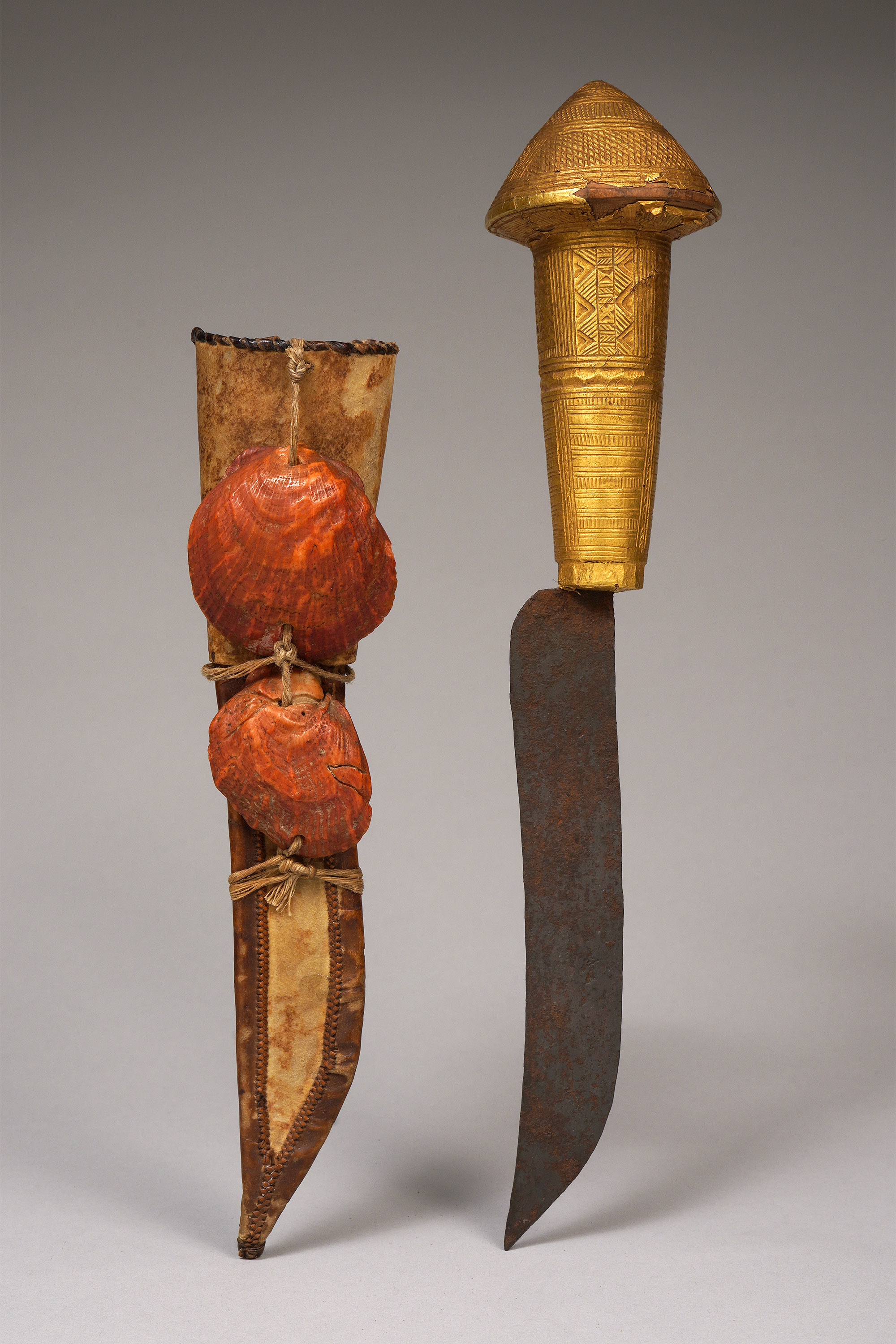 According to Cornelia Rink-Hollnberger, the shells attached to the leather sheath belong to the spondylus family, and while they are naturally red, they were polished by the Baule to give them a smoother surface and to emphasize their color (Elsen, De fer et de fierté, 2003; Zirngibl, Rare African Short Weapons, 1983).