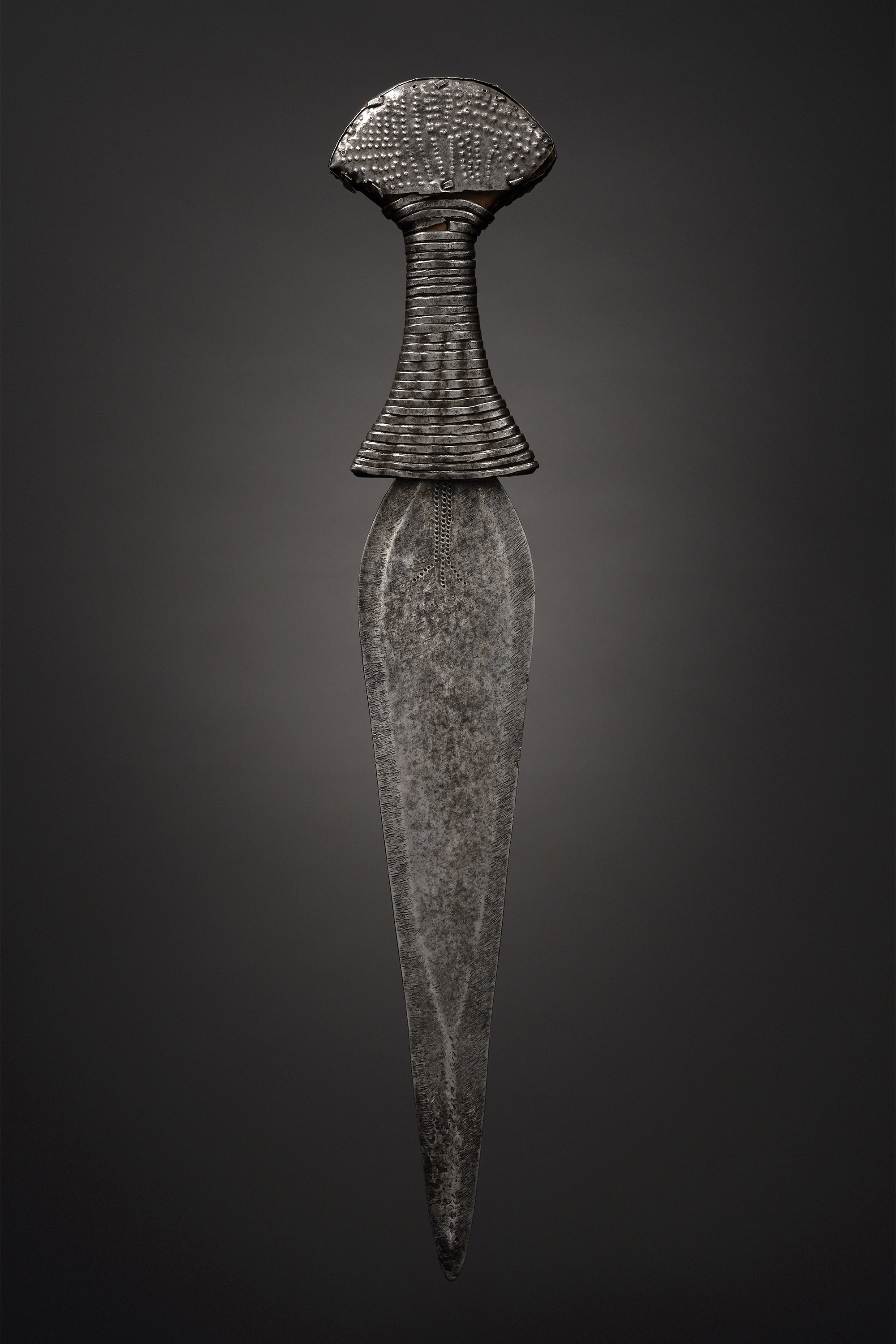 This symmetrical short sword was displayed as a symbol of prestige among a number of tribal groups who belong to the Gbaya family. Most often attributed to the Lobala, it was also the prerogative of a number of smaller tribes who were collectively known as Ngiri, and included the Bondjo, Mondzombo, Ngbaka, and Mbanza (Elsen, De fer et de fierté, 2003).