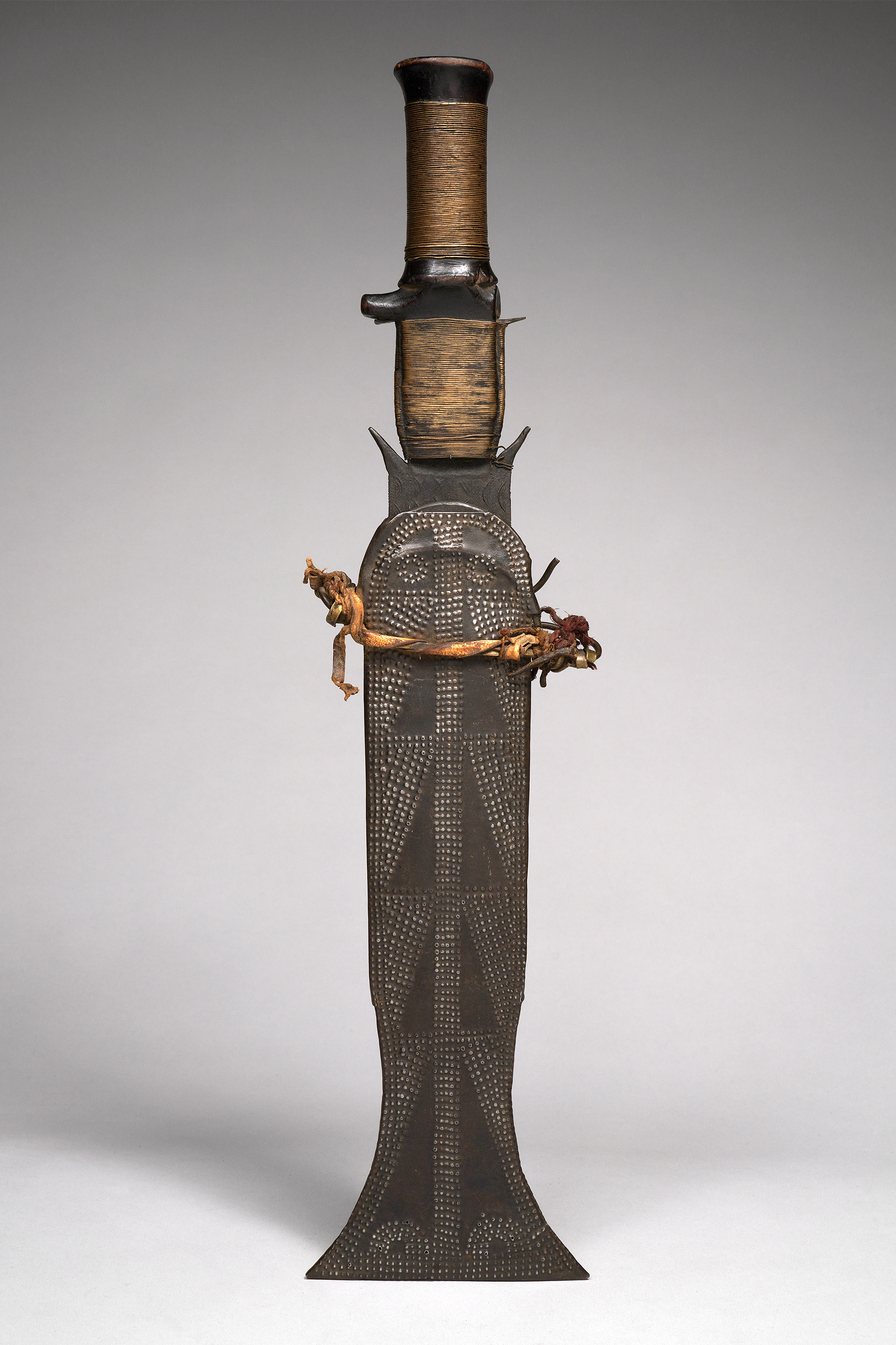 This fine short sword with its original sheath comes from the Fang, who inhabit the rainforest in an area that stretches over three countries. The sheath, called abam, is composed of two wooden boards typically covered with stitched lizard skin from the Ornate monitor (Varanus ornatus), however on this rare example, the sheath is covered with an embossed iron sheet. While primarily a symbol of status, these blades were also used in a ceremonial context, and are very functional as well, with two sharp cutting edges (Elsen, De fer et de fierté, 2003).