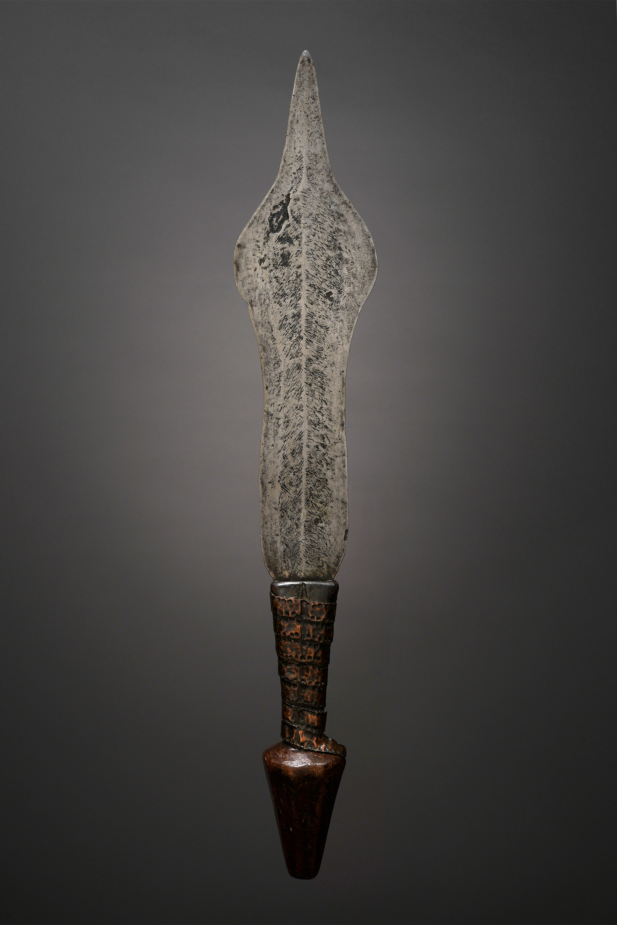 The blacksmiths of the Mongo complex produced a highly varied assortment of knives with a leaflike shape such as this example. While primarily functioning as prestige weapons, they could also be used in combat (Elsen, De Fer et De fierté, 2003; Zirngibl & Kubetz, Panga Na Visu, 2009).