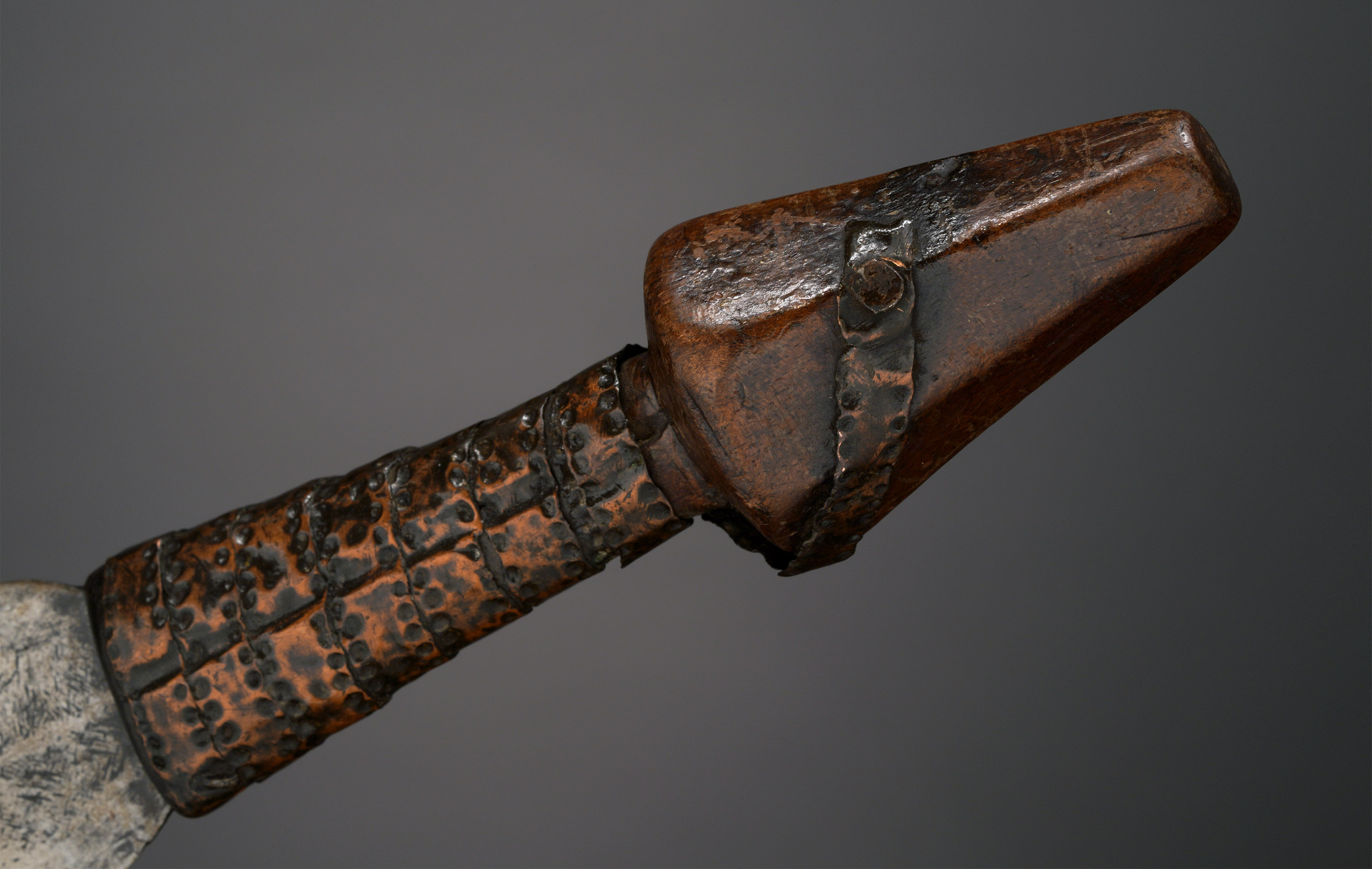 The Ngandu and Saka, who live along the Maringa and Tshuapa Rivers in west-central D.R. Congo, created short swords with this distinctive blade and handle shape.