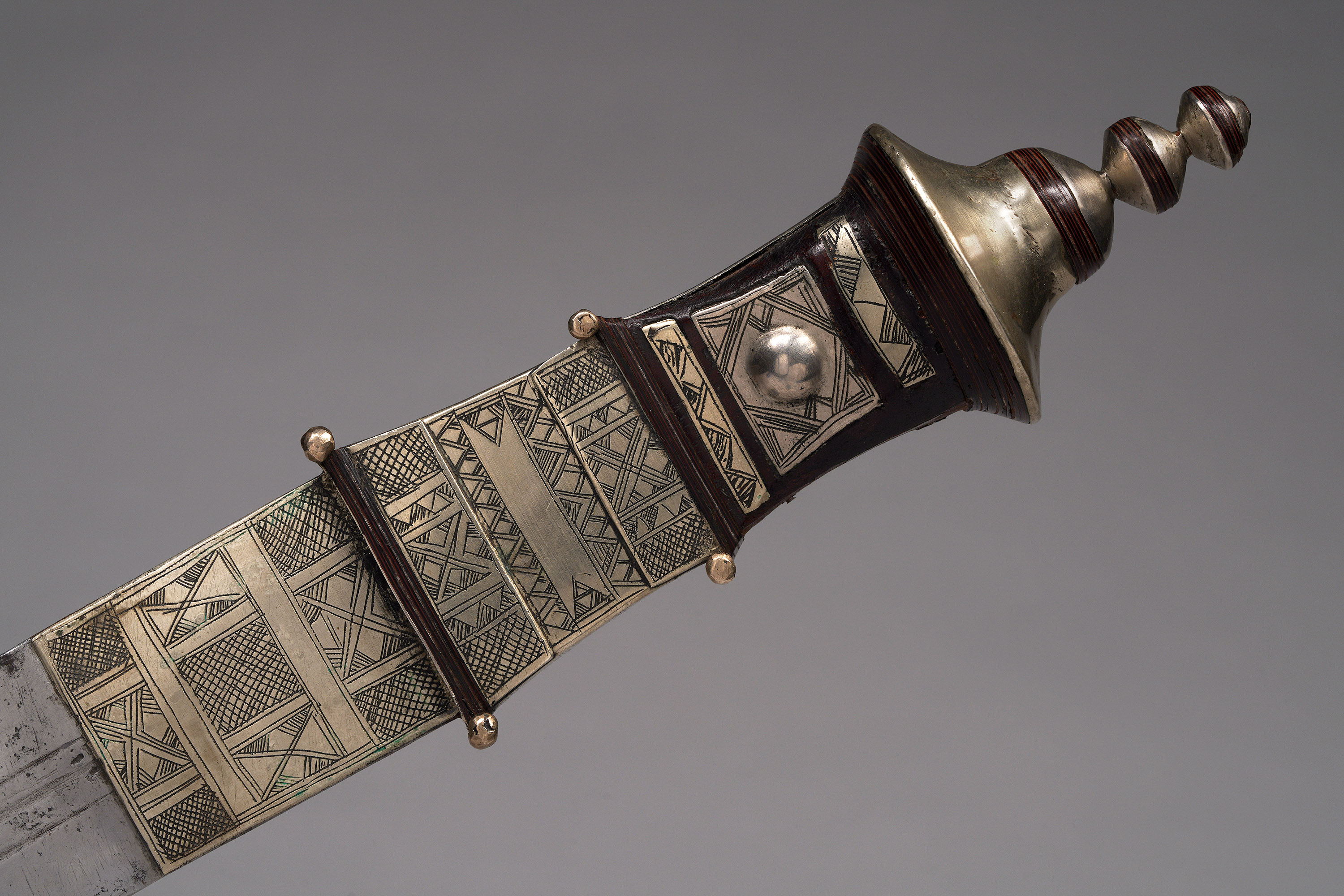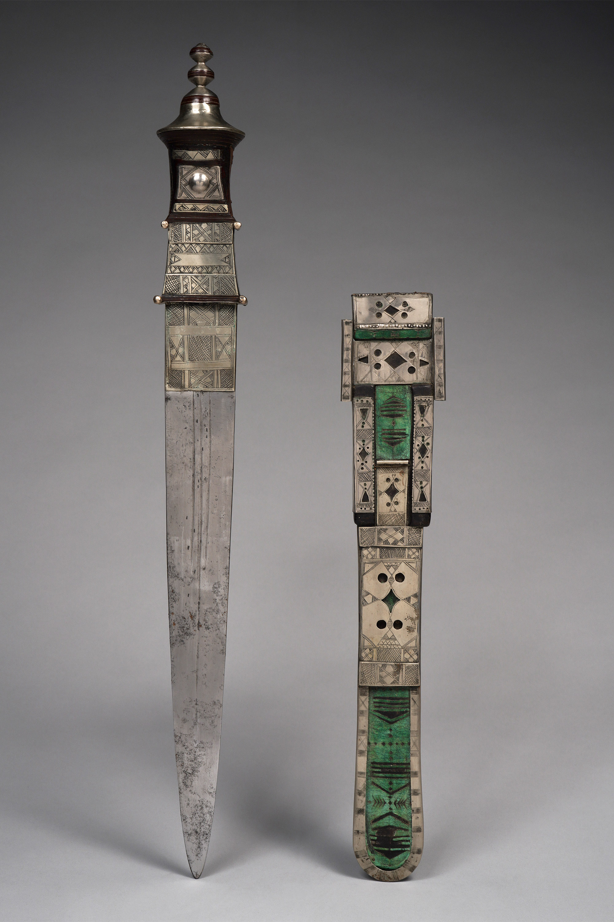 The proud Tuareg ethnic group lives in the areas of southern Algeria, Mali, Niger, and Burkina Faso. Similar to the swords of the Fulbe warriors, those of the Tuareg also have traditional geometric decorations on the sword and the scabbard (Zirngibl & Kubetz, Panga Na Visu, 2009).