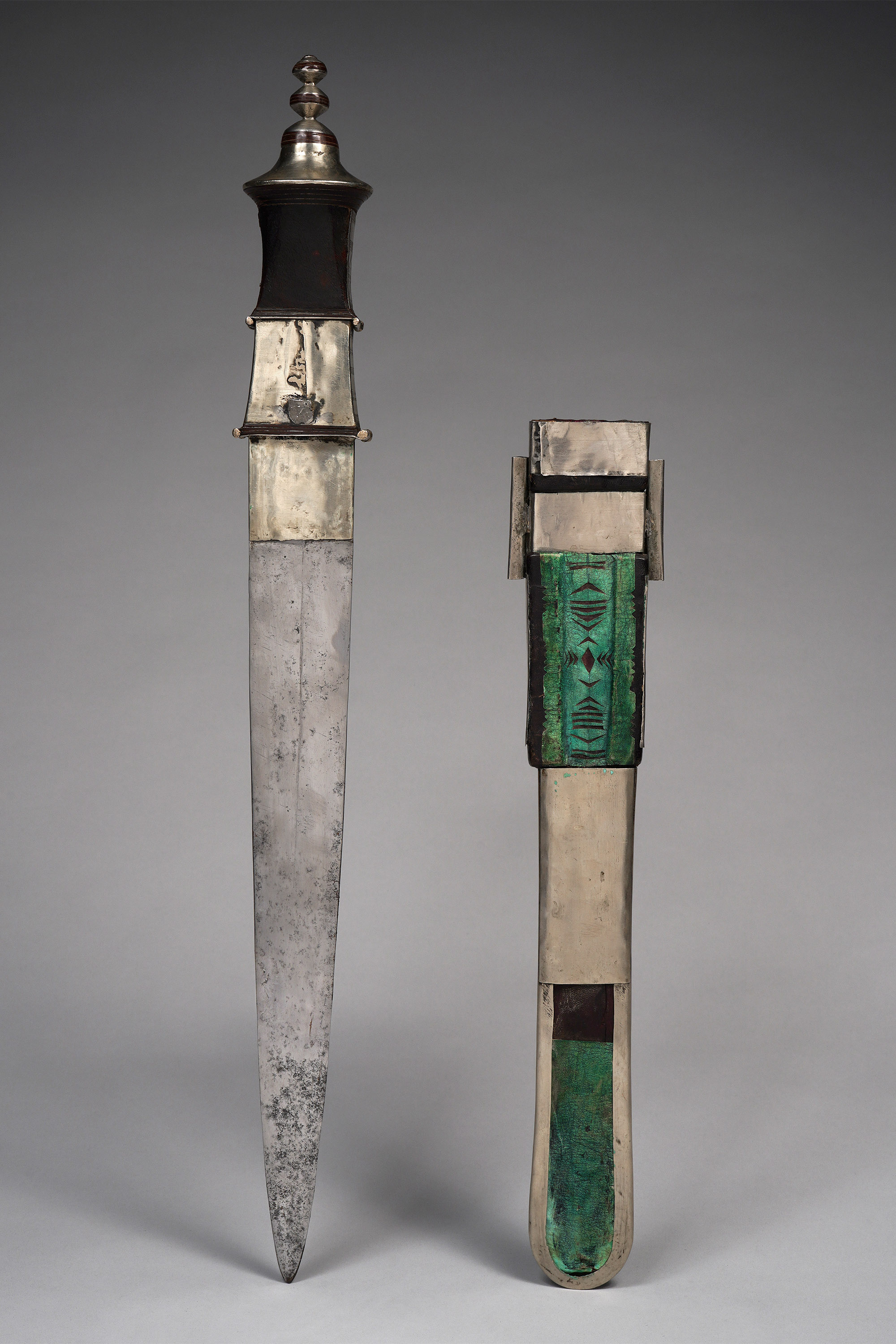 Iron, wood, silver, leather
