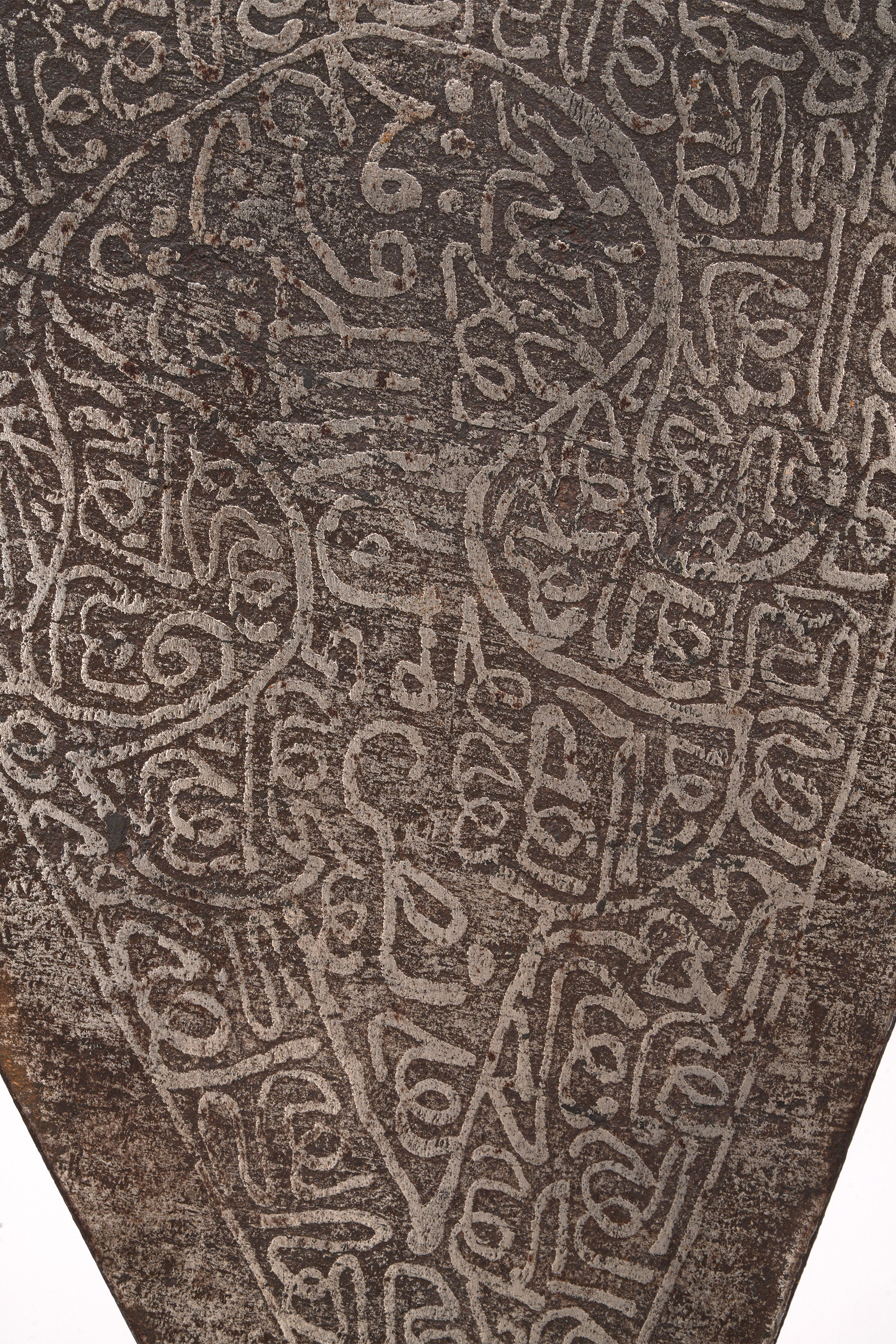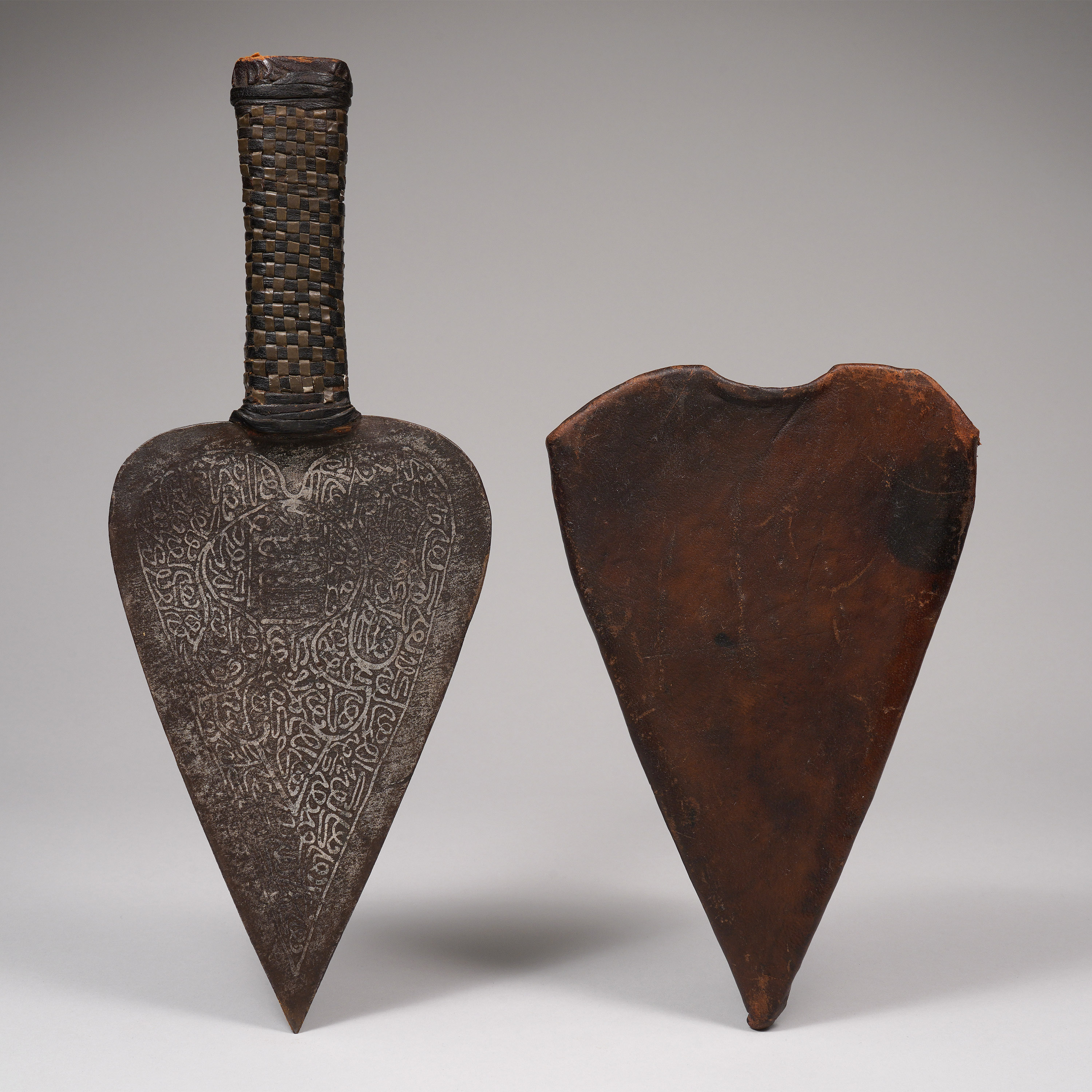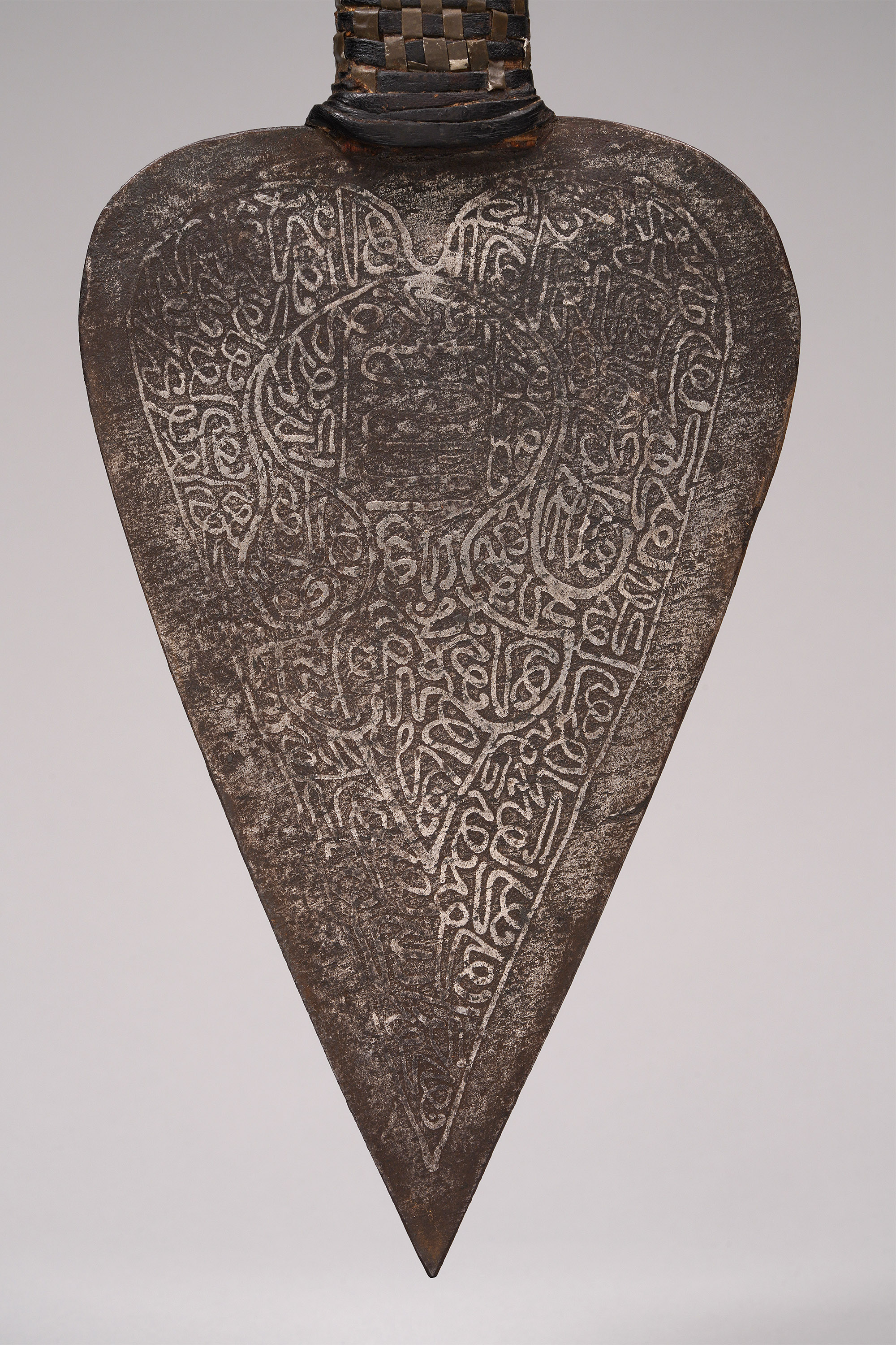 Like many Mahdist blades, this piece is covered with acid-etched Arabic script known as thuluth, in which exhortations to the faithful from the Koran are written. Sometimes, thuluth script also included personal messages from the artisan, praising the person for whom the knife was made (Spring, African Arms and Armor, 1993; Tirri, Islamic and Native Weapons of Colonial Africa, 2007; Westerdijk, The African Throwing Knife, 1988).