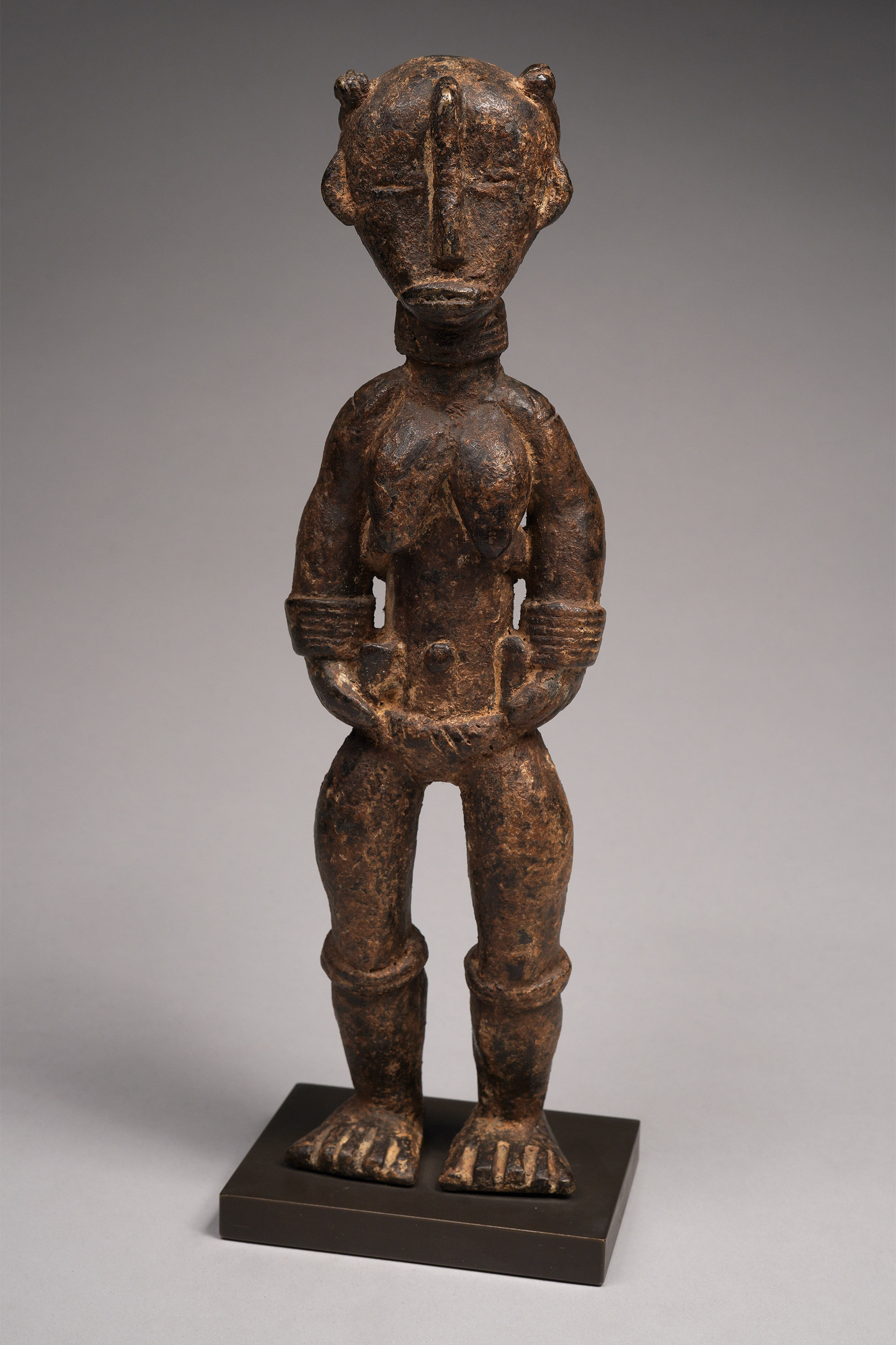 Large Dan figures of this type were created in the 1920s/30s, after bronze anklets were outlawed. Recycling the metal, Dan blacksmiths created secular objects that were substantial, such as this piece. The patina is complex, and suggests libations.