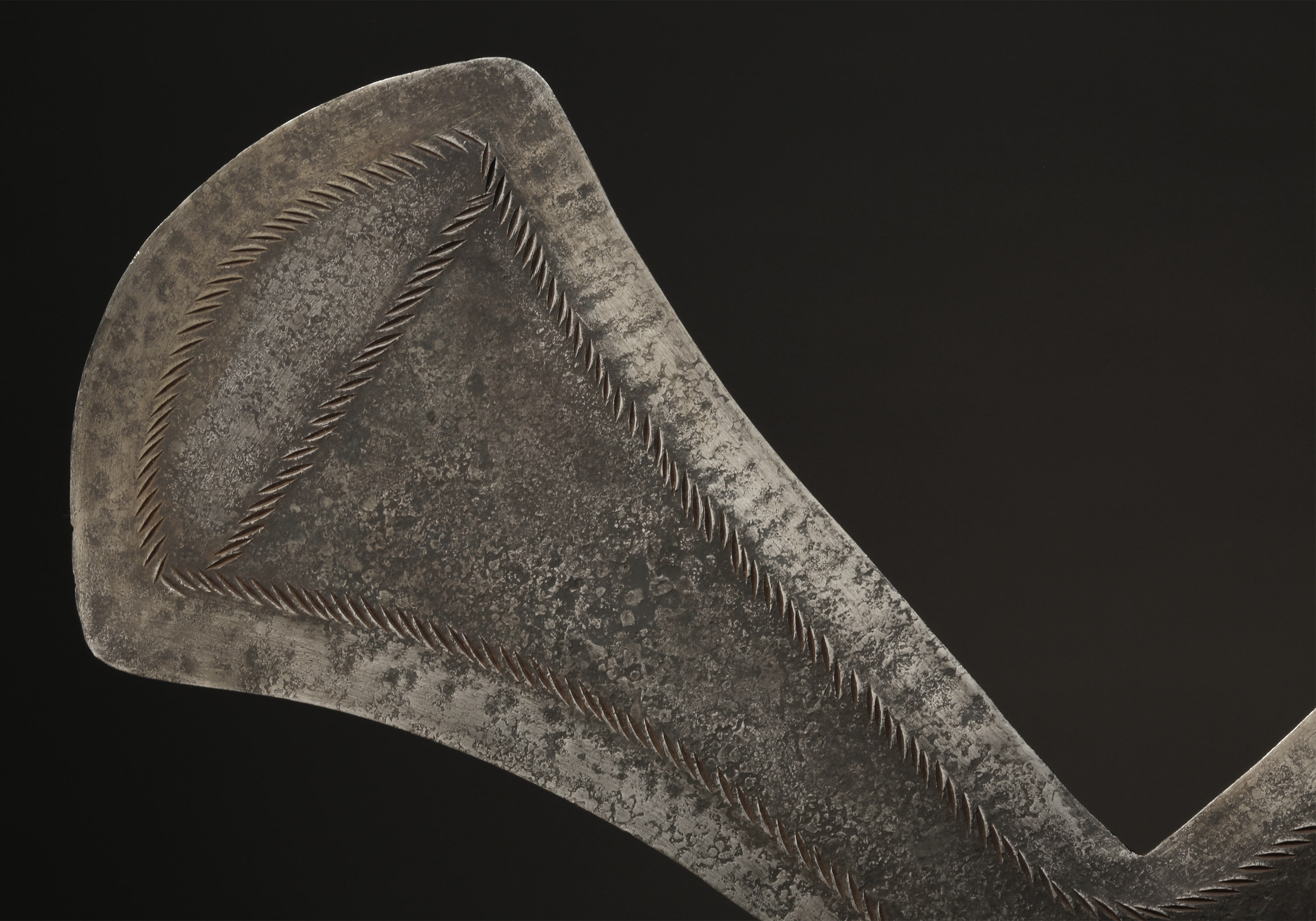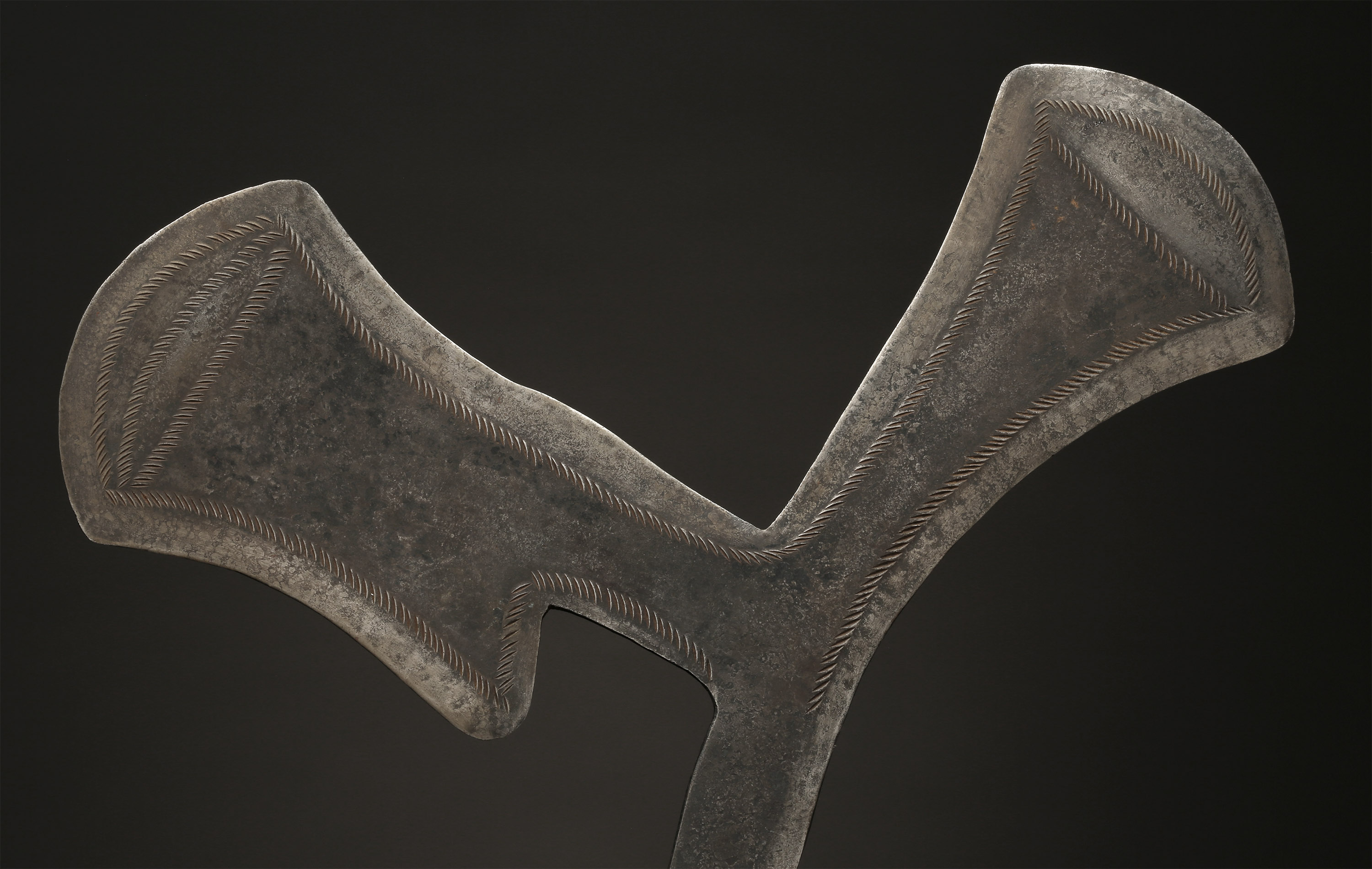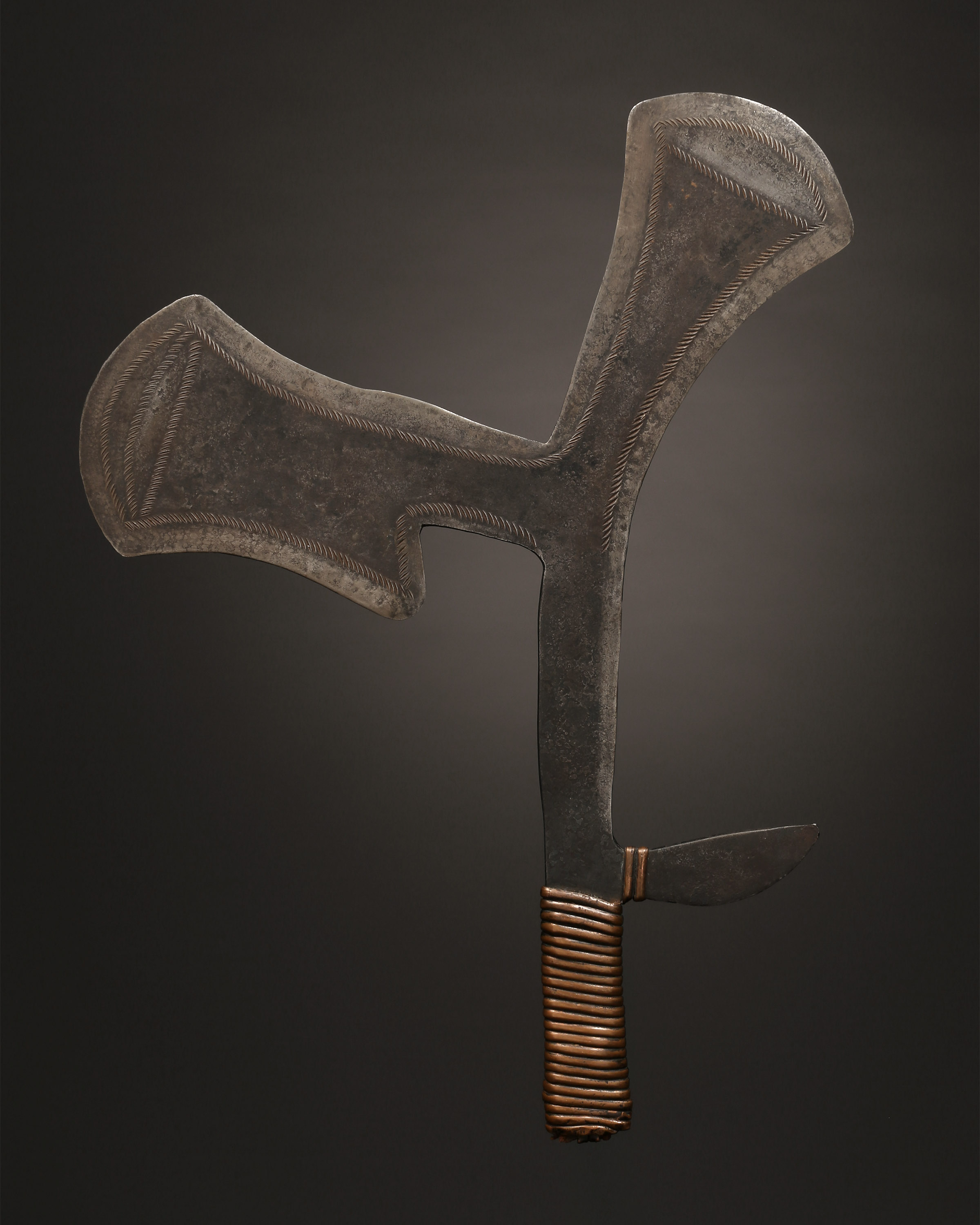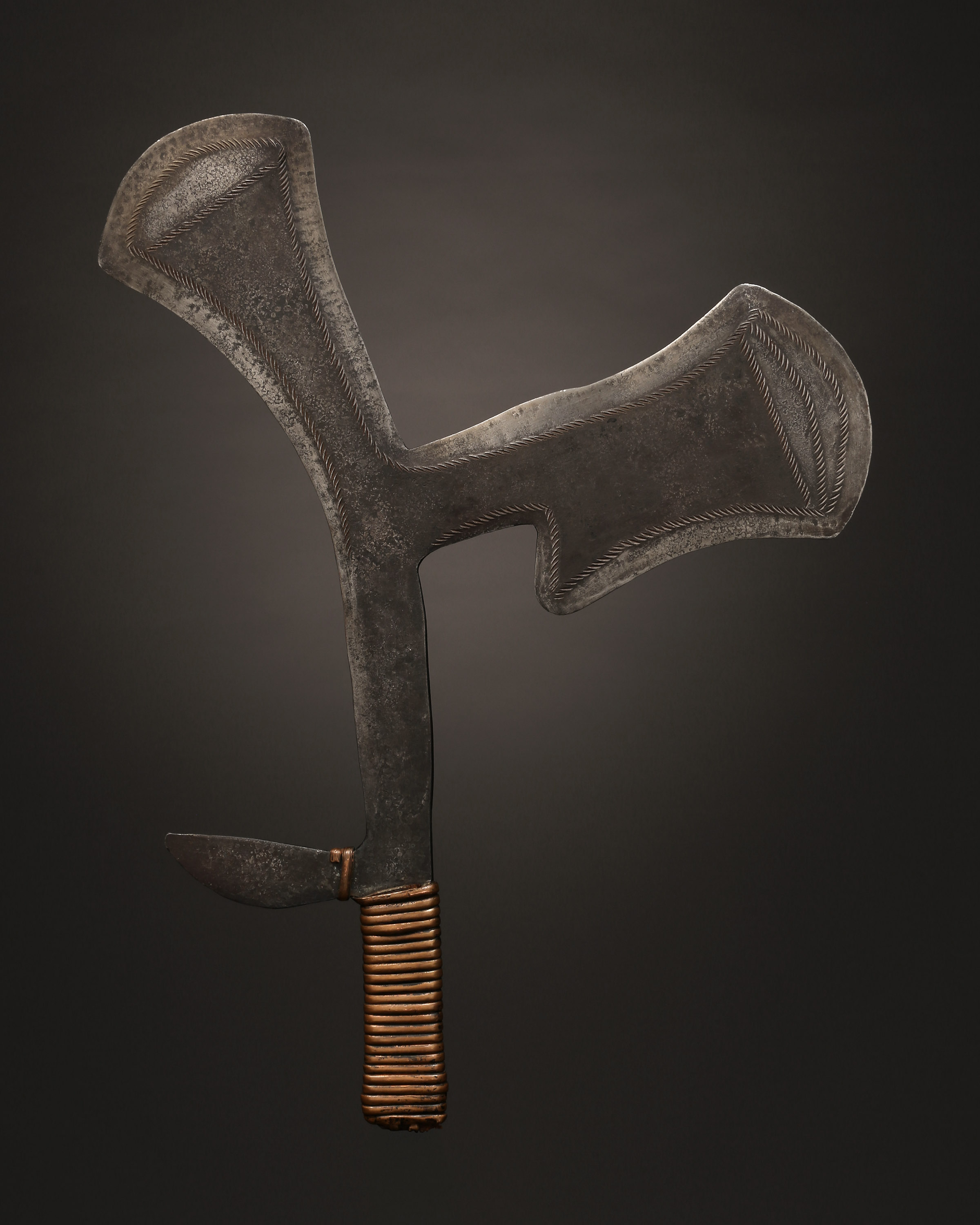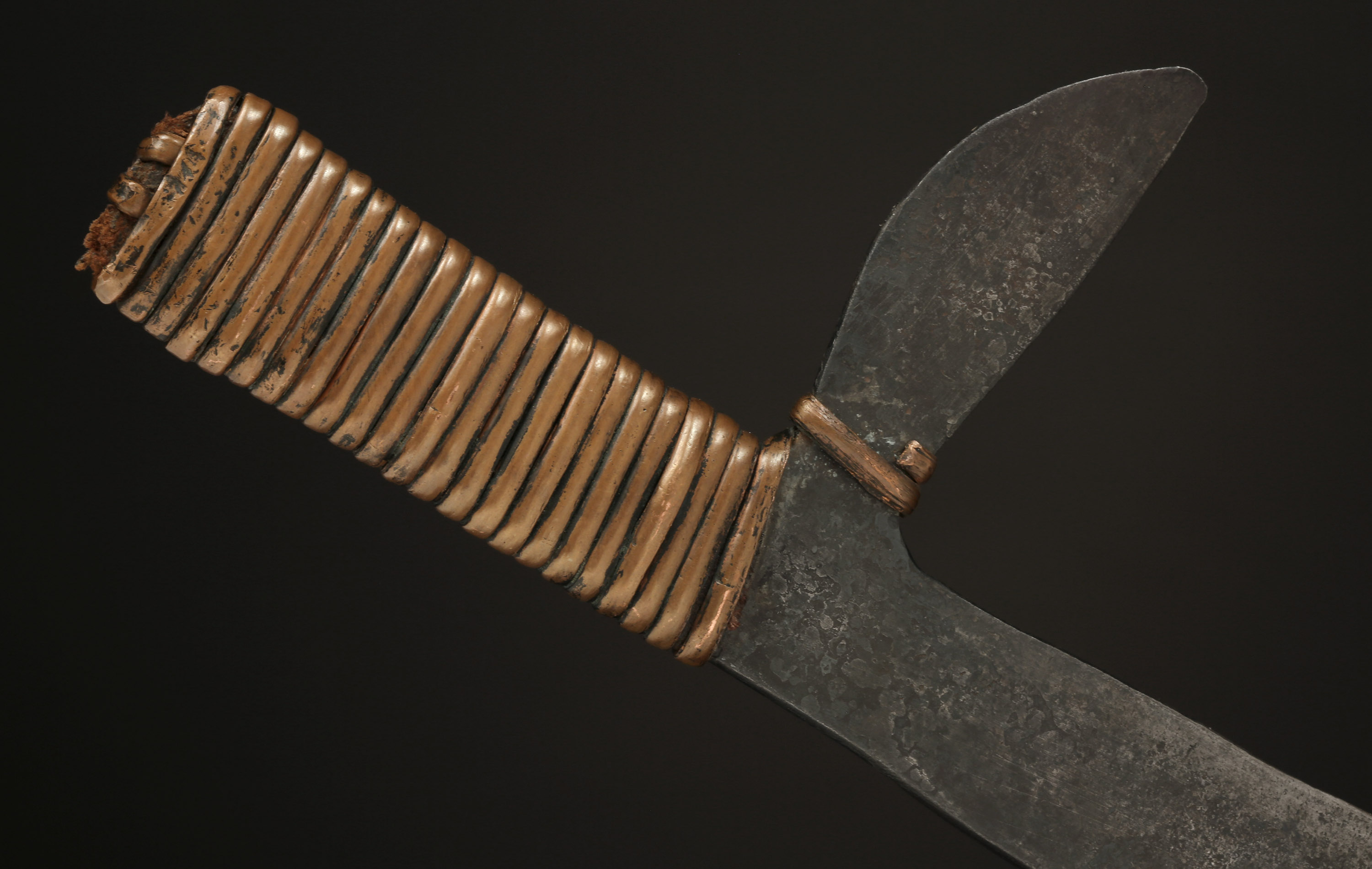 Inauthentic Prestige Blade Inspired by a Throwing Knife In the Style of the Ngombe / Doko / Mbanja / Ngbaka, D.R. Congo Iron, copper, leather Provenance dates back to 2003