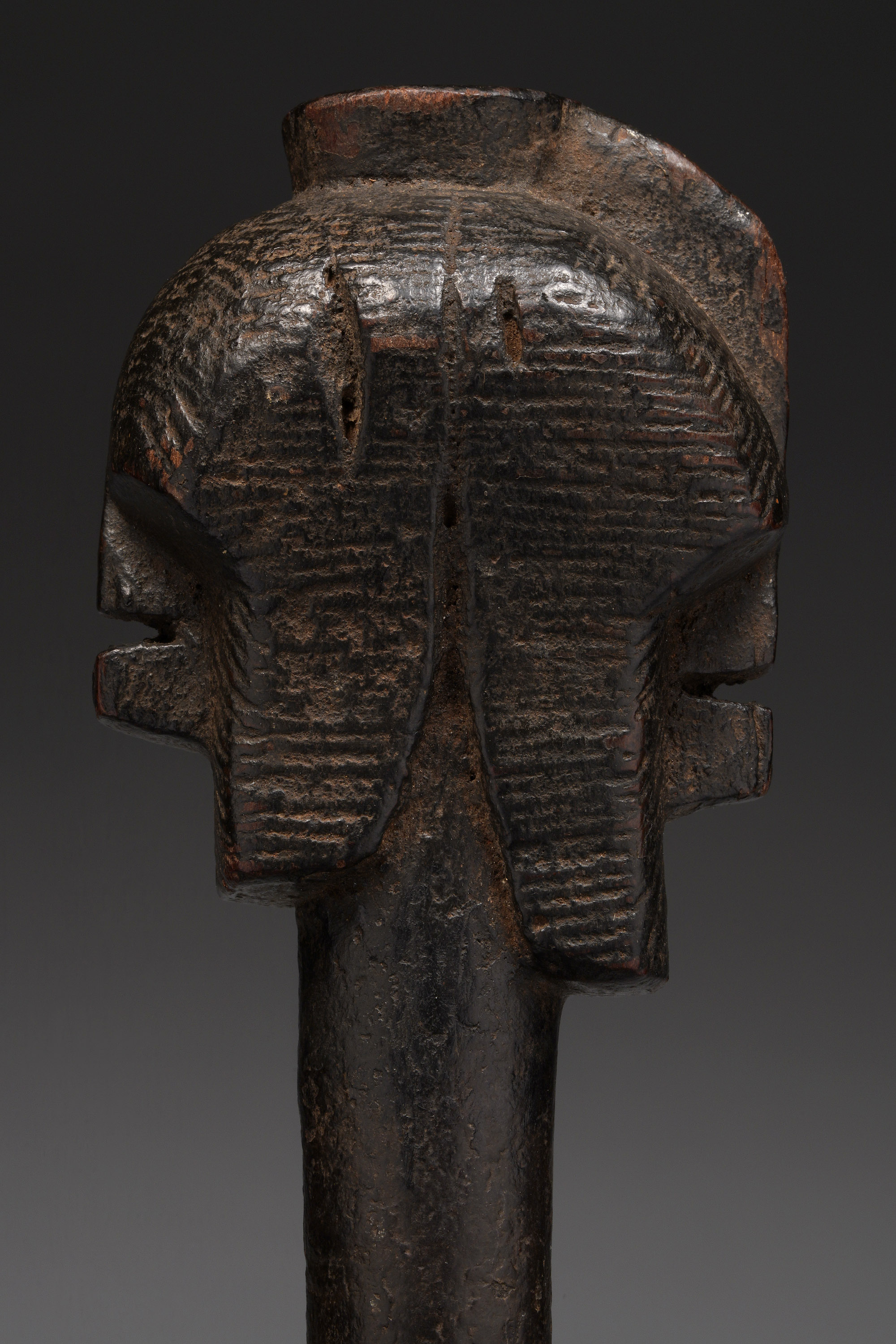 This piece has two iconic kifwebe masks carved into the handle - one male and one female. The carving style and iconography of the kifwebe masks is sincere and correct, and the handle exhibits appropriate signs of age.