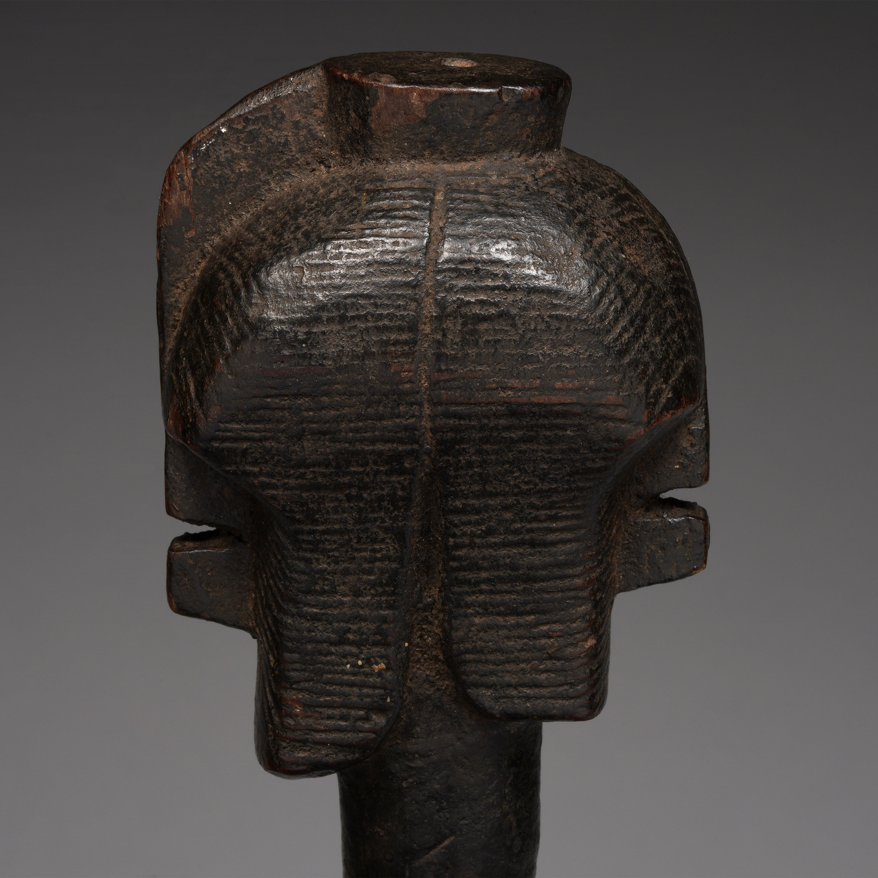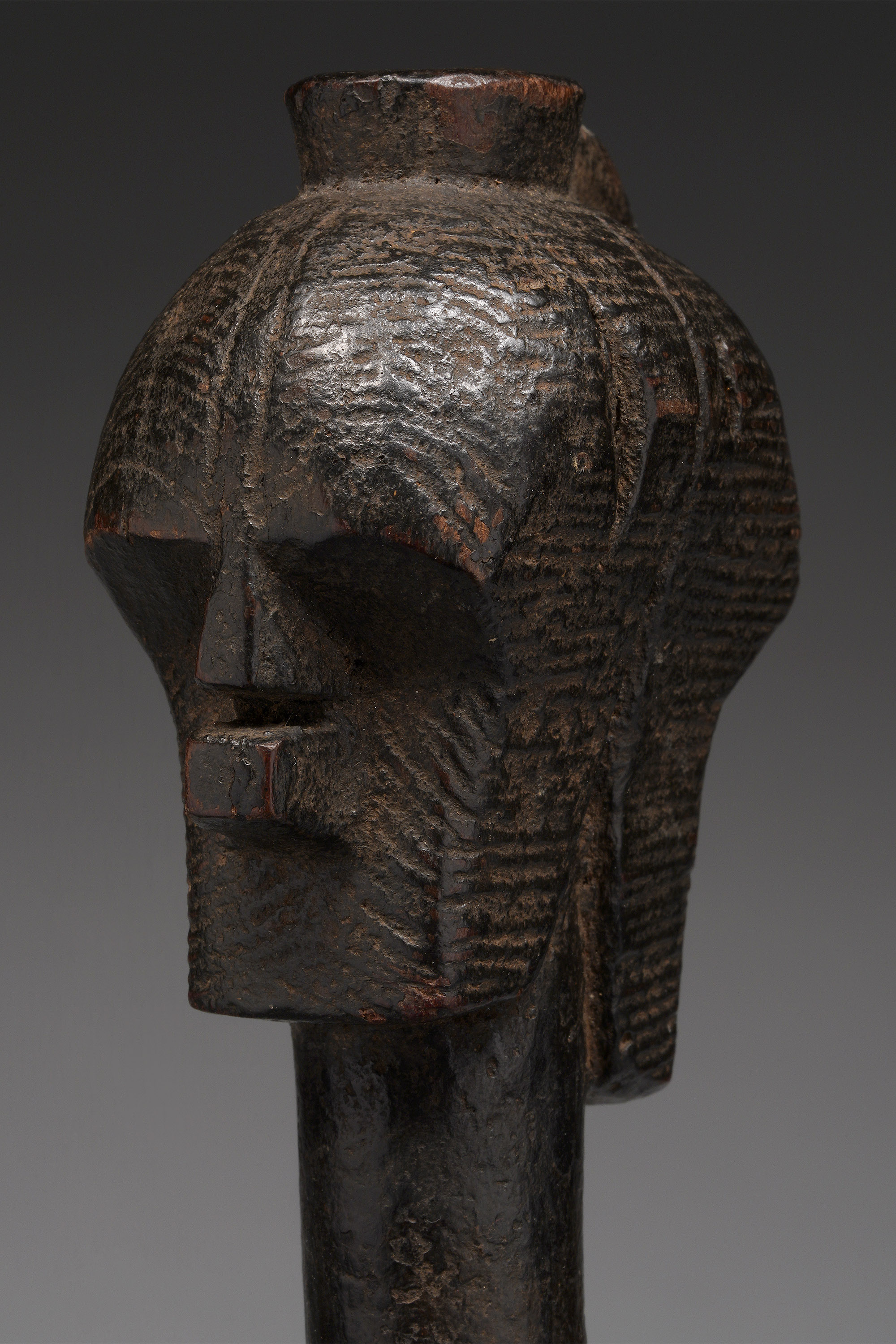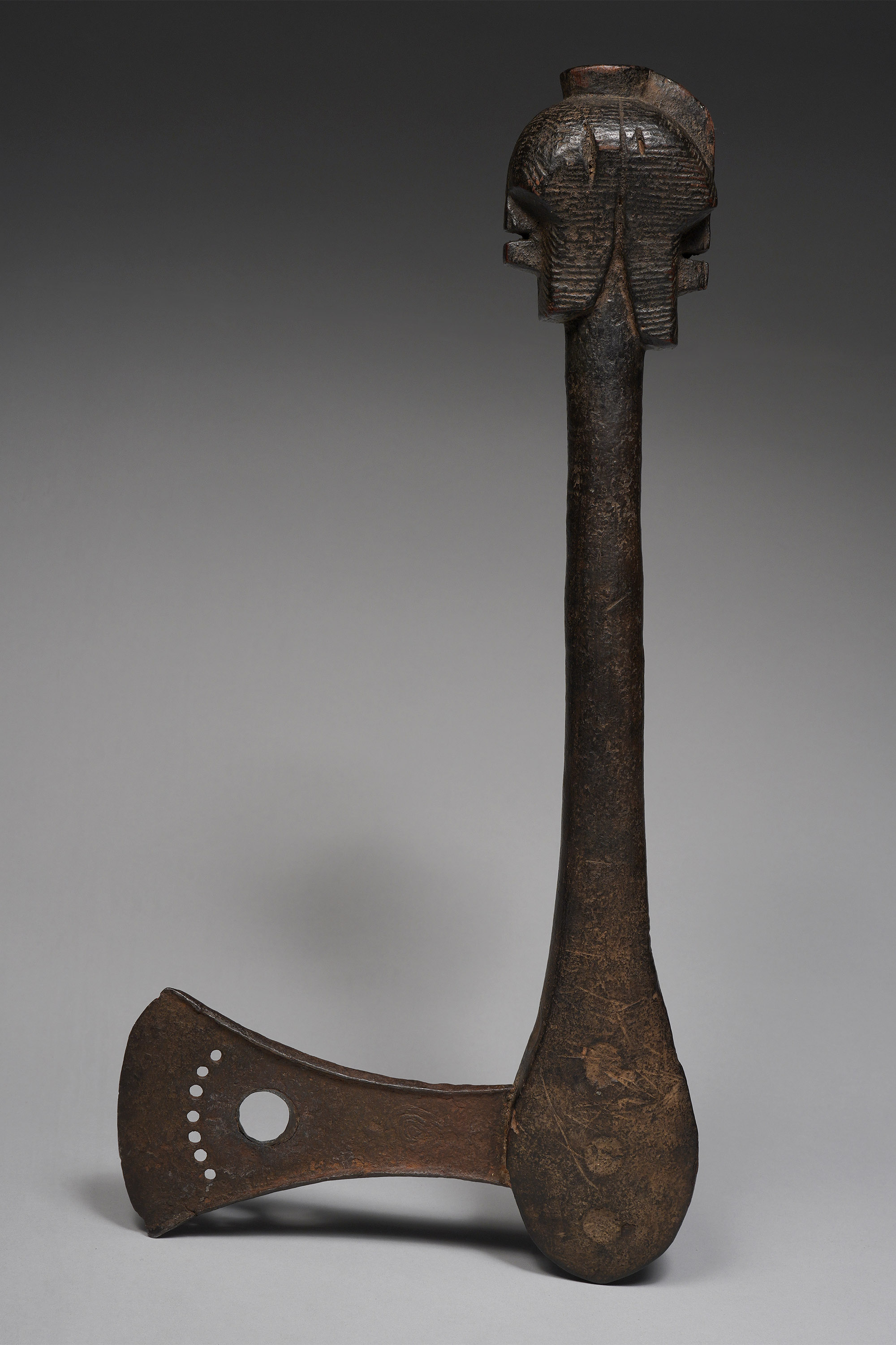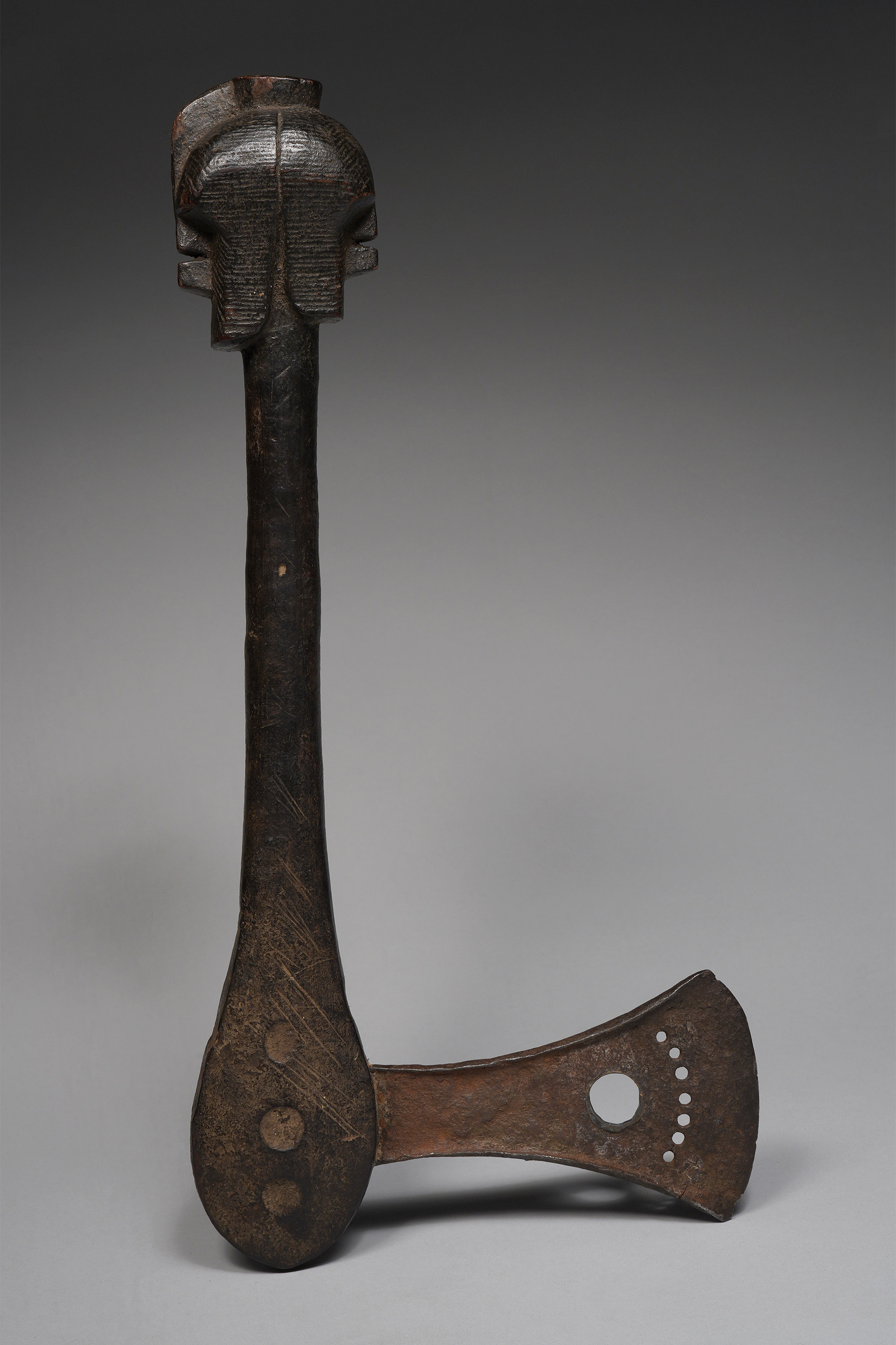 This type of axe, known as kilonda, was mainly produced by the Songye, but also by the Nsapo and Luba. Though their shape was largely inspired by functional weapons, they were strictly symbols of prestige and pageantry.