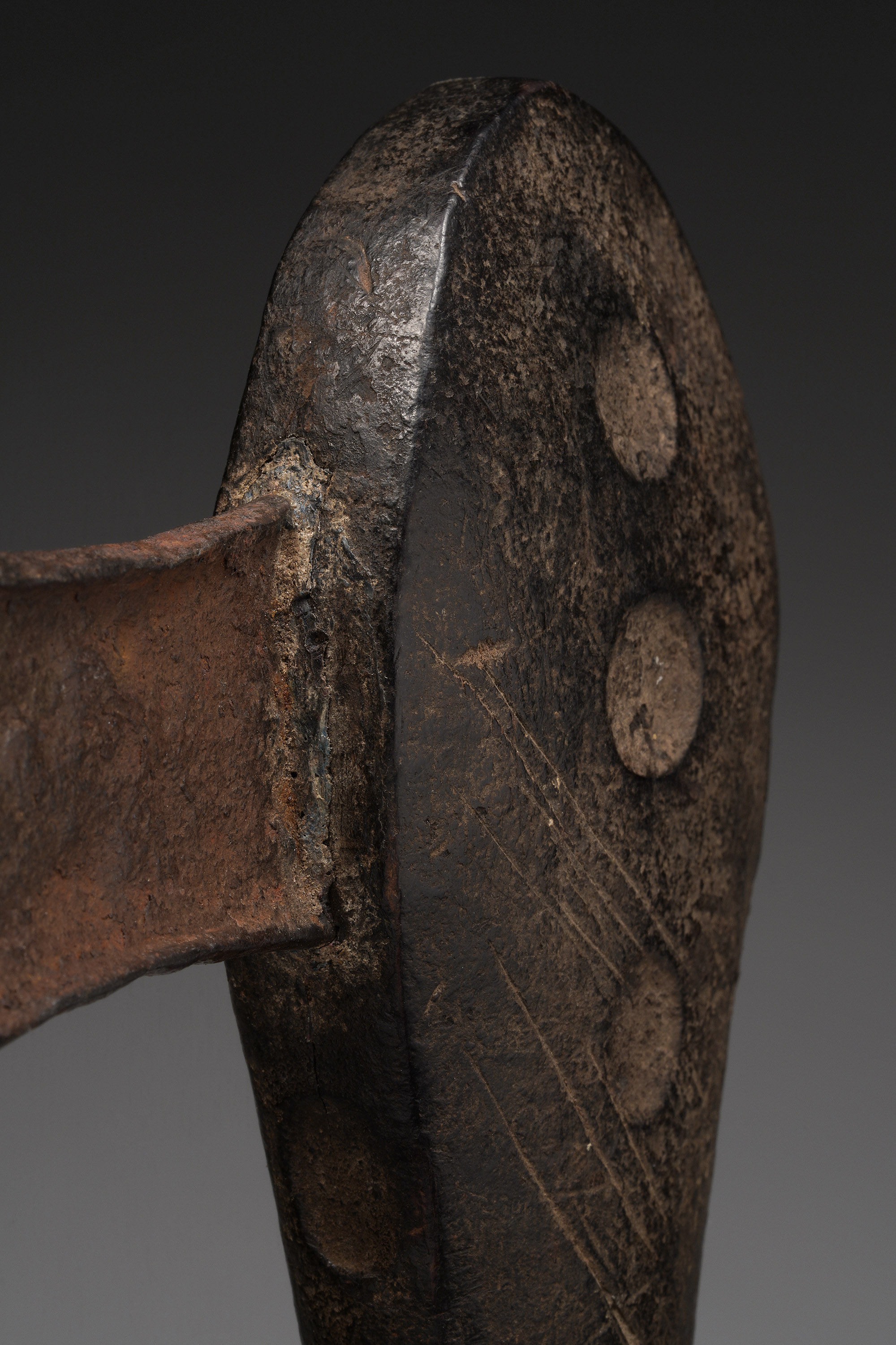 The blade, however, is problematic: the tang does not extend through the handle, there is adhesive applied where the blade meets the handle, and the copper alloy rivet is a fragment. Rather than remove the blade (which is clearly very old), I decided to retain it because there is a chance it is original and simply damaged or repaired.