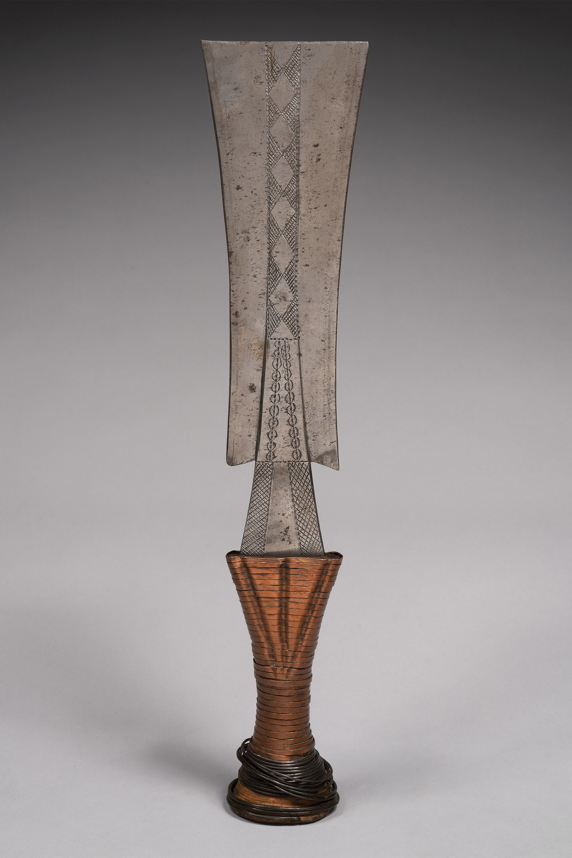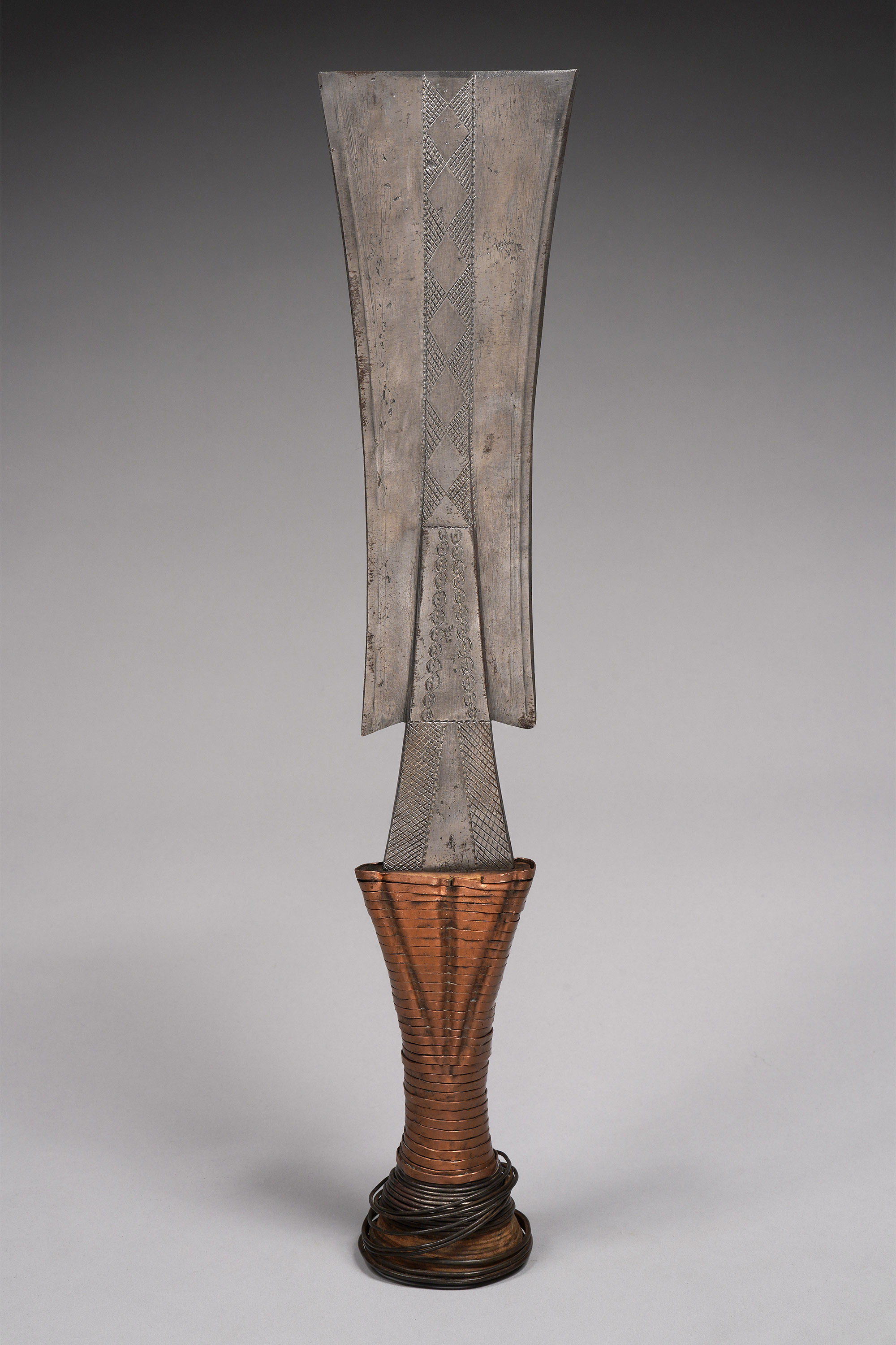—The handle wrap consists of thick, rectangular copper near the blade and round or twisted iron wire (which is often loose or missing) near the butt