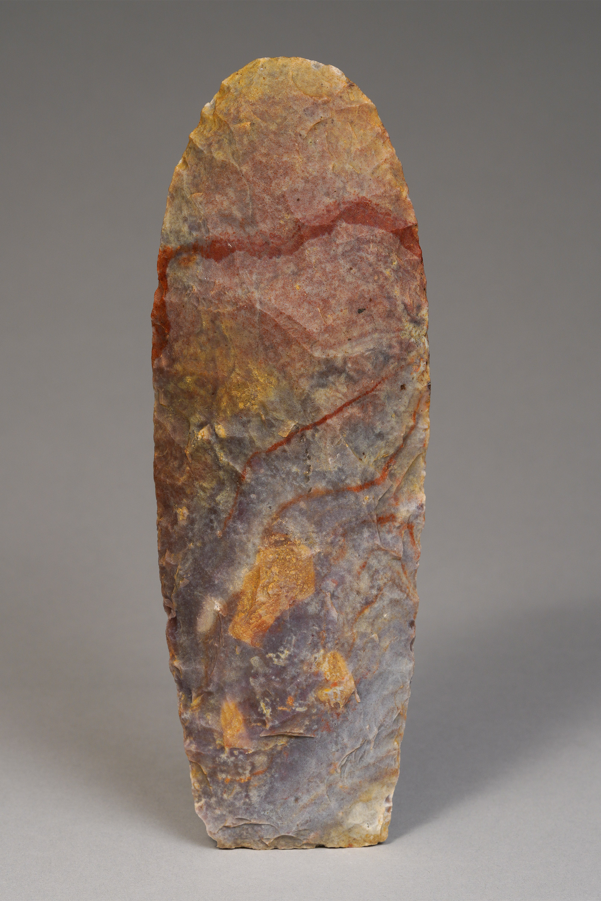 Axe blades such as this were made out of exceptionally high-quality flintstone / agate and belong to the Tenerean neolithic complex in West Africa. They are around 6000 years old. They were produced by specialized flint knappers who also made arrowheads and other tools. Most of them were found in Niger, but there were ateliers in (modern-day) neighboring countries as well. The axe blades had different shapes based on their function / purpose, and when in use they were polished and sharpened along the outer edge. Gradually the axe blades became shorter and were resharpened until they were too small to work with. Most of the axe blades found are in the first stage, simply knapped and ‘fresh’ (found in close proximity to the ateliers). When used and re-sharpened they were dispersed around a wide region, and are much more difficult to find today (Pers. communication, Michel Van Den Dries, 2025).