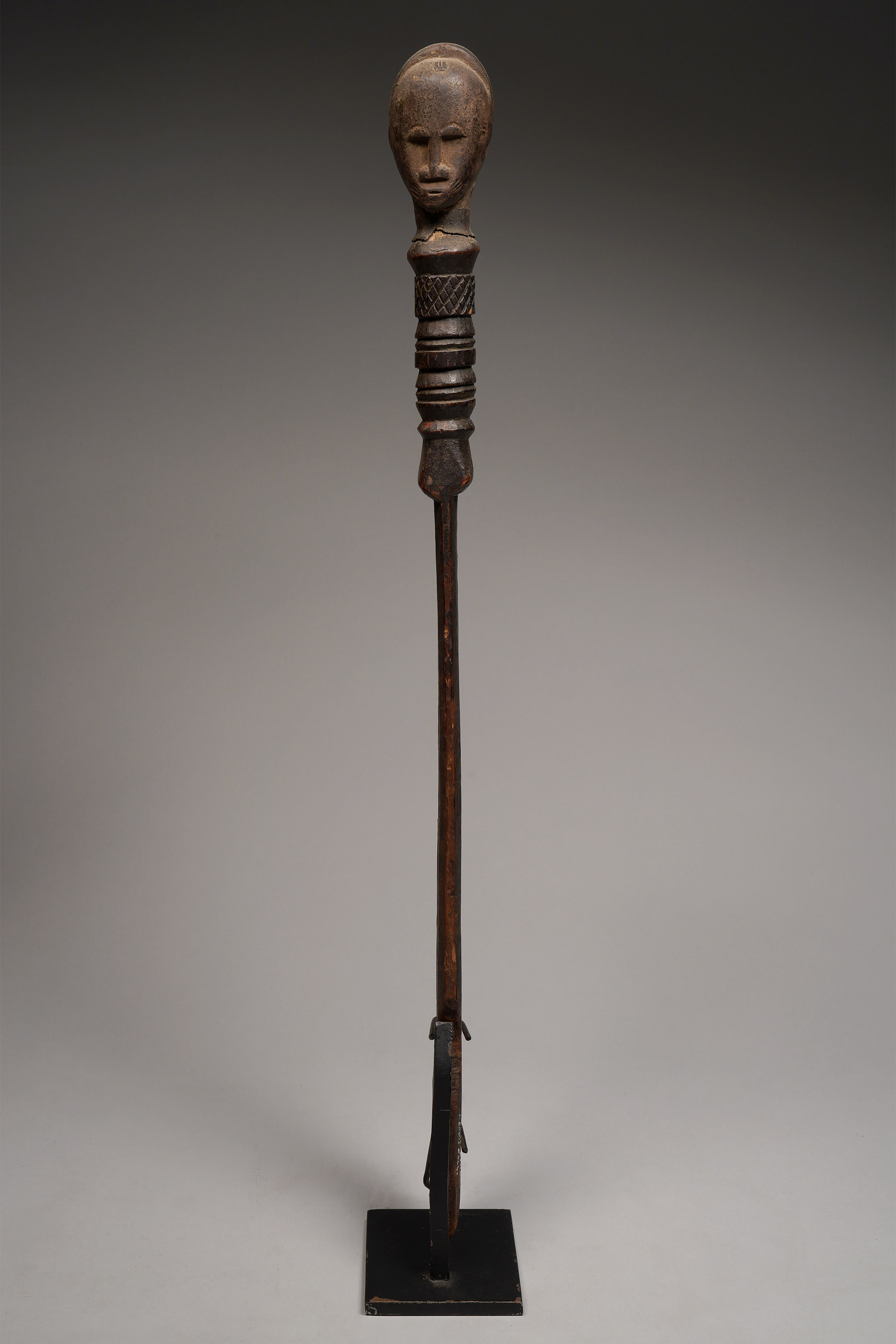 Like many Baule objects, this ceremonial scepter is adorned with a head in the classic Baule aesthetic; this example has two faces.