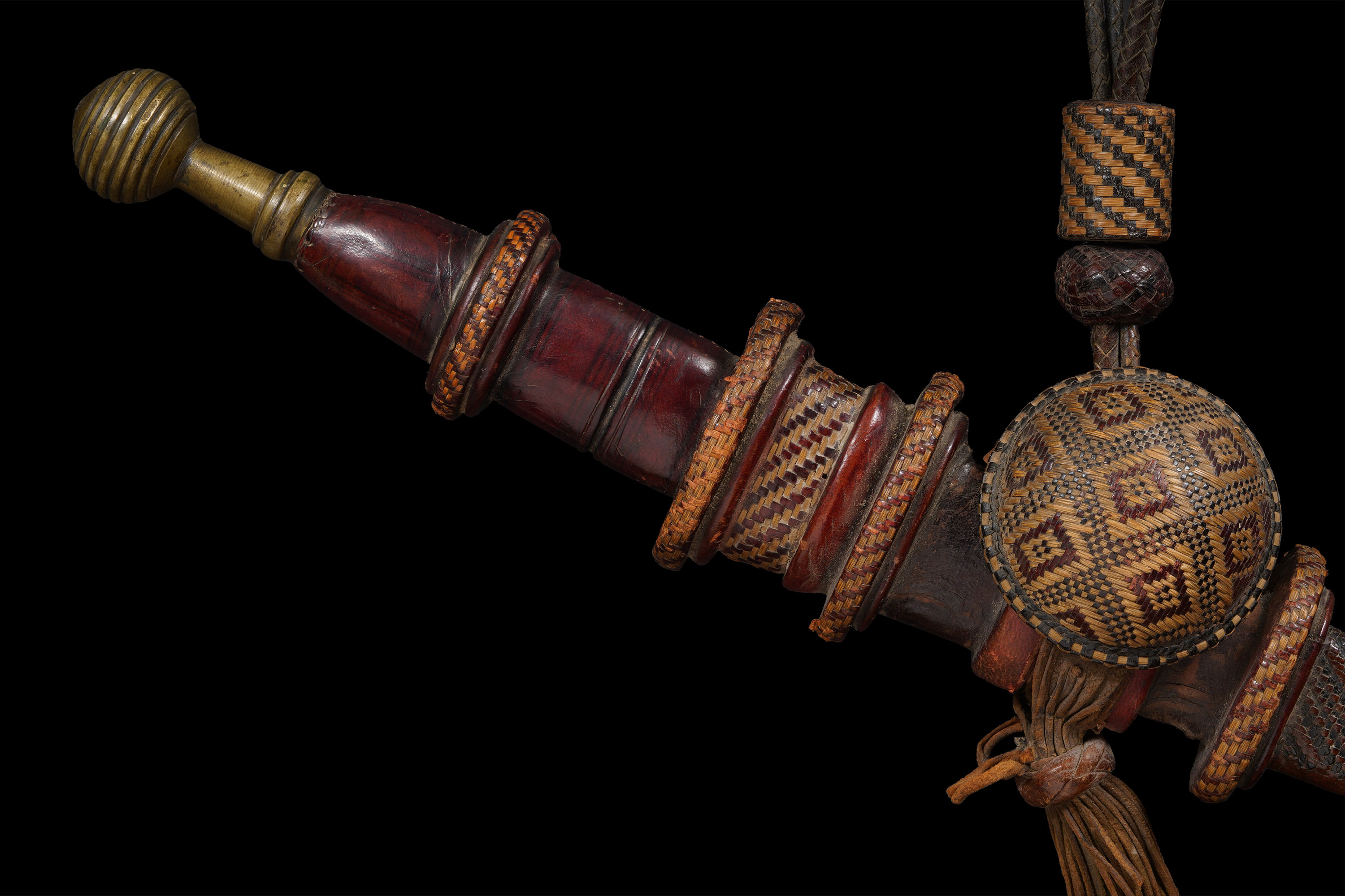 The Mandingo are an ancient culture spread across West Africa, from Guinea to Niger. A migratory Islamic culture, they are famous for their ornate leatherwork, seen here. Their blades are simple and often symmetrical, yet executed with precision.