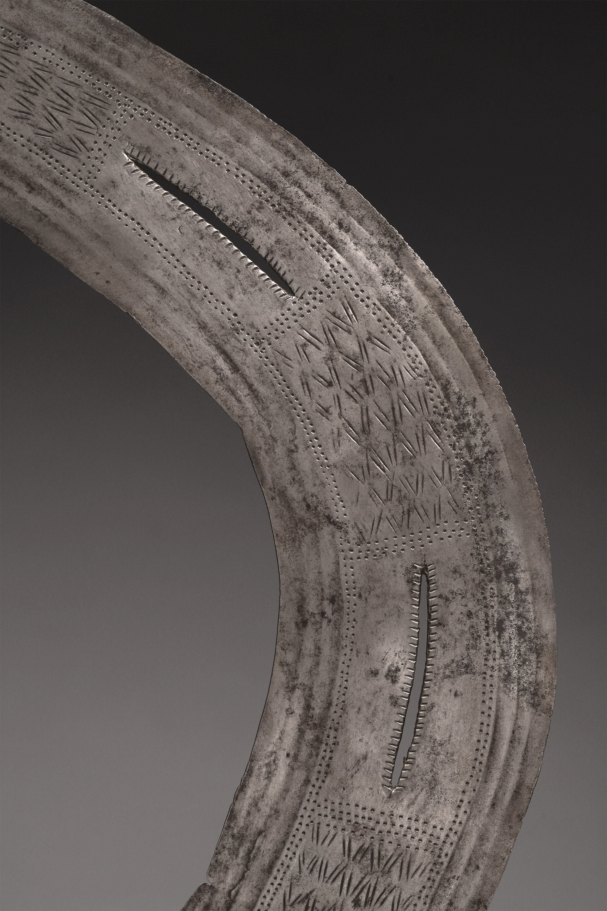 This sickle knife stands out amongst its peers for its comparably small size, and its continuous rounded curve, as compared to similar blades of the Benge, Boa, and Ngbandi, which are larger and have a break in their curve. The elongated spur is a distinguishing trait of this type as well, as is the double-pierced stem above the handle. This older type is closer to the original functional weapon types, rather than the large examples that emerged later and were used more as prestige pieces (Elsen, The Sickle Weapons, Part 1, 1996).