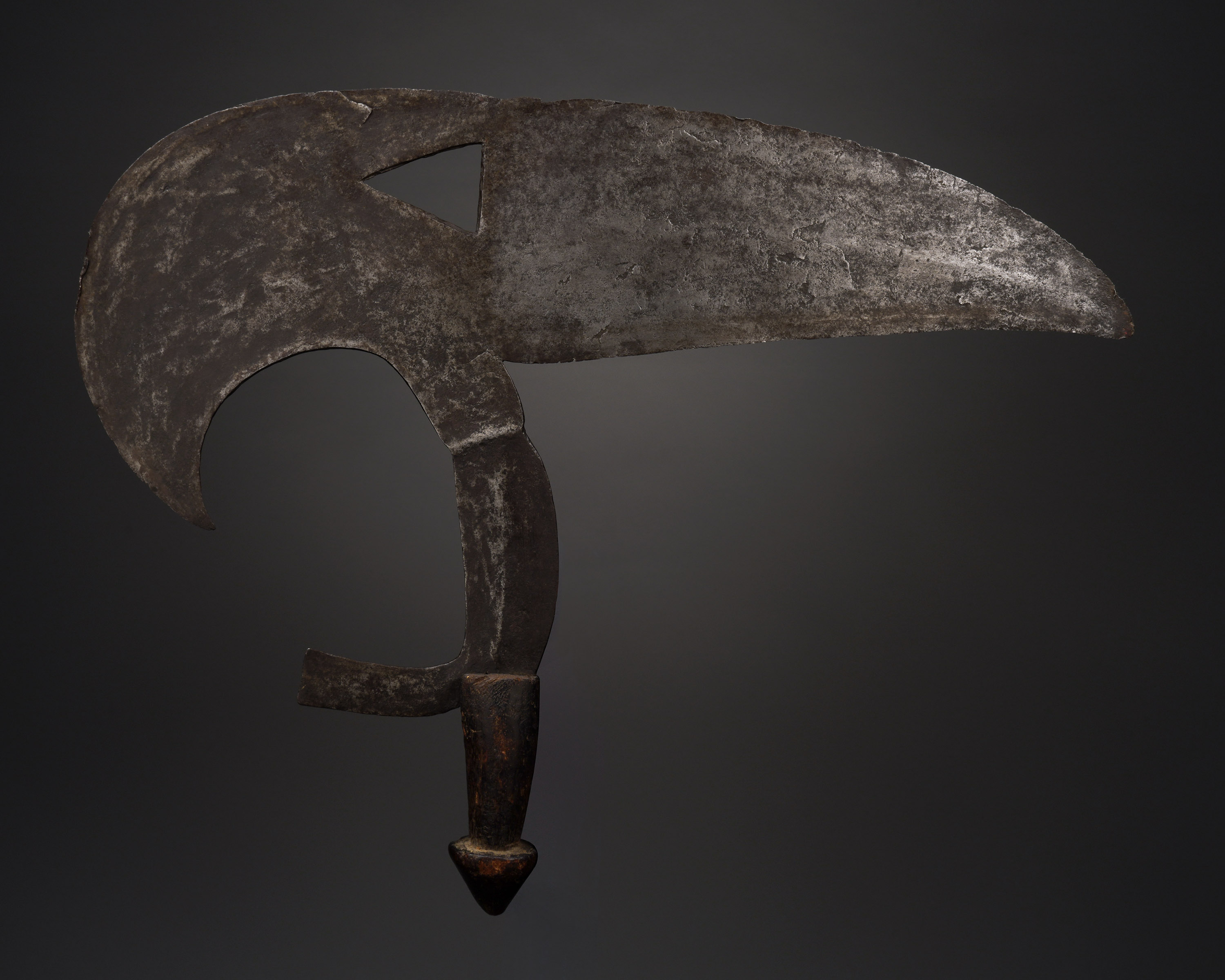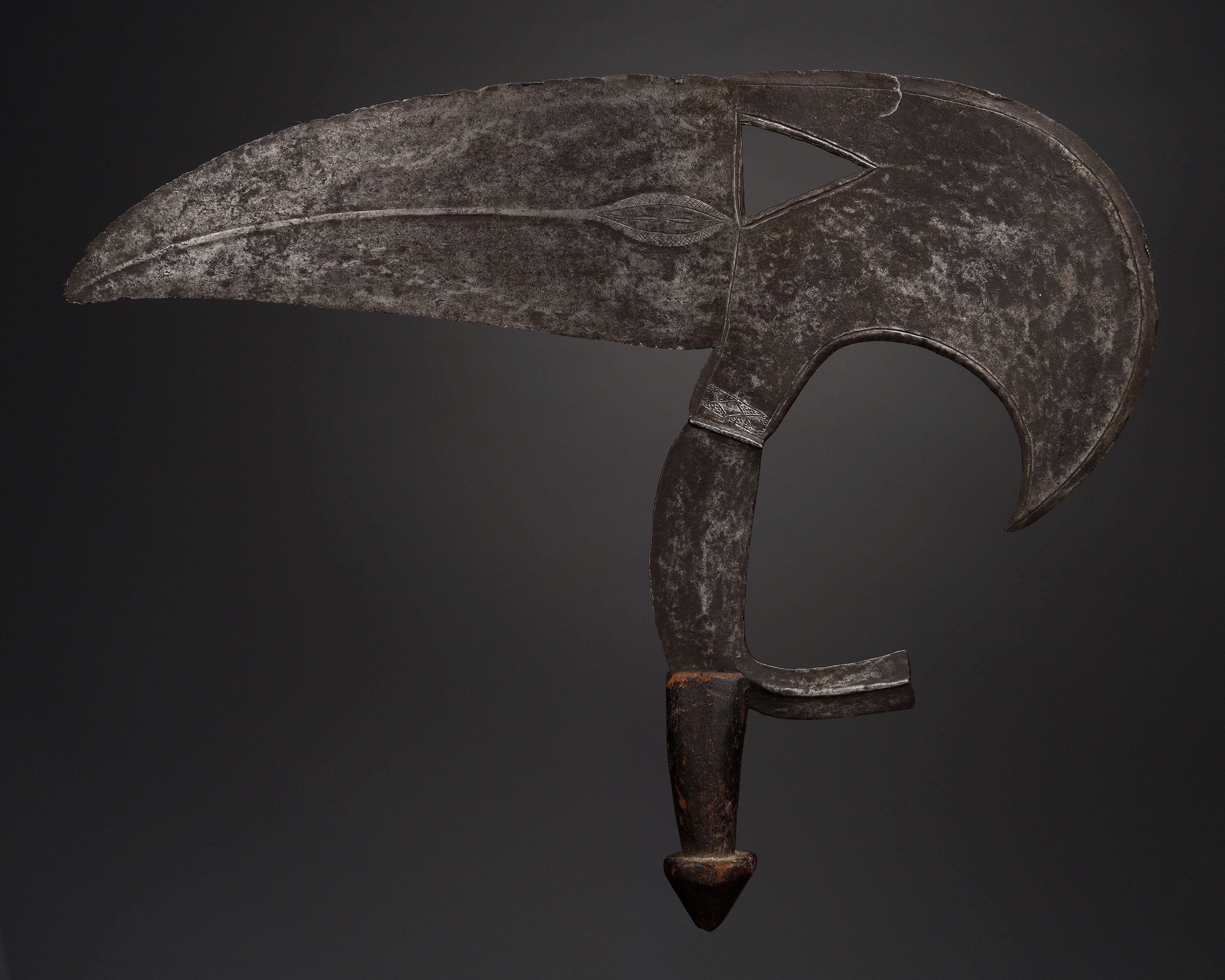 Bird head knives symbolically represented weapons that were metaphysically aimed at hurting anyone who acted antisocially against the village community by practicing witchcraft or sorcery. The hornbill is a creature much admired in Africa for its persistence and intelligence (Blackmun & Hautelet, Blades of Beauty and Death, 1990; Westerdijk, The African Throwing Knife, 1988).