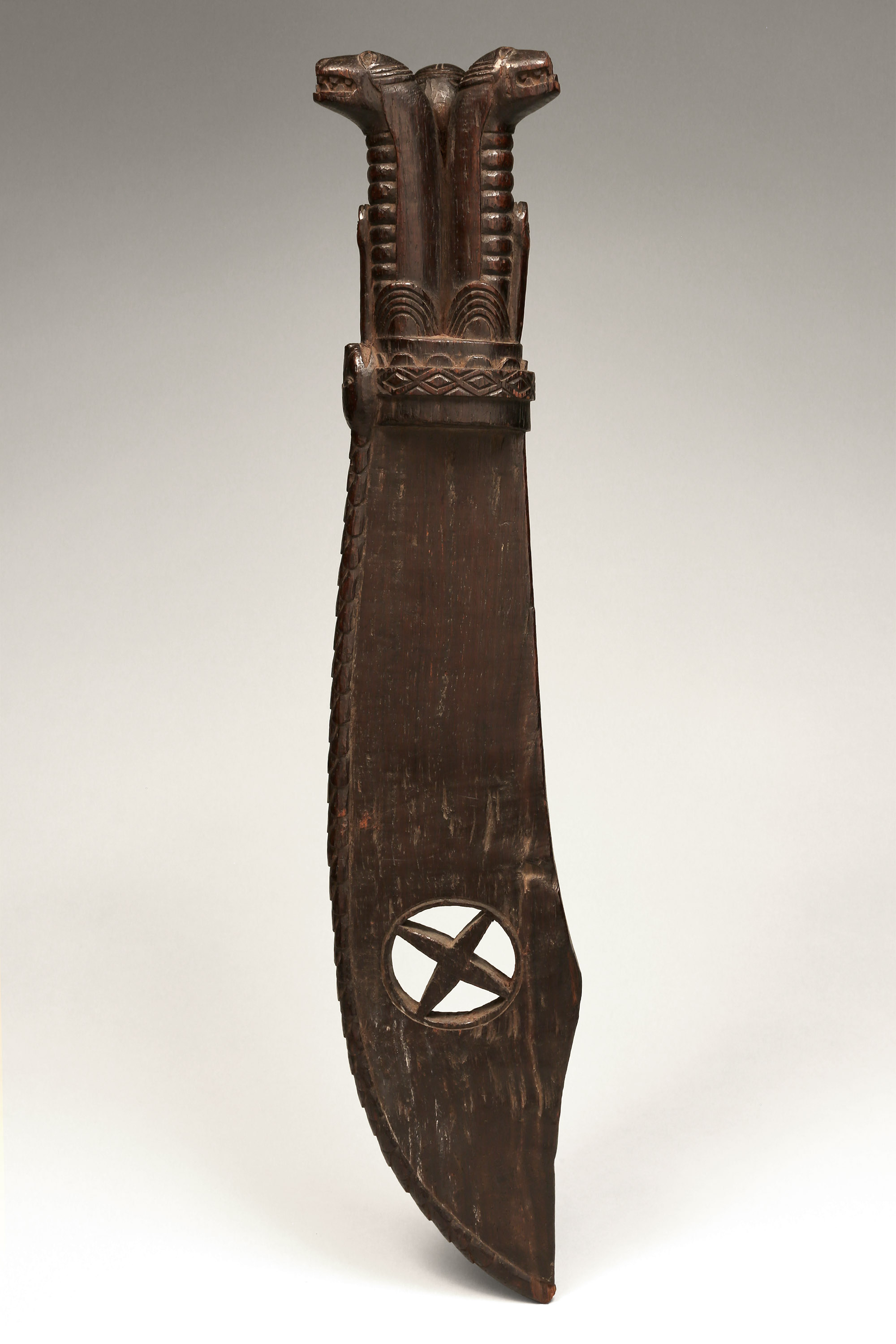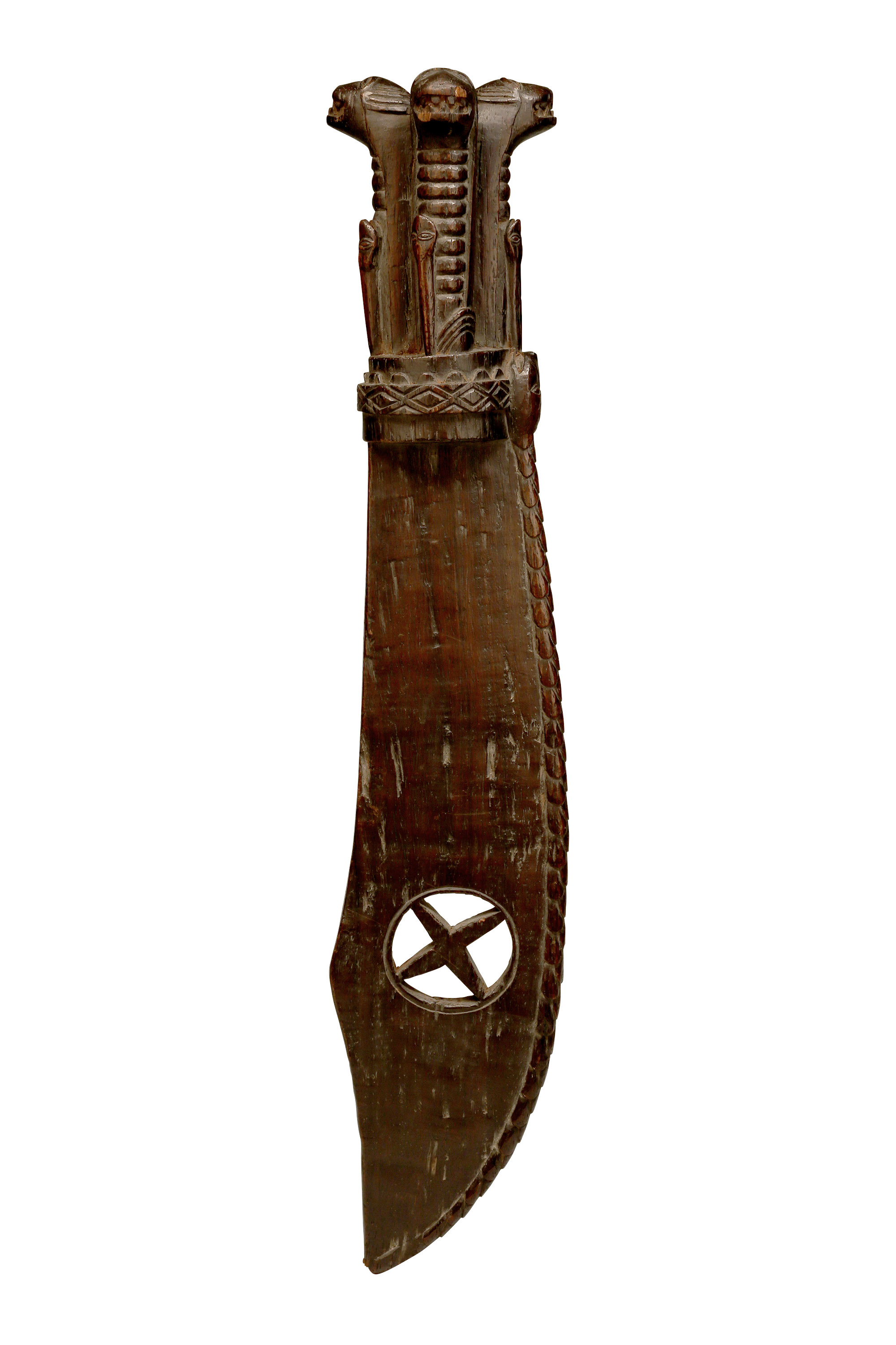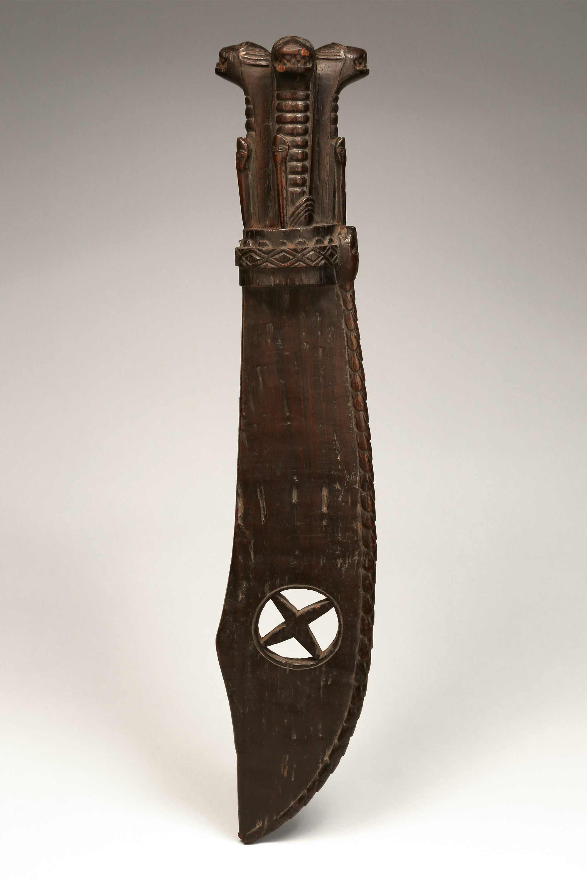 This intricately carved sacred blade, known as cimpaba or tshiphaaba, was used by the Woyo, Kakongo, and Yombe. The three upright feline figures baring their teeth each have a snake crawling up their neck (never in the center of their neck, always to one side), and the entire leading edge of the blade is covered by one long, scaled snake – this imagery was certainly very important and most likely invoked a specific allegory that was meaningful to the culture (Zirngibl & Kubetz, Panga Na Visu, 2009).