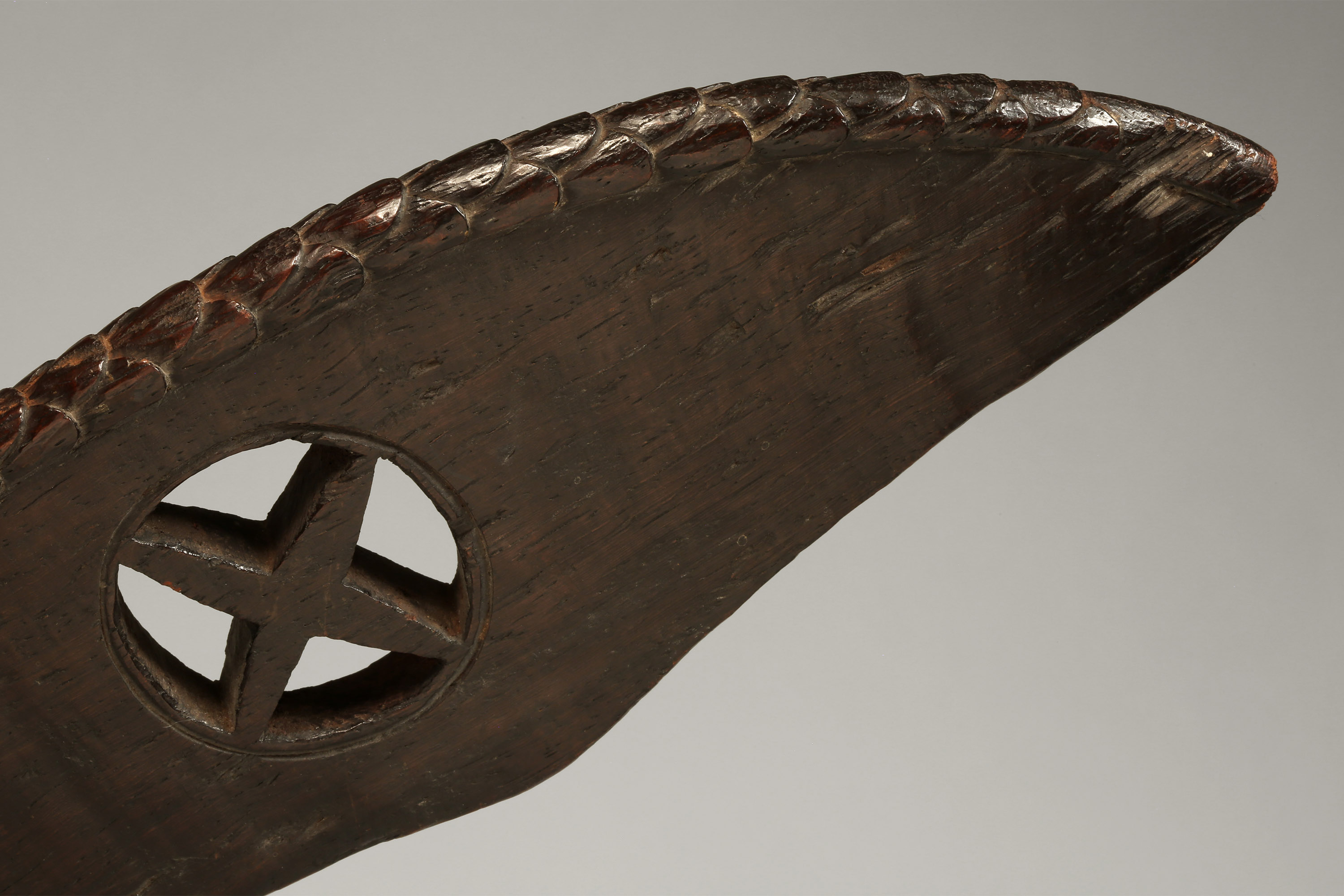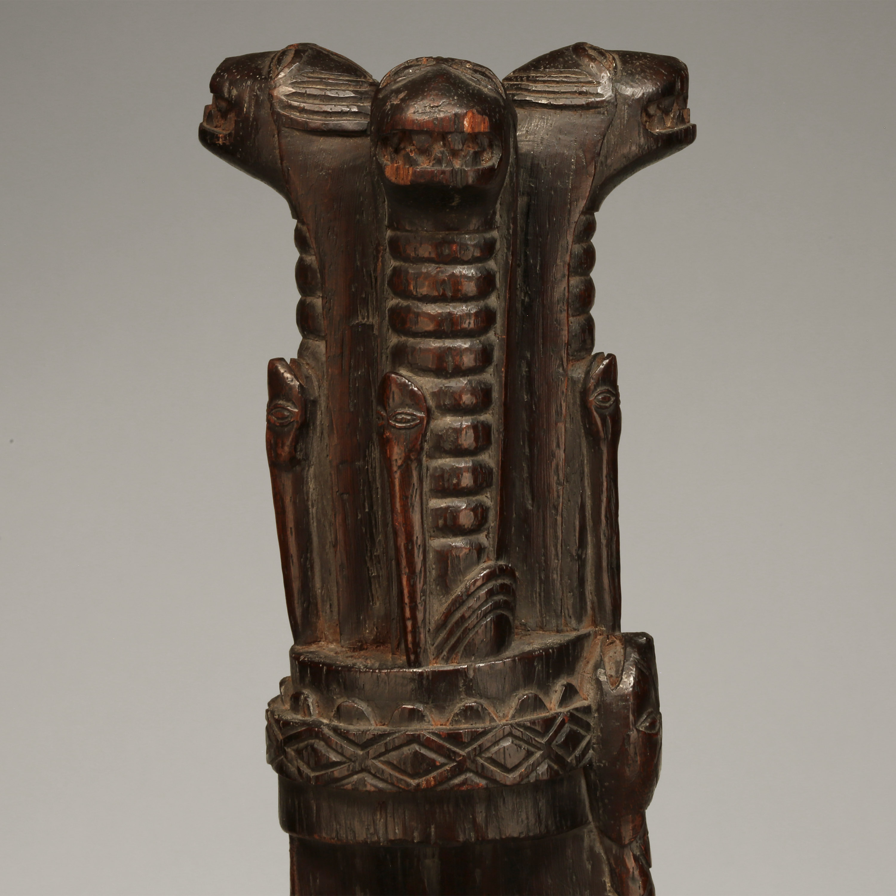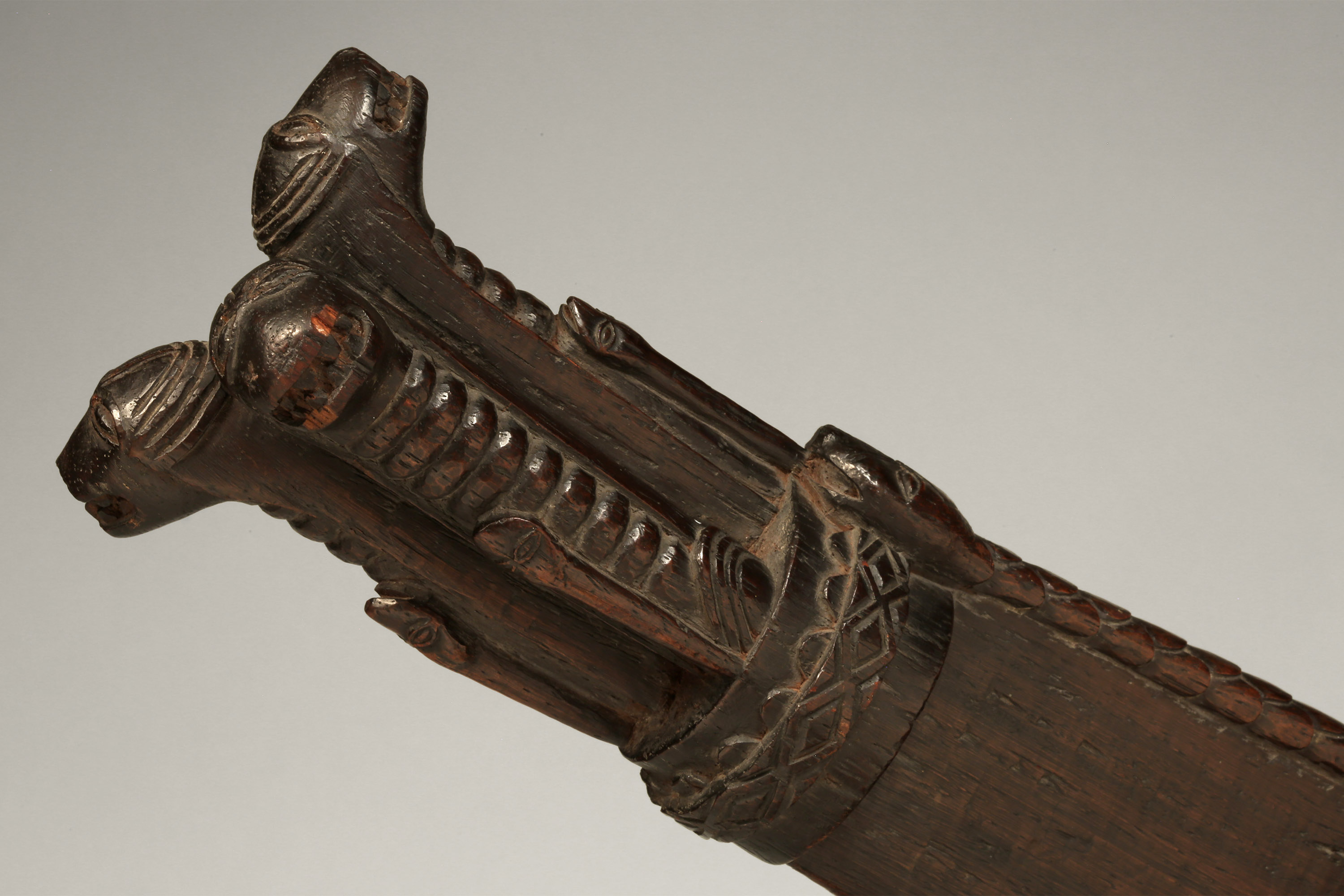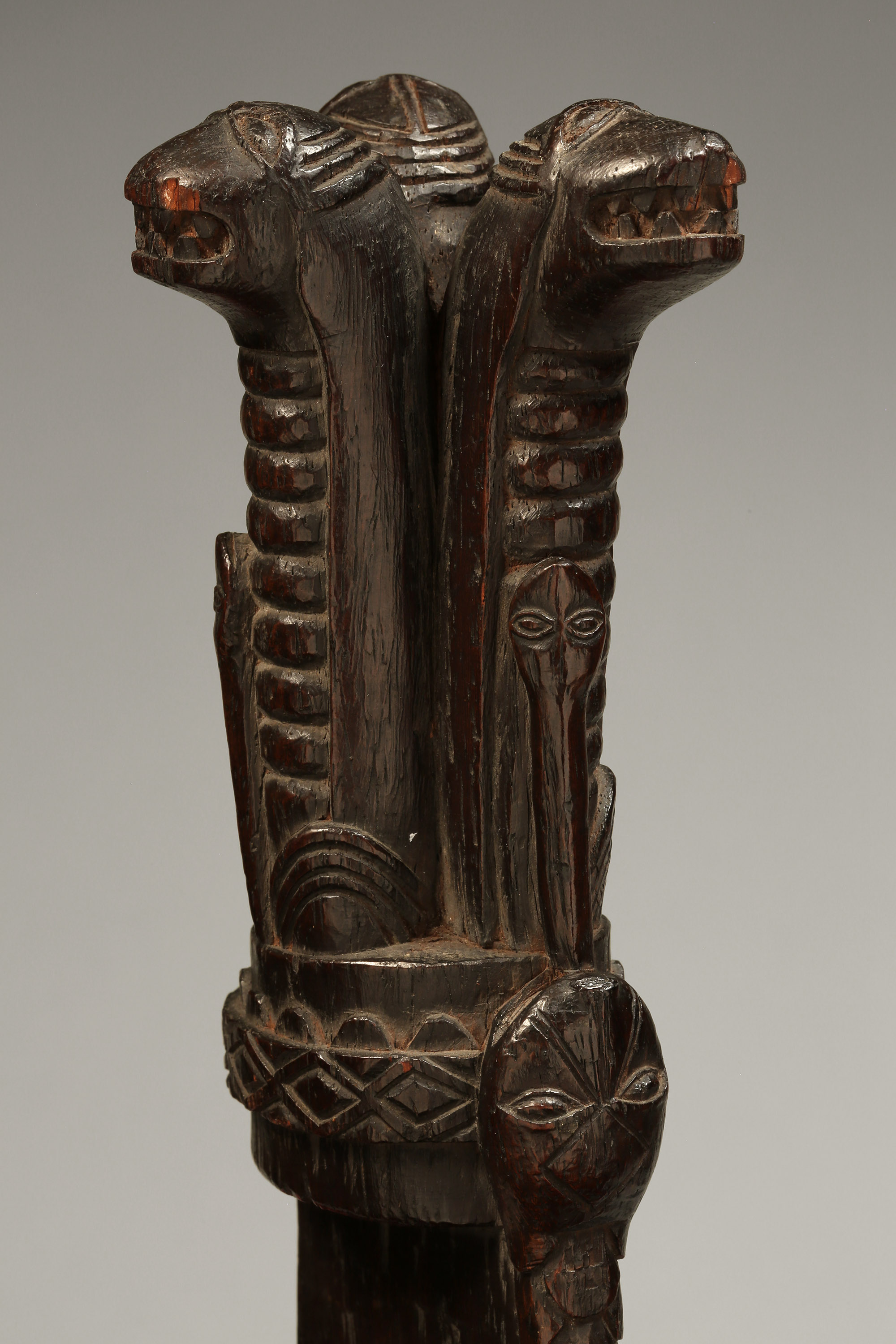 This intricately carved sacred blade, known as cimpaba or tshiphaaba, was used by the Woyo, Kakongo, and Yombe. The three upright feline figures baring their teeth each have a snake crawling up their neck (never in the center of their neck, always to one side), and the entire leading edge of the blade is covered by one long, scaled snake – this imagery was certainly very important and most likely invoked a specific allegory that was meaningful to the culture (Zirngibl & Kubetz, Panga Na Visu, 2009).