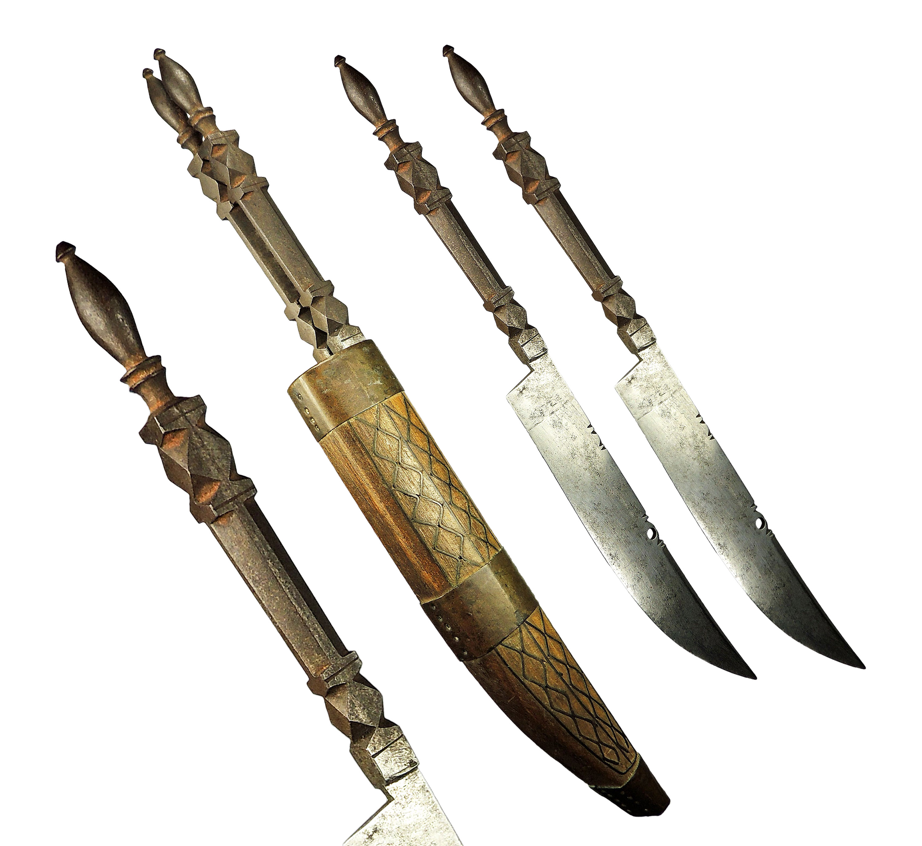 Eric Claude describes the ways in which these razors are manufactured with the same techniques and design as Algerian Flissa swords: "the majority use the same decorations as the Flissa with some variation, and the same flat-spined blade, tapering towards the tip is also identical to Flissa swords. These knives consist of a mono-metallic mount with the octagonal hilt, the ferrule and the blade, all made of a single piece of forged steel. Some of these are called 'Kabyle razors' and are often seen in pairs in the same sheath" (The Small Catalog of Moroccan and Algerian Edged Weapons, 2020).