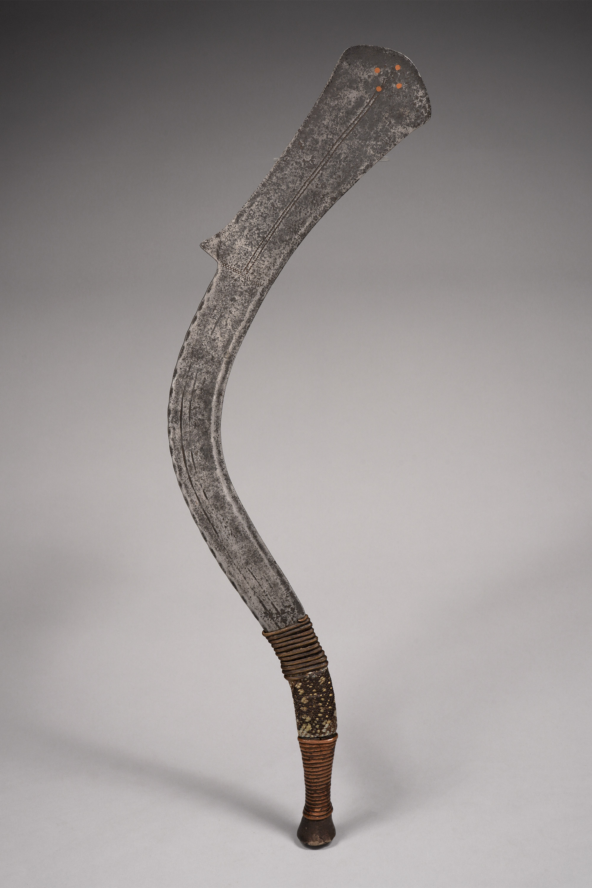 This sickle weapon type is found among the Ngombe, Doko, Poto, and Mbudja. The Ngbandi, who regularly supplied the Ngombe and neighboring groups, called it béro. The béro was a functional tool and weapon that was also a symbol of prestige. Elsen describes this type: "the majority of examples of this type have such a small wooden grip that one had the impression that it only served to keep in place the protection for the hand." While originally designed for protection, these weapons seem more suitable for cutting than hitting (Elsen, De fer et de fierté, 2003; Elsen, The Sickle Weapons, Part I, 1996).