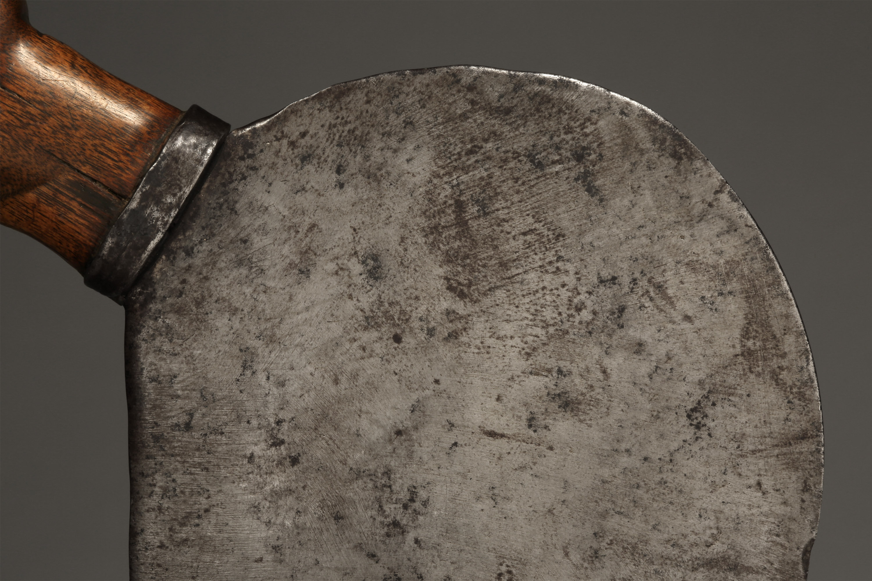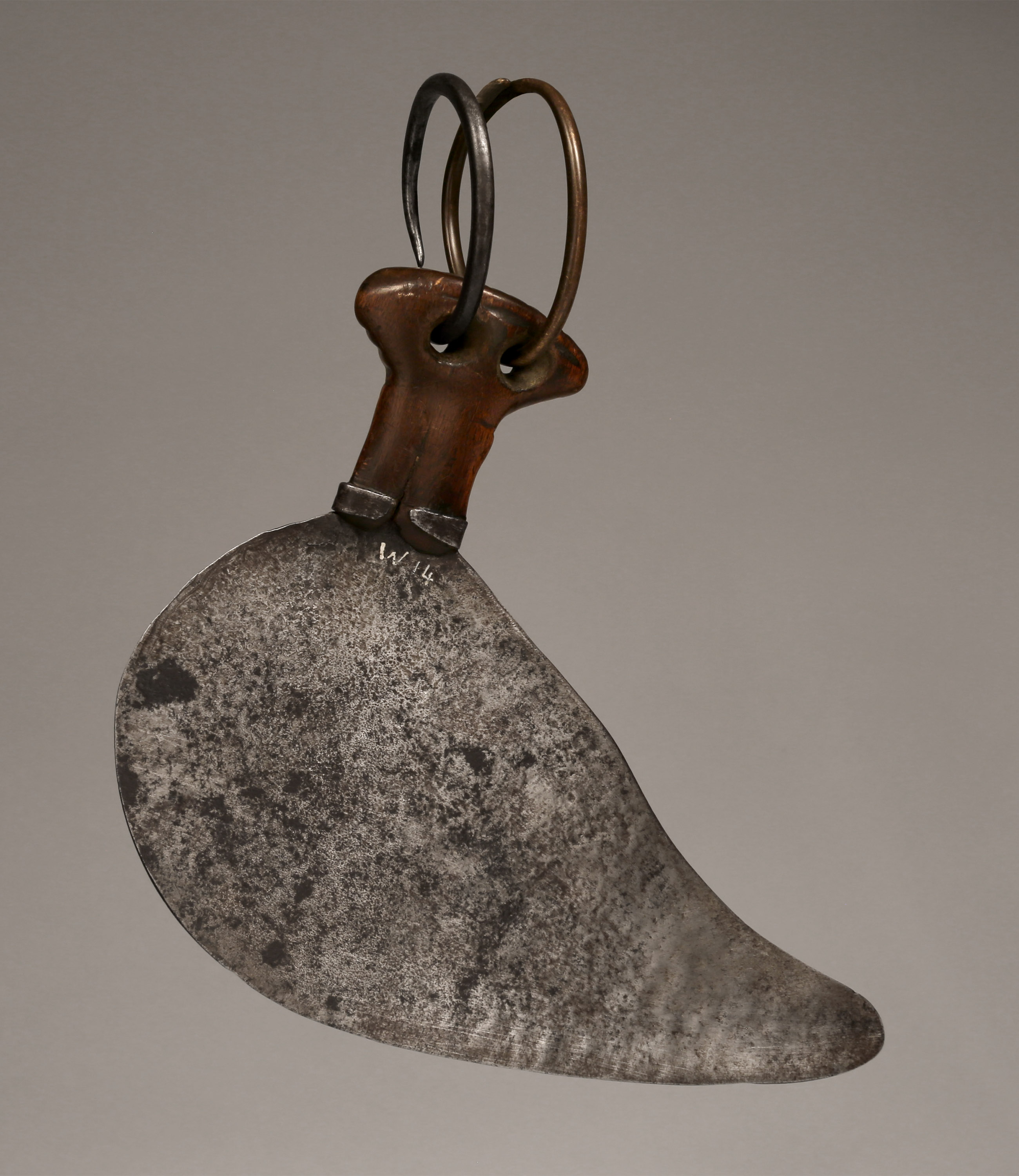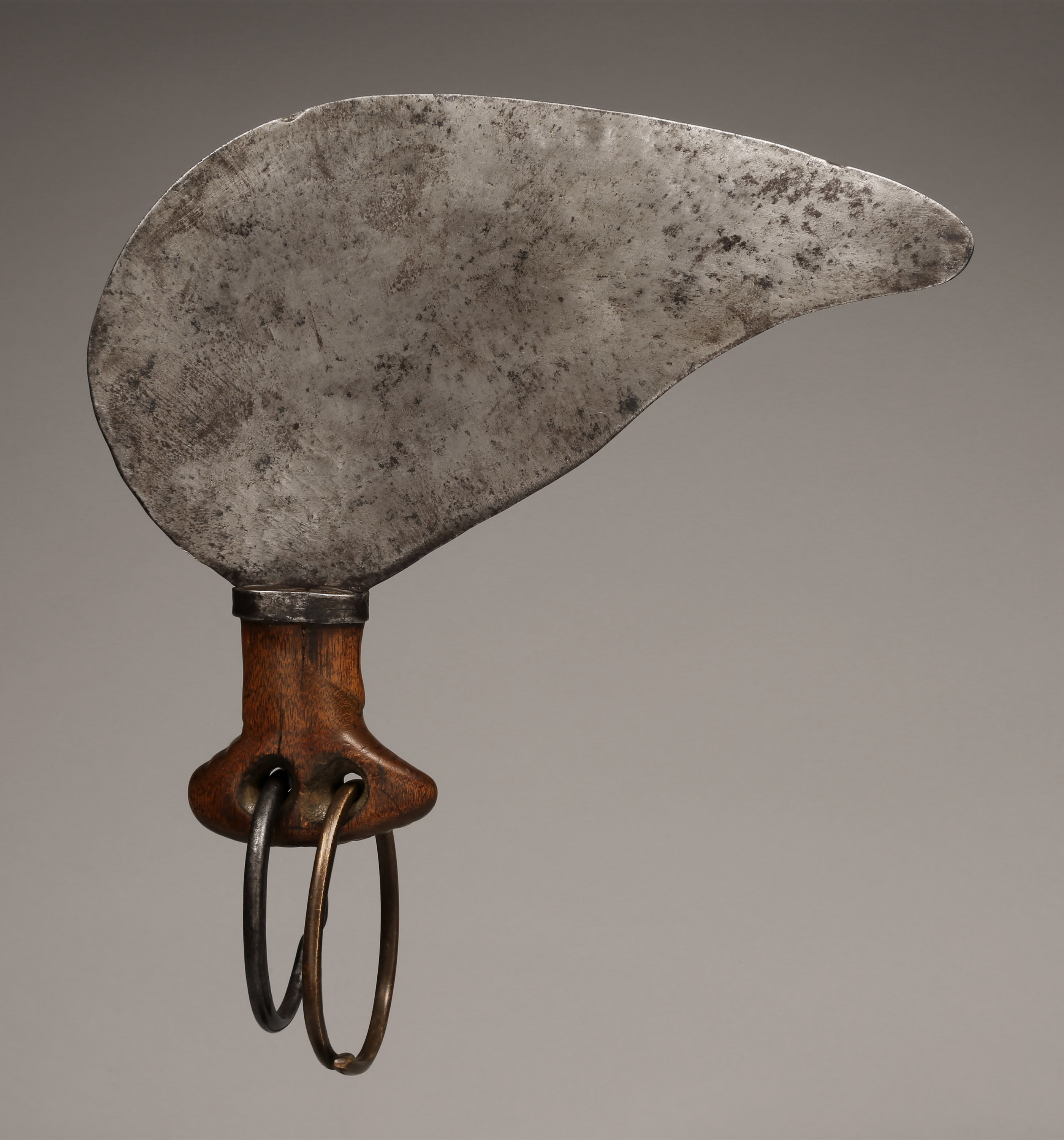 This small knife was a working knife used by women among the Ndo, Alur (Lur), and Lendu, who live in the border area between D.R. Congo and Uganda. Some examples were the prerogative of a chief’s wife, who wore it during festivals as a symbol of her power in the context of supervising the cultivation and harvesting of crops. According to H. Westerdijk, the Ndo, who live on the upper Kibali River, were the original makers of these knives (Galerie du Crédit Communal. Beauté Fatale: Armes d'Afrique Centrale, 1992; Westerdijk, H., Ijzerwerk van Centraal-Afrika, 1975; Zirngibl & Kubetz, Panga Na Visu, 2009