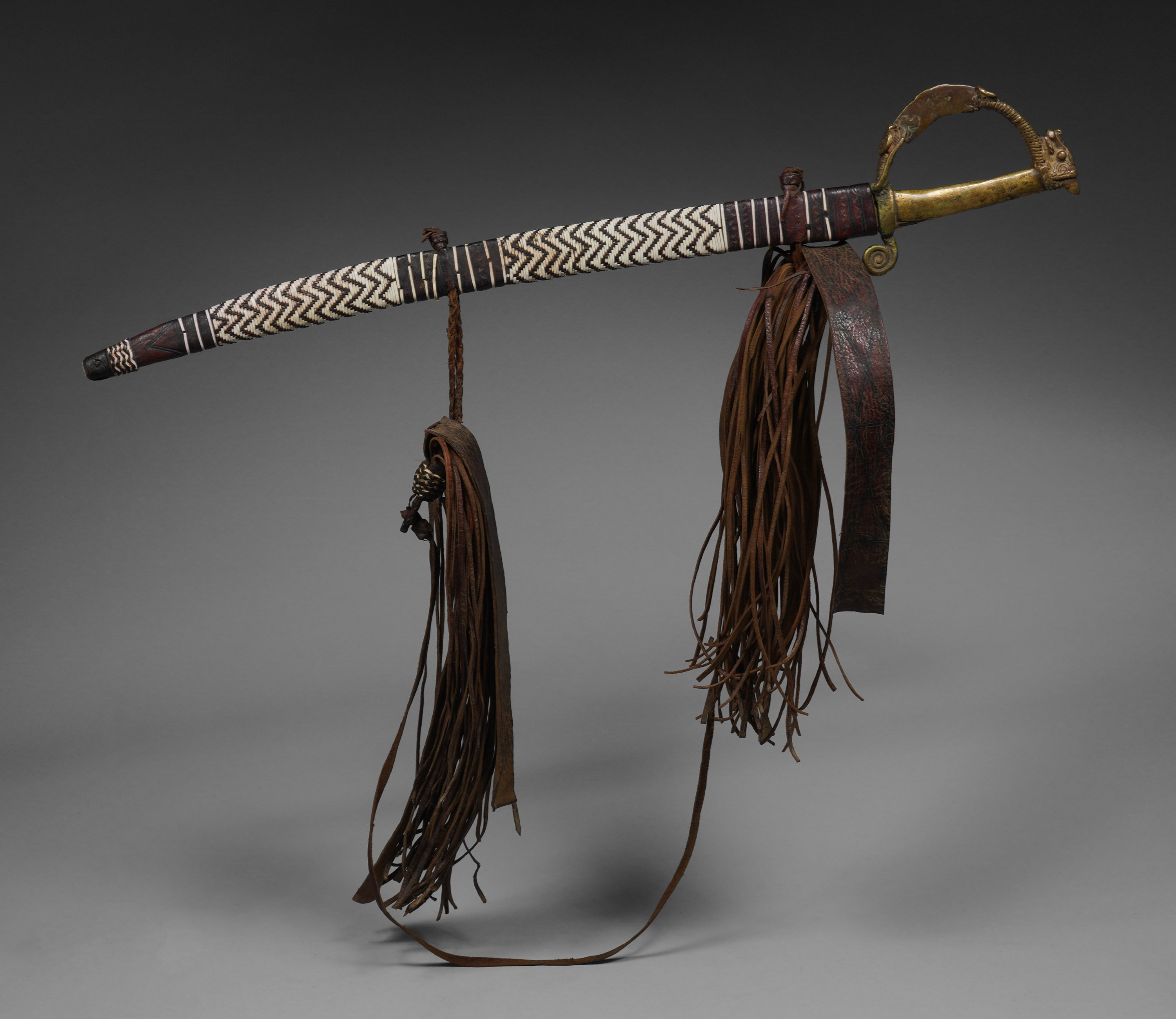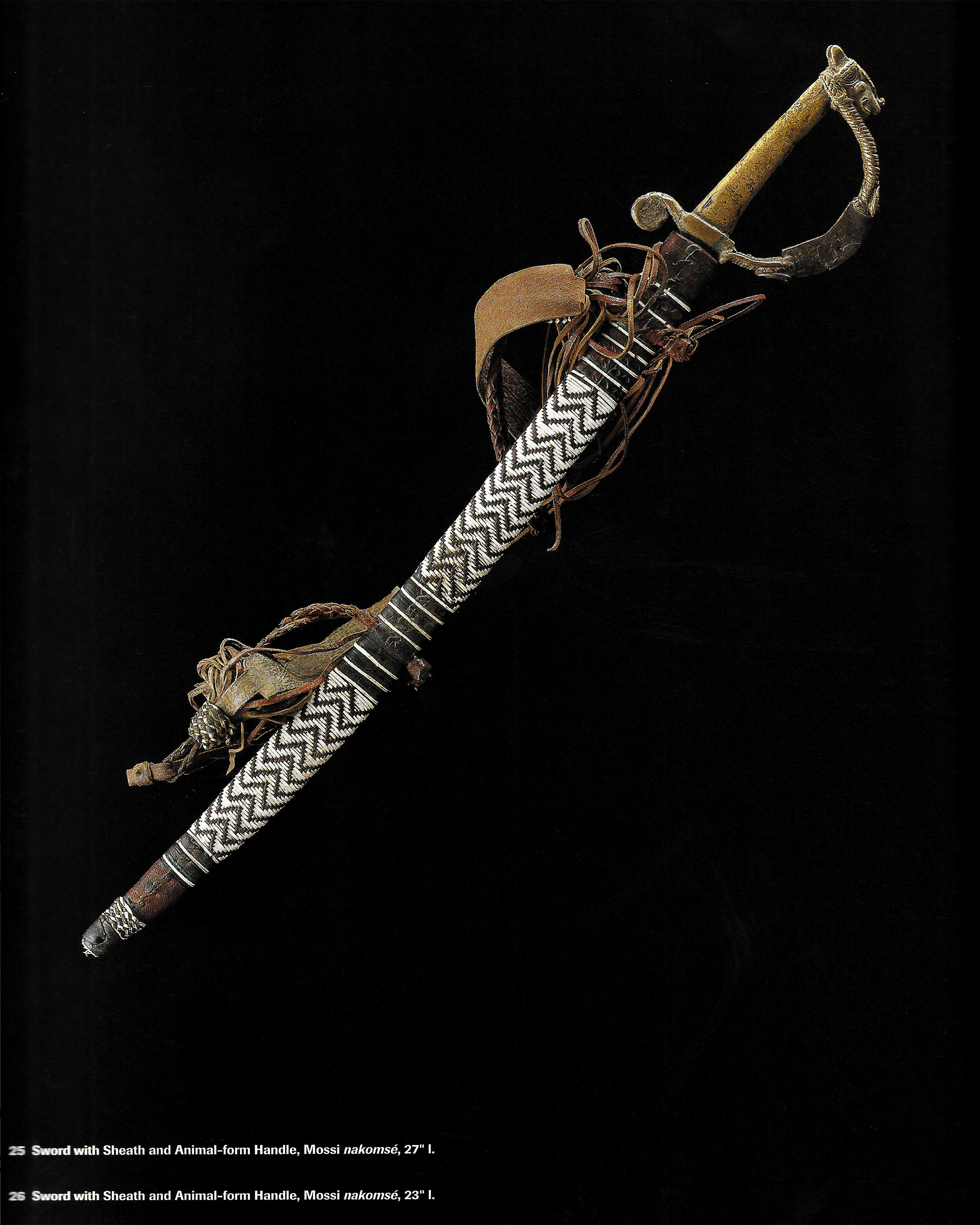 This short sword was probably part of the ceremonial regalia of nakomsé chieftans. The leatherwork includes sections of thin, intricately woven plastic strips, which is reminiscent of Tuareg workmanship. Stylistically, it is not Tuareg, and the figurative handle indicates that it was not the prerogative of the Islamicized Fulani or Songhai.