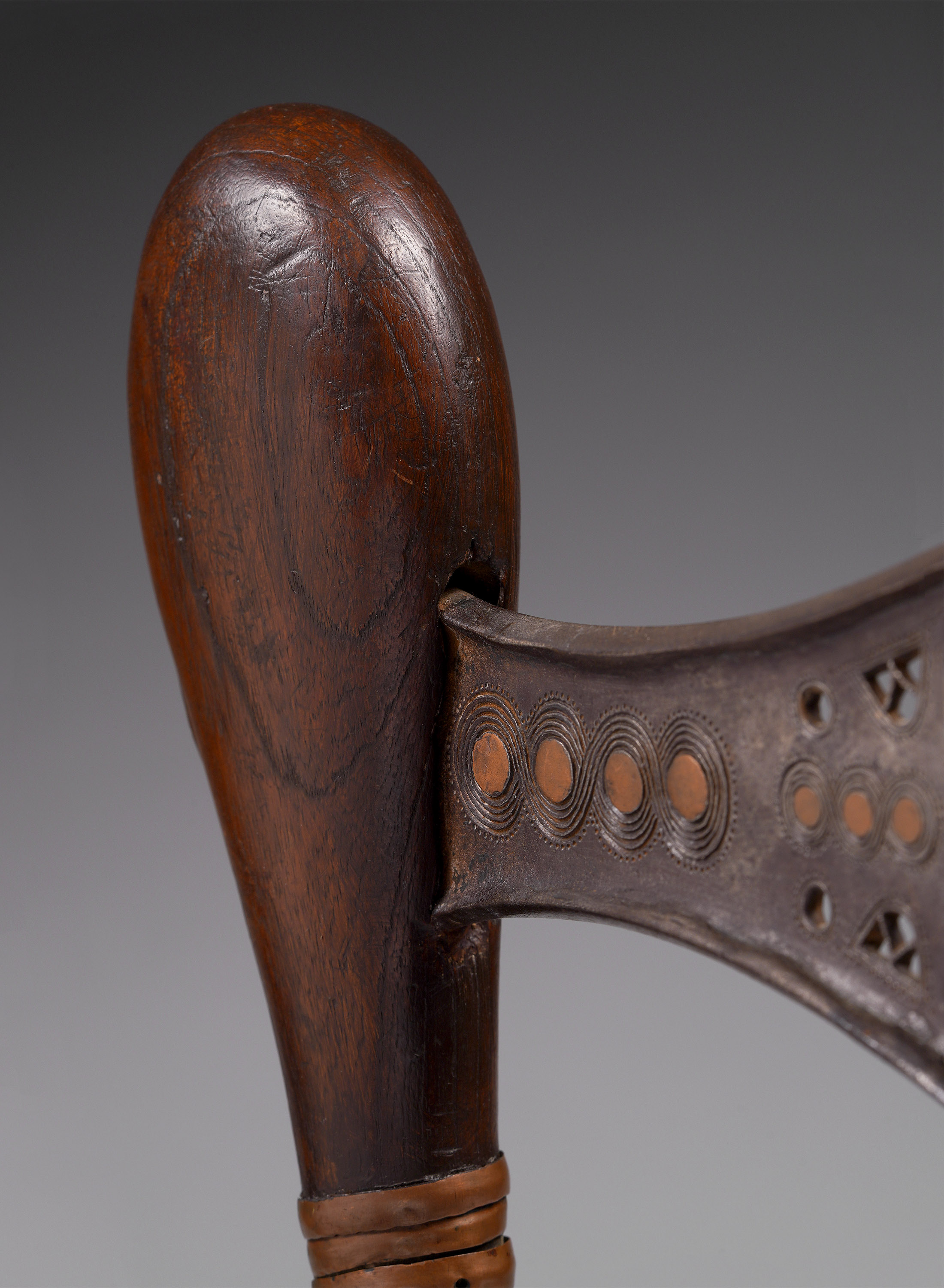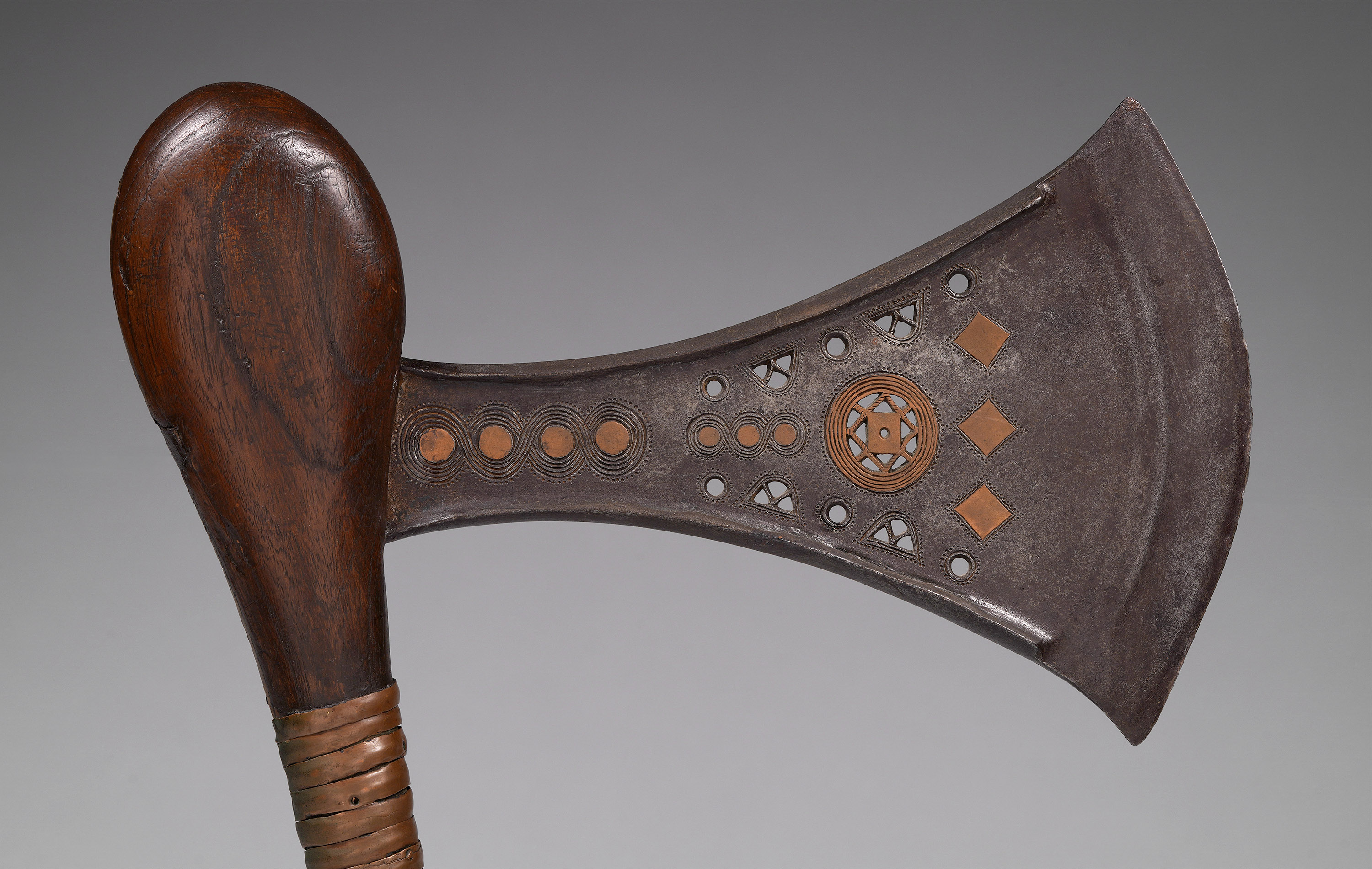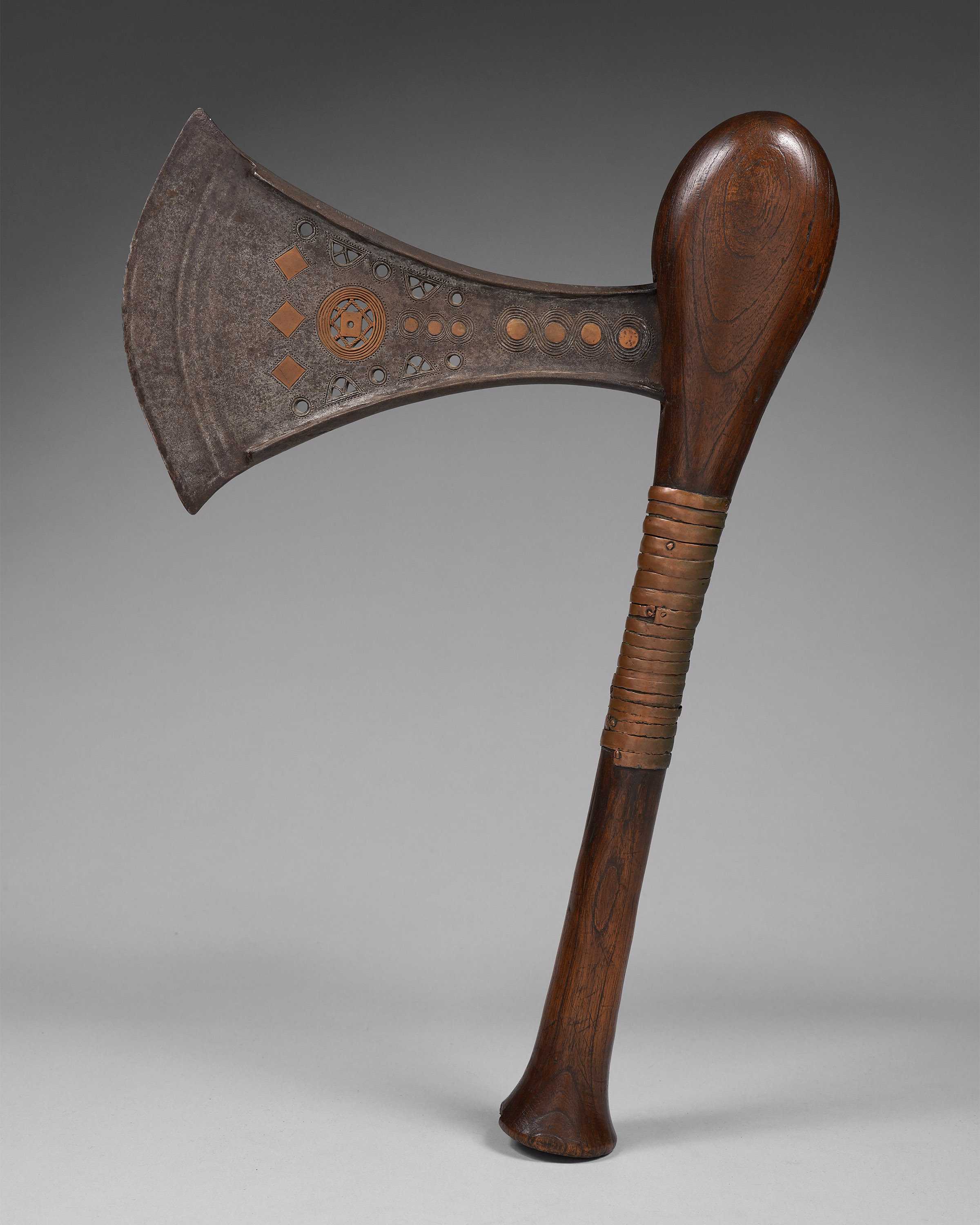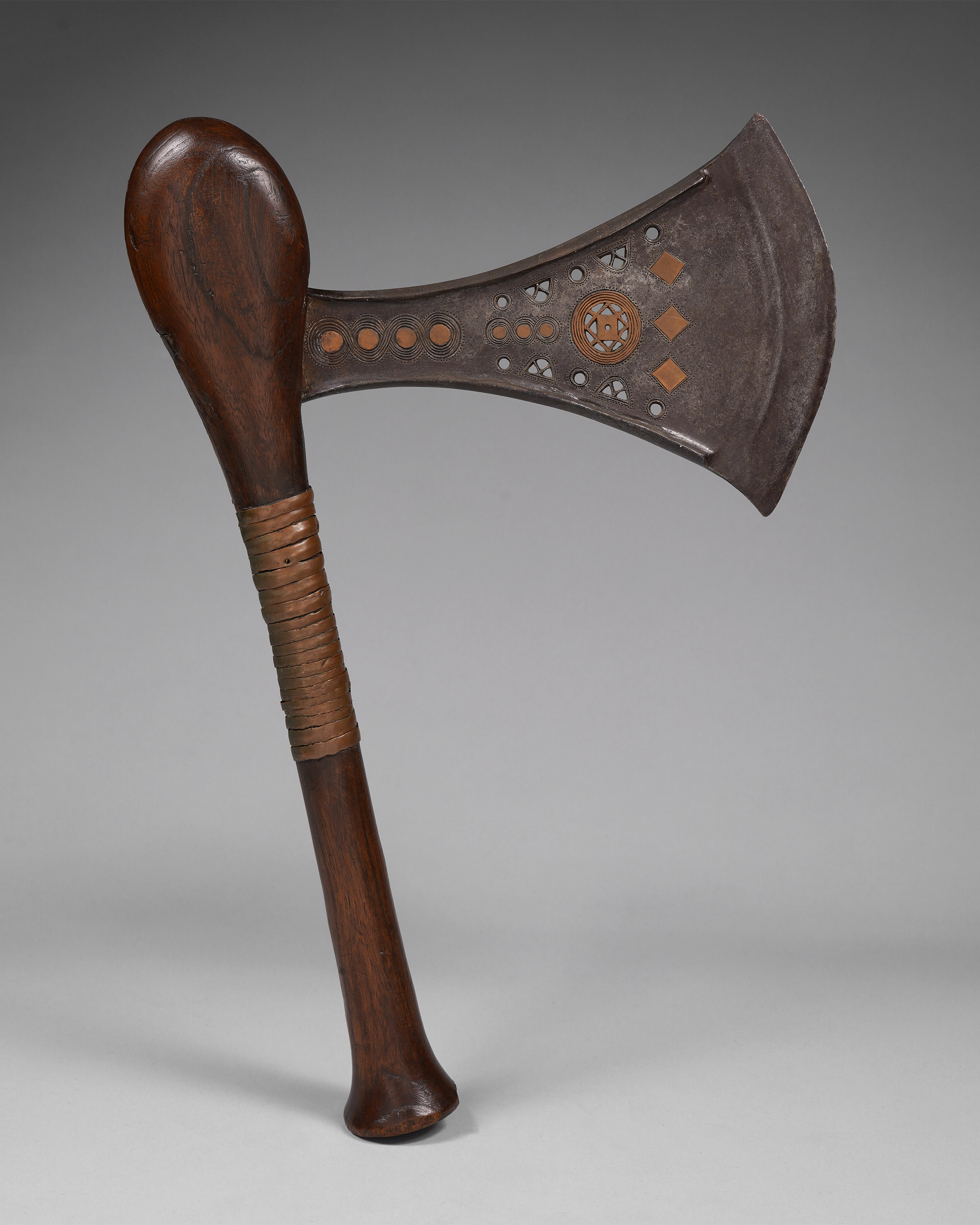 This type of axe, known as kilonda, was mainly produced by the Songye, but also by the Nsapo and Luba. Though their shape was largely inspired by functional weapons, they were strictly symbols of prestige and pageantry. Songye blacksmiths are widely respected as the greatest masters of the forge, and used both hot and cold forging techniques to embellish these blades (Elsen, De fer et de fierté, 2003; Lefebvre & De Waele, Kilonda, 2011; Neyt, Songye, 2004).