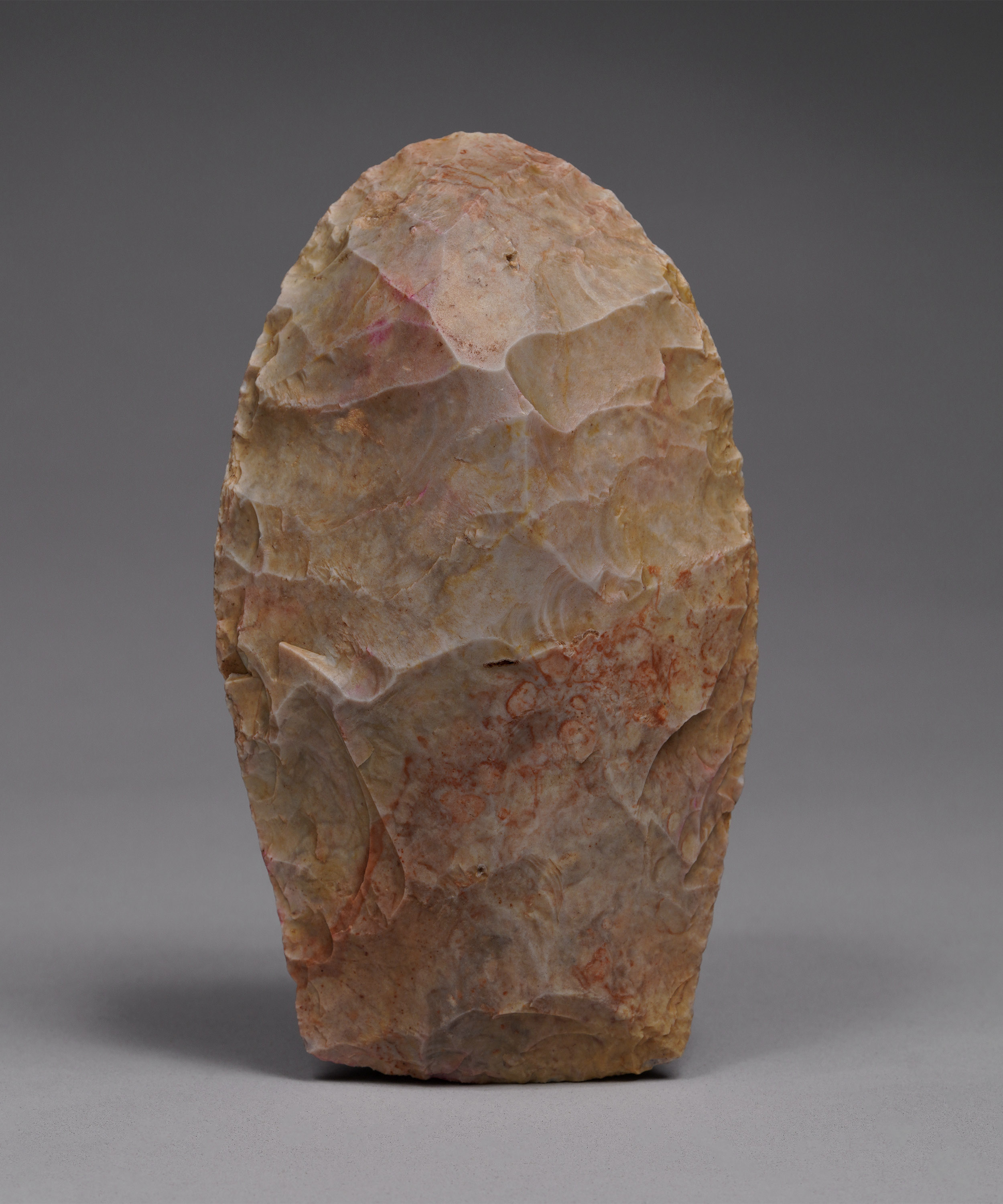 Axe blades such as this were made out of exceptionally high-quality flintstone / agate and belong to the Tenerean neolithic complex in West Africa. They are around 6000 years old. They were produced by specialized flint knappers who also made arrowheads and other tools. Most of them were found in Niger, but there were ateliers in (modern-day) neighboring countries as well. The axe blades had different shapes based on their function / purpose, and when in use they were polished and sharpened along the outer edge. Gradually the axe blades became shorter and were resharpened until they were too small to work with. Most of the axe blades found are in the first stage, simply knapped and ‘fresh’ (found in close proximity to the ateliers). When used and re-sharpened they were dispersed around a wide region, and are much more difficult to find today (Pers. communication, Michel Van Den Dries, 2025).