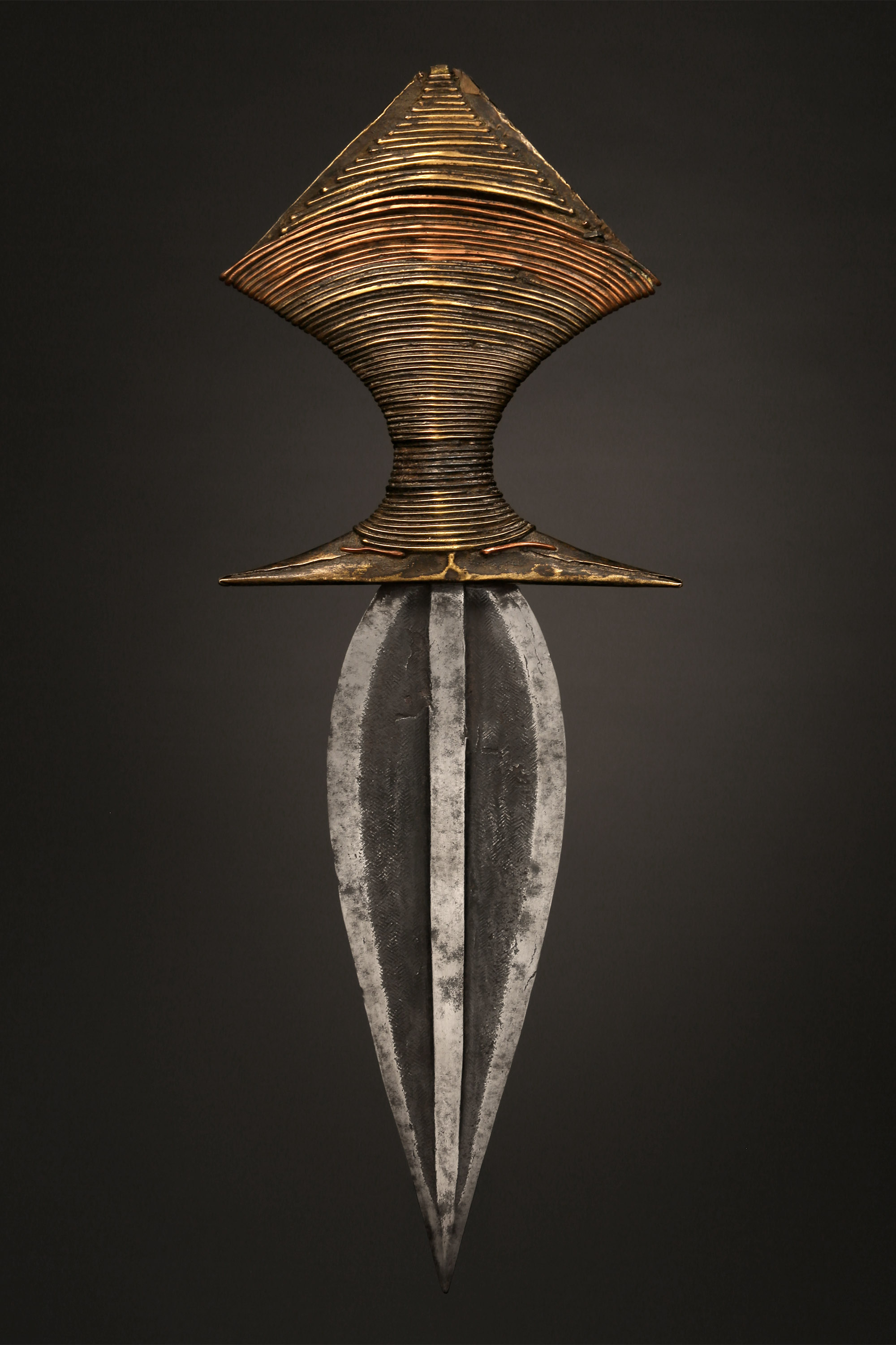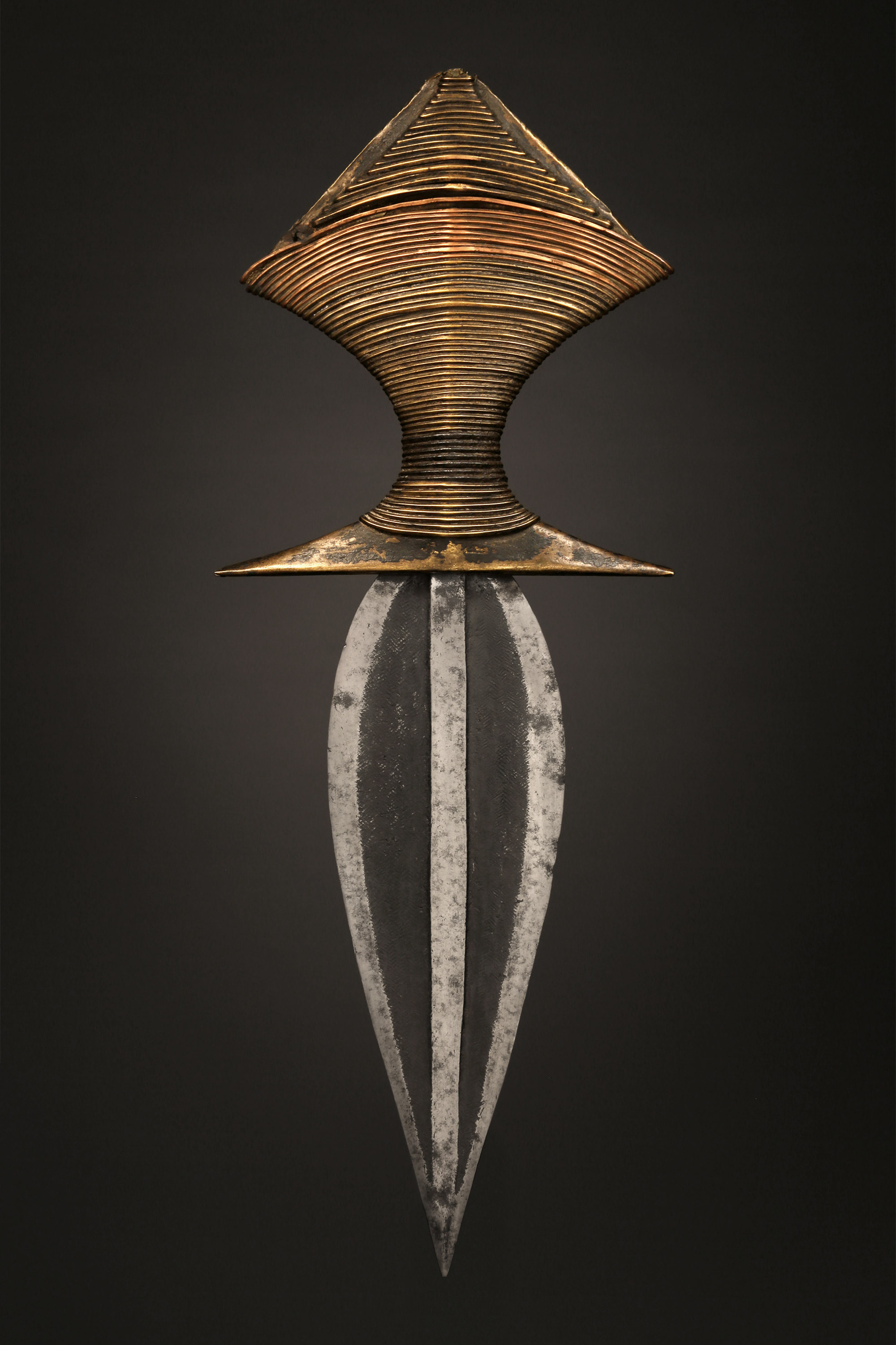This symmetrical short sword was displayed as a symbol of prestige among a number of tribal groups who belong to the Gbaya family. Most often attributed to the Lobala, it was also the prerogative of a number of smaller tribes who were collectively known as Ngiri, and included the Mbondzo, Mondzombo, Ngbaka, and Mbanza.