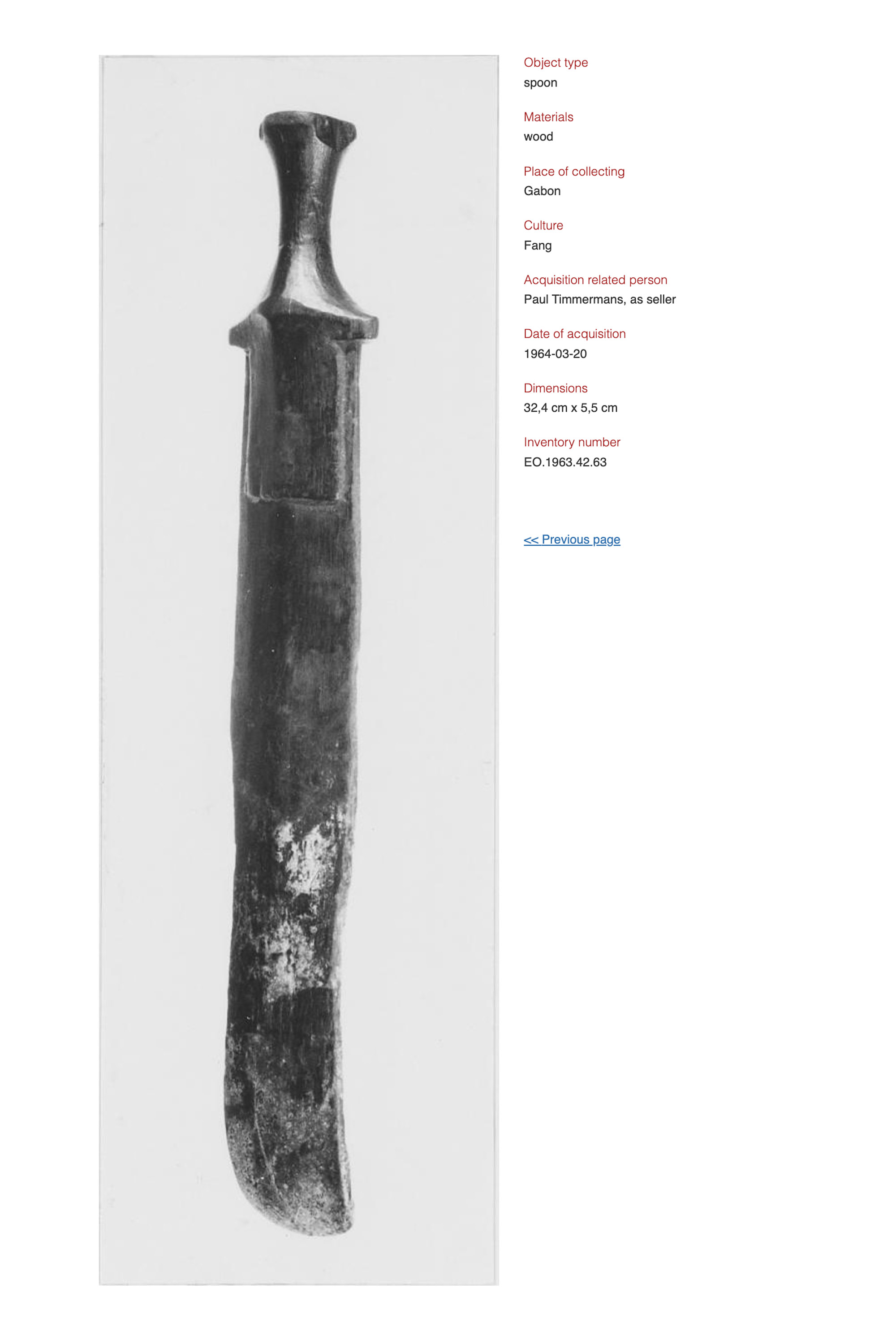 Another related piece has a wooden spoon instead of a blade - it is in the collection of the Musée Dapper, pictured below (inv. No. 7122, © Archives Musée Dapper - Photo Hughes Dubois).