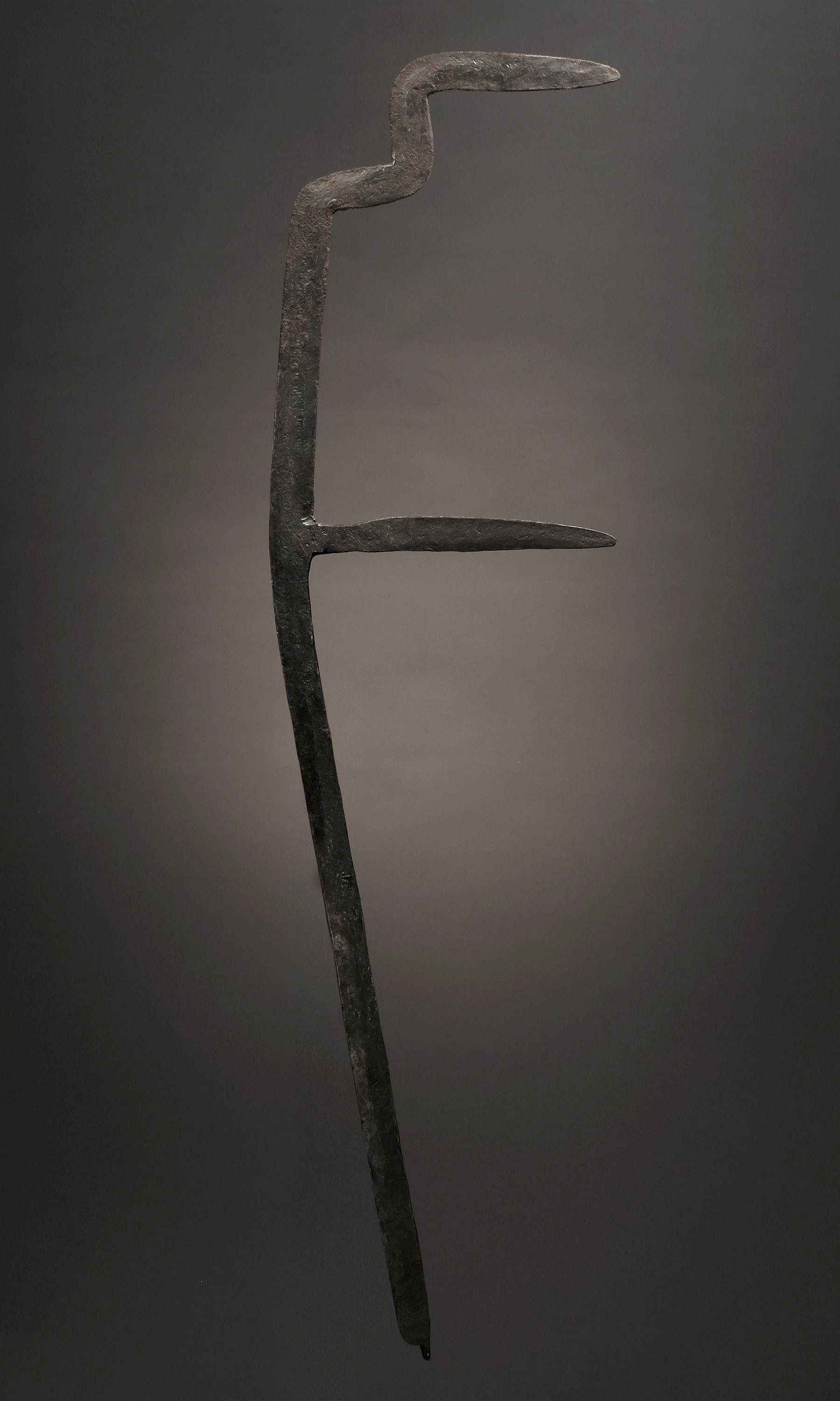 According to Norman Hurst, this distinctive blade represents naga-til, the 'male' form of a mythical couple of throwing knives, ngéégue being the female form (Ngola, 1997). The pair, known as miya-bo were highly revered and sacred relics, and even the king (Mbang, the guardian of the throwing knives) was said to be forced to resign his office if he acted without the authority of the miya-bo (Spring, African Arms and Armor, 1993).